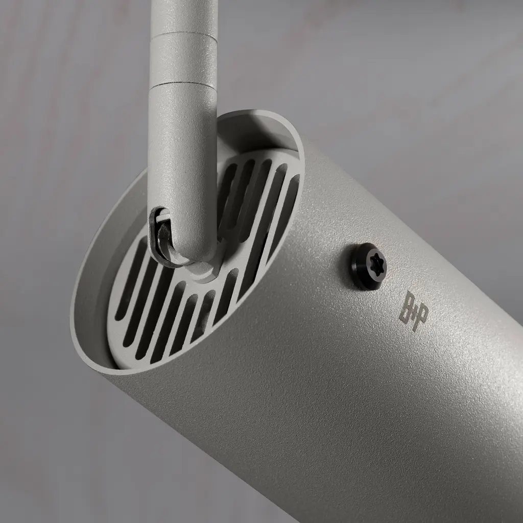 A track spotlight made from stone powder coated metal with solid gun metal detailing.