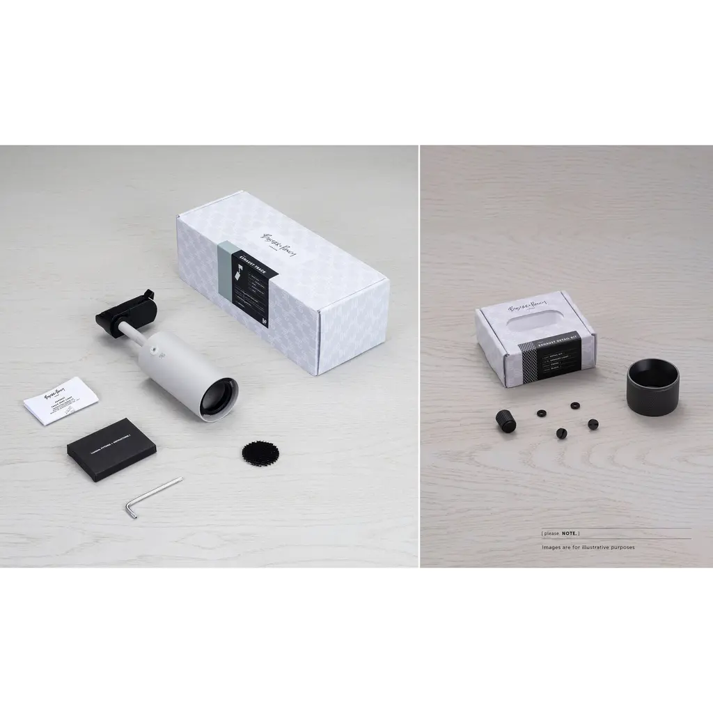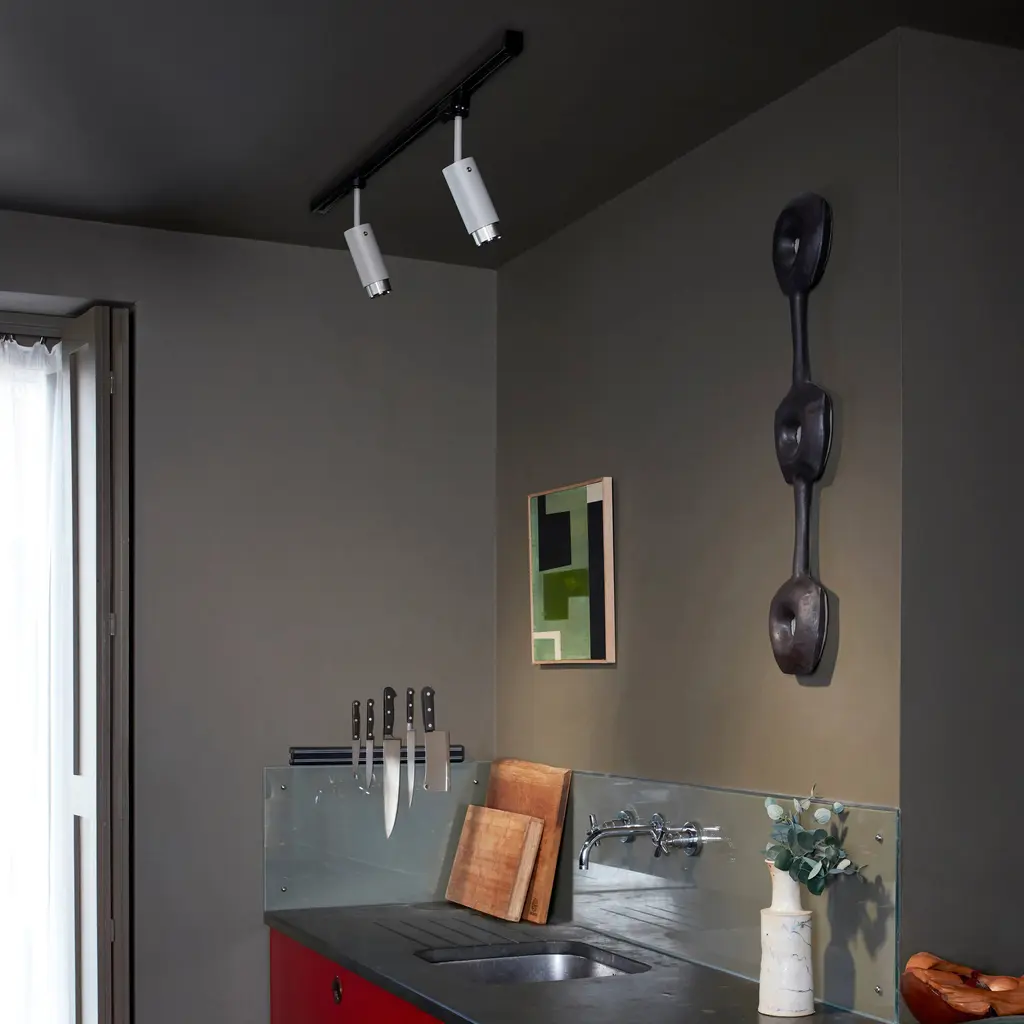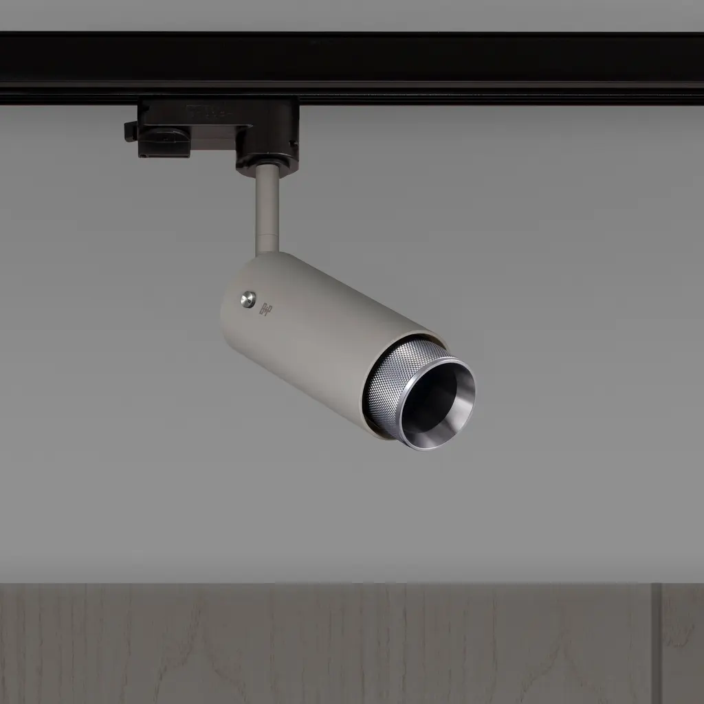A track spotlight made from stone powder coated metal with cross-knurled solid metal detailing.
