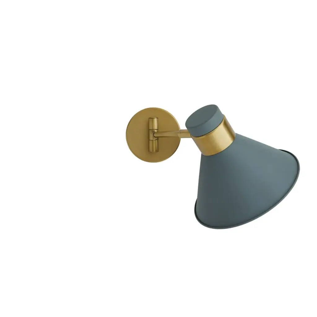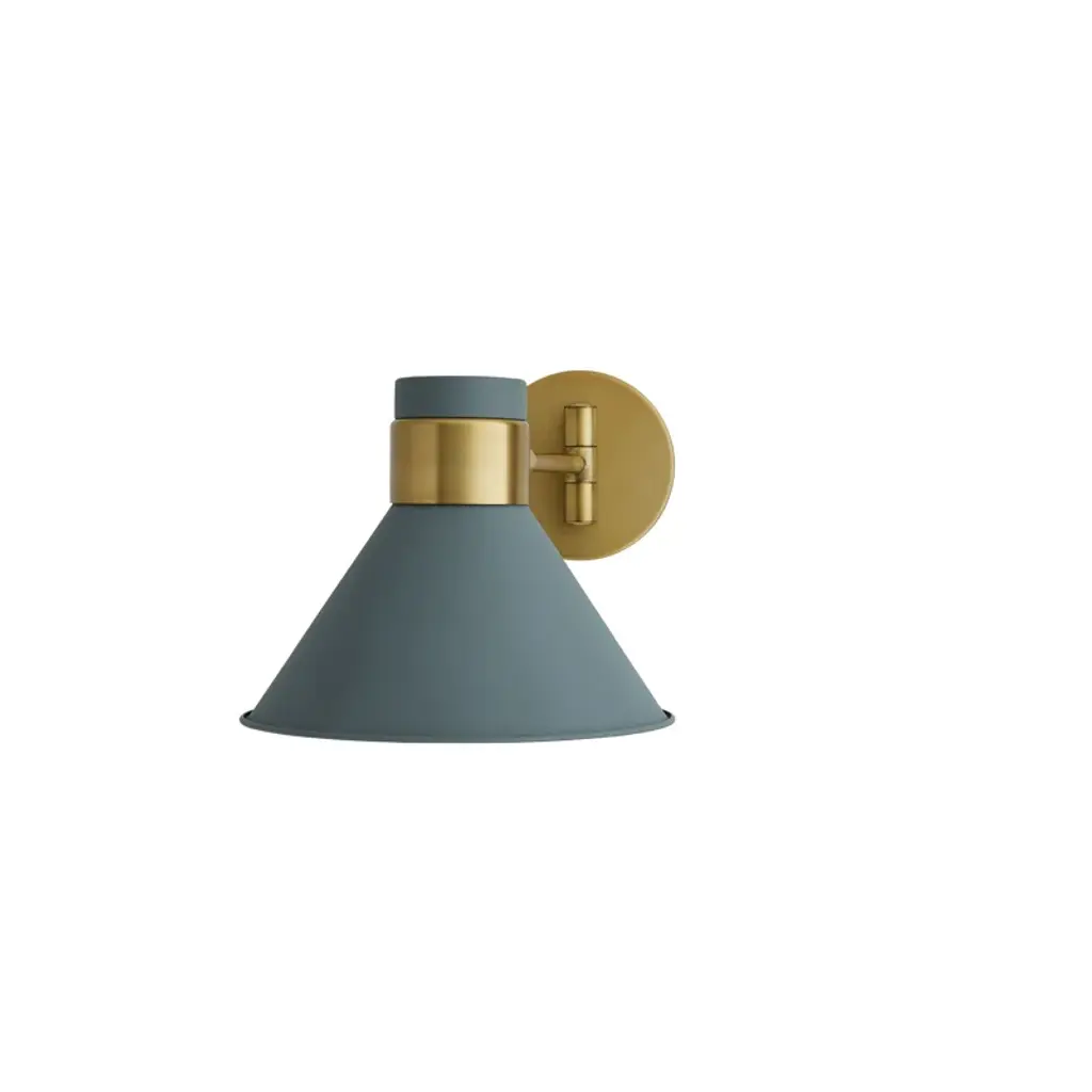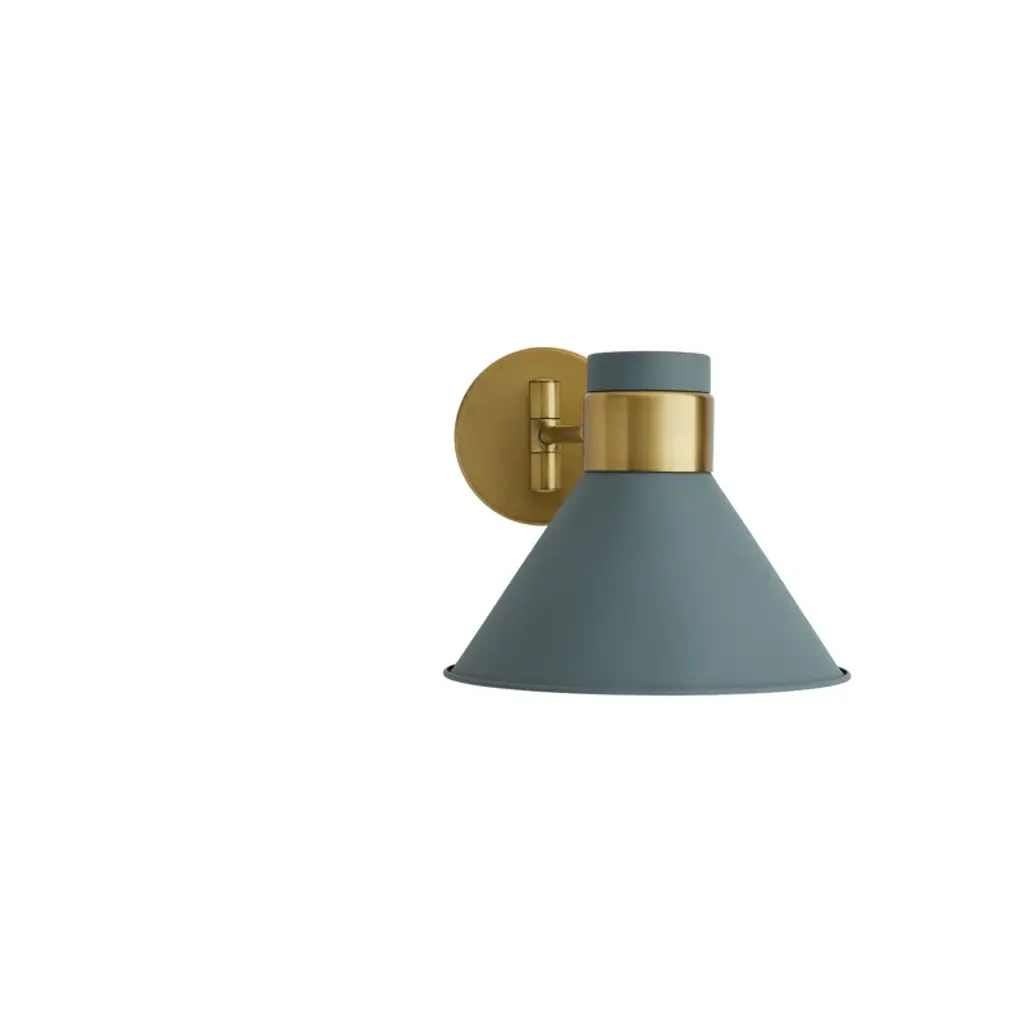 The Lane showcases a schoolhouse-inspired shade that delivers a retro yet modern look. An antique brass steel frame contrasts the taupe steel shade. The shade pivots allow the choice of light direction. Damp-rated, although limited covered outdoor areas may affect the finish.
