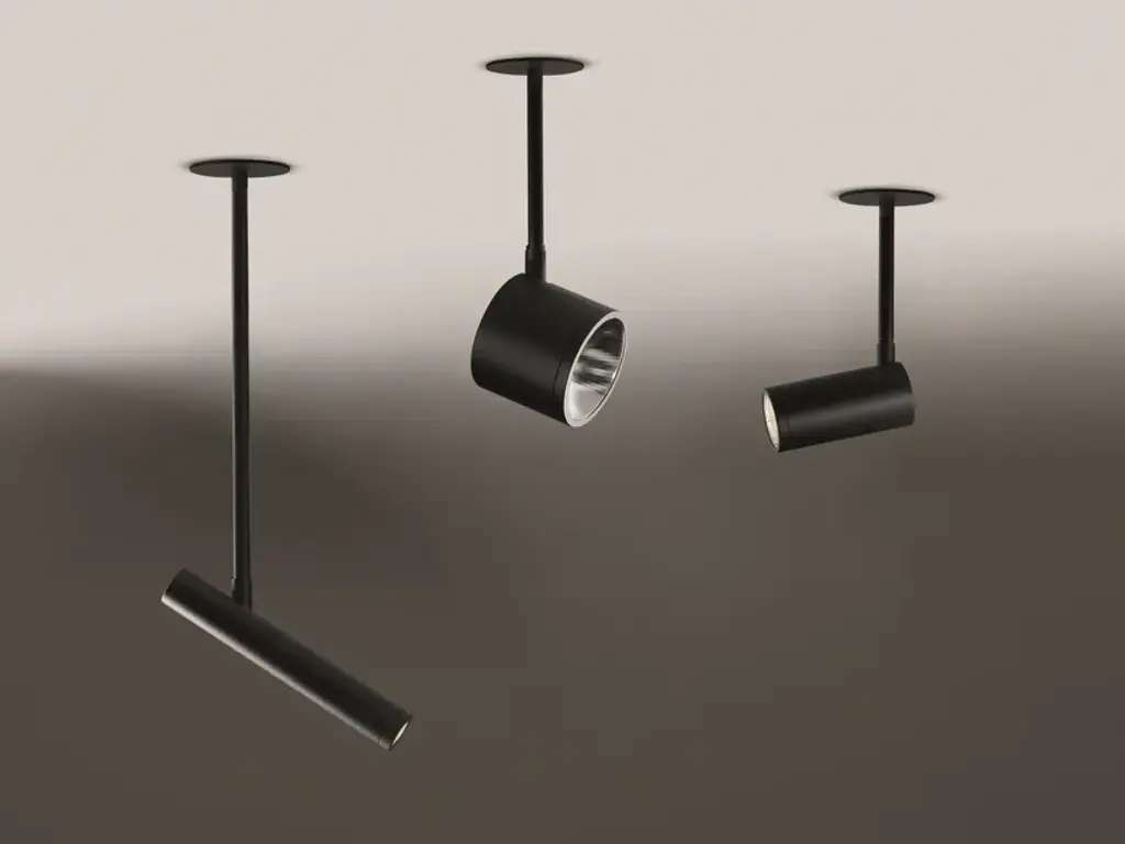 Small sized recessed spots made of black or white painted aluminum. Also available with GU10 bulb socket and in more finishes. Passive heat sink; 90° regulation on horizontal plan; 350° rotation on vertical axis; different beam and optics solutions; decorative and optic accessories; available light tones: 2700, 3000, 4000K; different rod lengths. Finish: White, Black