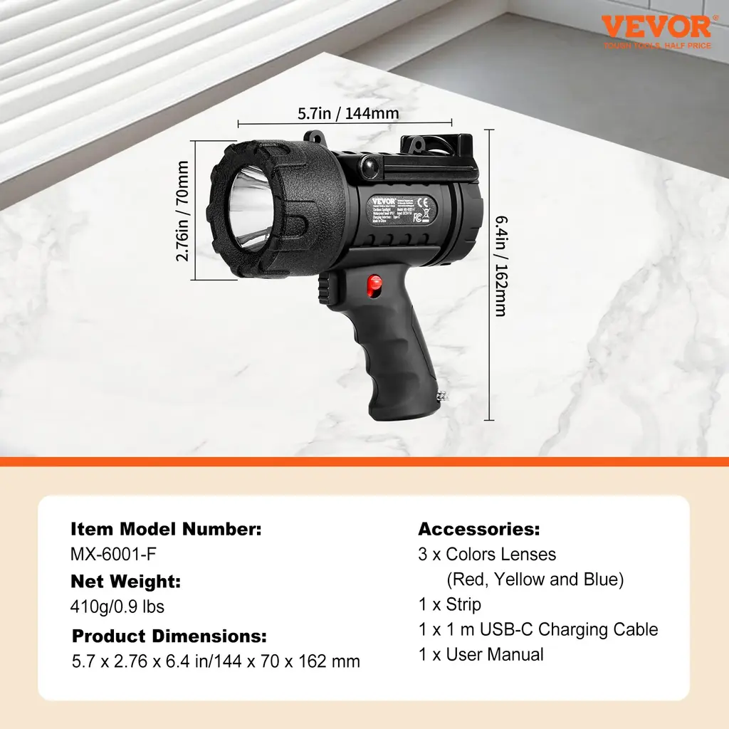 Rechargeable Cordless Spotlight: Experience the brilliance of our portable, cordless spotlight! For 1000,000 Lumens option: With an astounding 1,000,000 lumens and an impressive 440-meter beam distance, this LED spotlight flashlight is your ideal companion for outdoor adventures, emergencies, and everything in between. For 200,000 Lumens option: It features an astounding 200,000 lumens and an impressive 350-meter beam distance. Long-Lasting Illumination: Power on the go! Never be left in the dark! Our built-in 10,000 mAh battery (1000,000 Lumens option) / 5,000 mAh battery (200,000 Lumens option) ensures you have bright, reliable lighting when you need it most. Plus, our rechargeable spotlight doubles as a power bank, allowing you to charge your devices in emergencies. Keep an eye on your battery life with the handy blue indicator light on the side! Fast 4-Hour / 3-Hour Charging: Thanks to cutting-edge USB-C charging technology, you can fully recharge this handheld spotlight flashlight in just 4 hours (1000,000 Lumens option) / 3 hours (200,000 Lumens option)! Compatible with any USB charging port, you can power it up at home or in your car—making it easier than ever to stay ready for action. Spend less time waiting and more time enjoying bright light for all your adventures! Versatile Lighting Modes: Choose from 4 primary modes: Highlight, Medium Brightness, SOS Flashing, and High-Frequency Flashing. Plus, with 3 detachable color lenses (red, yellow, blue), you can tailor the light to suit any situation. Whether you're repairing, working, reading, or camping, our rechargeable spotlight has got you covered! IP67 Waterproof & Submersible: Built for the outdoors, our rechargeable spotlight boasts an IP67 waterproof rating. It can be submerged in water and even float back to the surface if dropped! Crafted with a robust ABS shell and silicone protection, it withstands impacts and is built to last, giving you peace of mind on all your excursions. Package Content 1 x Rechargeable Spotlight 3 x Color Lenses (Red, Yellow and Blue) 1 x Strip 1 x 1 m USB-C Charging Cable 1 x User Manual