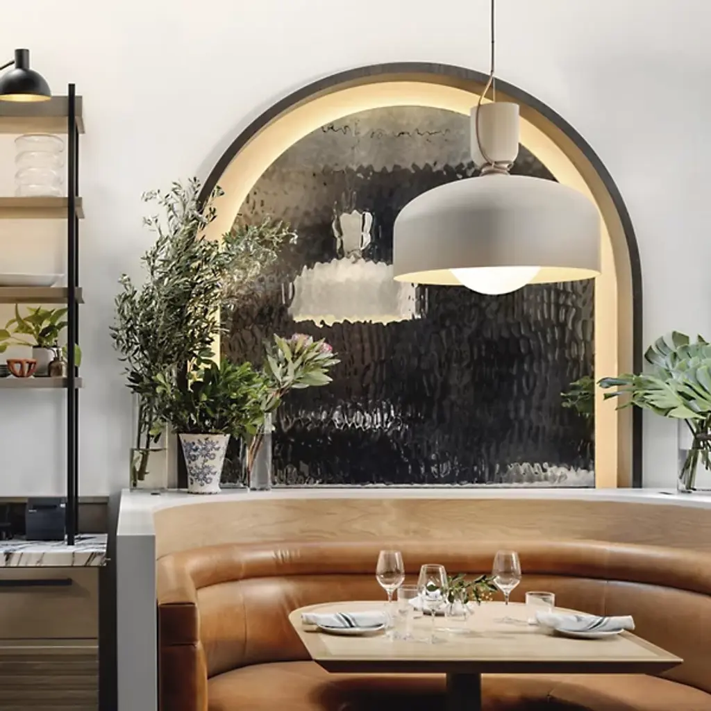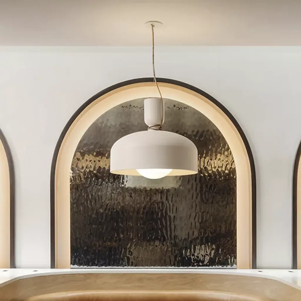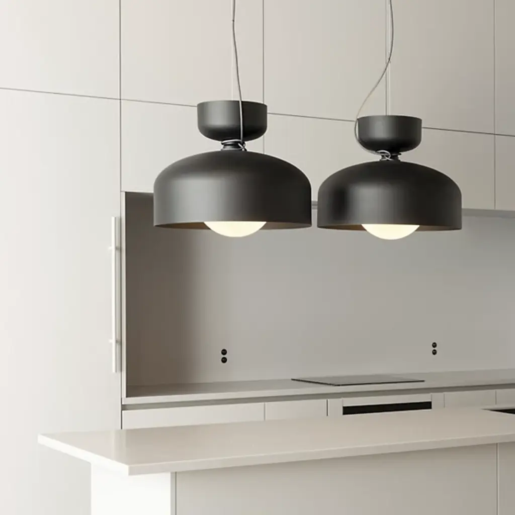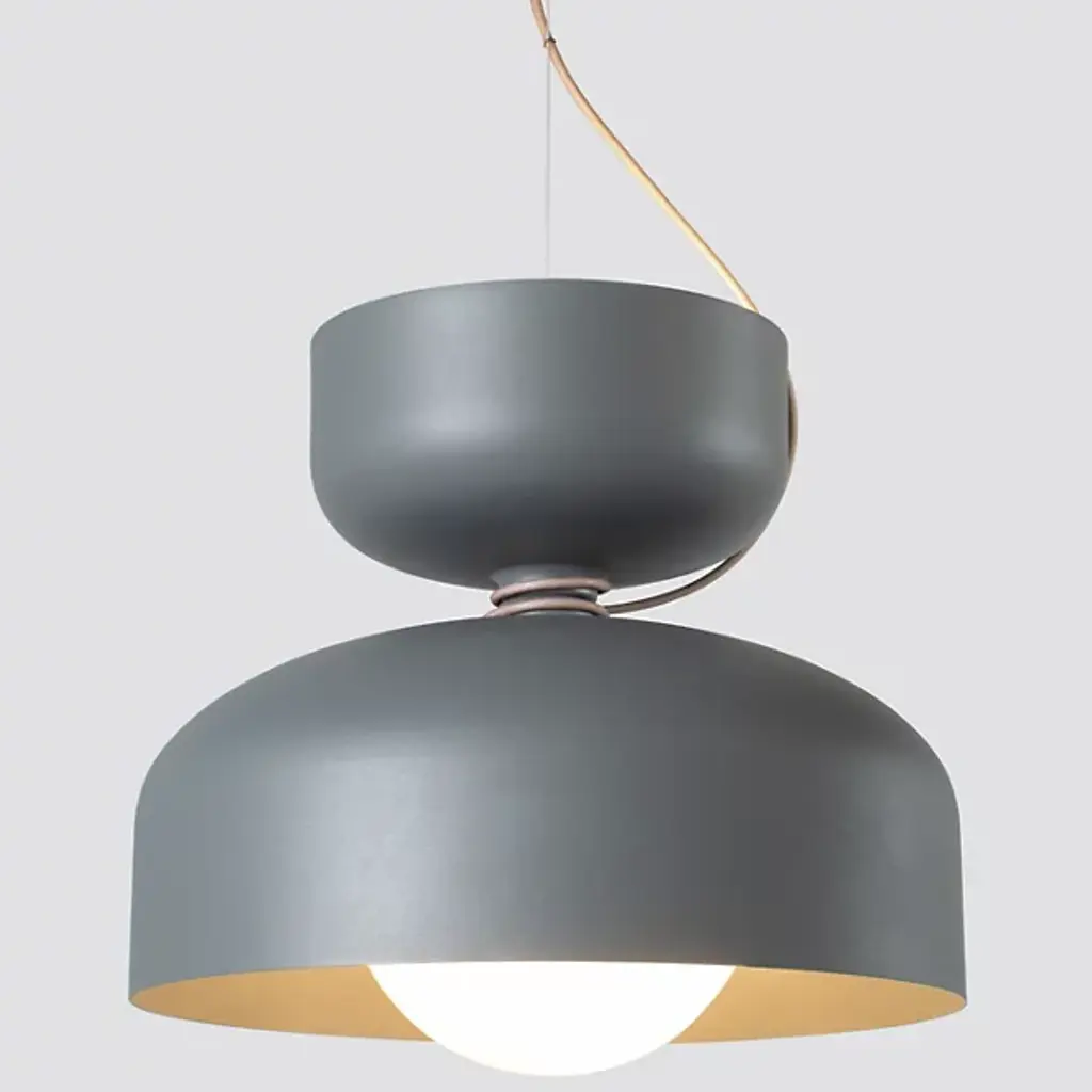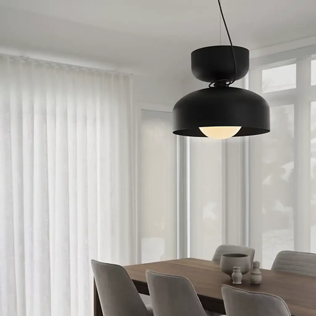 Put a spotlight on gathering areas or essential décor with the evocative modern design of Spotlight Volumes E Series Pendant by ANDlight. It's a refined design from the mind of Lukas Peet. The Spotlight family combines a variety of shade profiles to create an asymmetric yet visually balanced silhouette. A low-profile canopy and single wire support bright LED lamping hanging below. A curve-topped drum shade covers the lamping with a smaller inverted drum resting above for elegant contrast. Inspired by the classic spotlight, the piece casts a direct downlight while reflecting a rich ambiance below.
