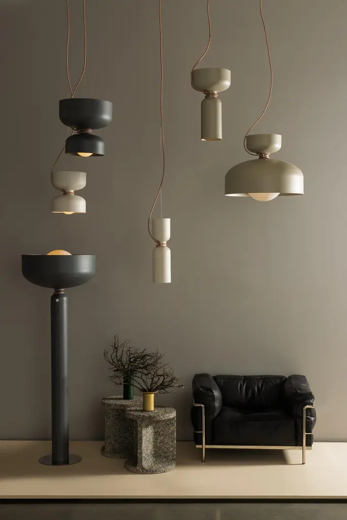 Spotlight Volumes, floor lampDesign: Lukas Peet, Editor: AND LightModel shown: ECompositions– Up light: A, B, C, D or EFloor Lamp: The Spotlight Volumes Floor Lamp shows five unique spun aluminum shade profiles that range from wide to narrow, creating various distinct combinations. Its classic silhouette is complementary to any space as it expresses symmetry, balance, and proportionate form. Each lamp comes with an energy-efficient dimmable LED light bulb and glass globe.The electrical cord wraps and knots around the fixture under the top shade, to delineate the point of connection between the two elements. A weighted base is lined with felt for smooth contact with any surface.Materials: Spun aluminum shade– Input Voltage: 110–120V, 220–240V– Lamping:1 x E26/E27 (Max 16W) Socket16W 2700K A21 Dimmable LED Lamp Included (120V version only) 140mm/5.5” Glass Globe for A Shade 175mm/7” Glass Globe for B Shade 300mm/12” Glass Globe for E Shade– Controls:Hand dimmer switch includedFinishes– Sage– Avocado– Vanilla– Black.