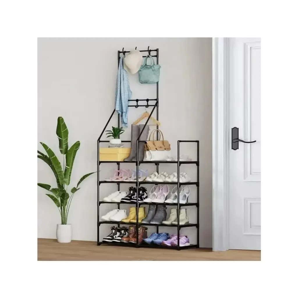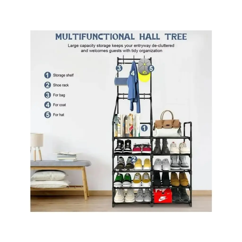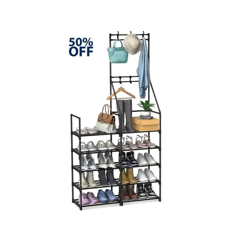 5 Tiers Sturdy Shoe Rack, 20 Pairs Shoe Rack Organizer, 3-in-1Shoe Rack & Coat Rack, Space-Saving Shoe Rack for Closet, Non-Woven Fabric Shoe Shelf. The Shoe Rack Organizer Is Both Multi-Functional And Practical, As It Provides A Compact, Space-Saving Solution For Storing Your Footwear, And Can Be Used To Hold Other Items As Well. The 5 Tiers Upper Shelf Is Convenient For Hanging Hats, Clothes And Other Items. It¡¯S Ideal For Apartment, Dorm Room And Other Small Space. This Is The Perfect Combination Of Shoe Rack, Coat Rack And Other Small Items Storage Organizer. No Need To Mount On The Wall, No Damage To Your Wall.Shoe Rack for Entryway/ Coat Rack / Shoe Rack / Shoe Organizer/ Coat and Shoe Rack/ Shoe Rack with Coat Hanger/Shoe Rack Entryway/Entryway RackSpecification:Type: Multifunctional Coat RackRoom Type: ClosetNumber of Shelves: 5Product Dimensions: 12.2"D x 33"W x 69"HInstallation Type: FreestandingItem Weight: 4.36 poundsAssembly Required: YesTips: When installing the shoe hat rack, please make sure that all parts are tightly pressed without leaving any space. And it would be more steadier if you put the heavy objects at the bottom layer.This shoe rack also includes two extra tiers equipped with hooks for hanging hats, coats, or other accessories. This convenient feature allows you to optimize your storage options and keep your closet clutter-free.The hangers can be quickly assembled according to the instructions and the parts provided. Simply wipe the surface of the hanger with a cloth.