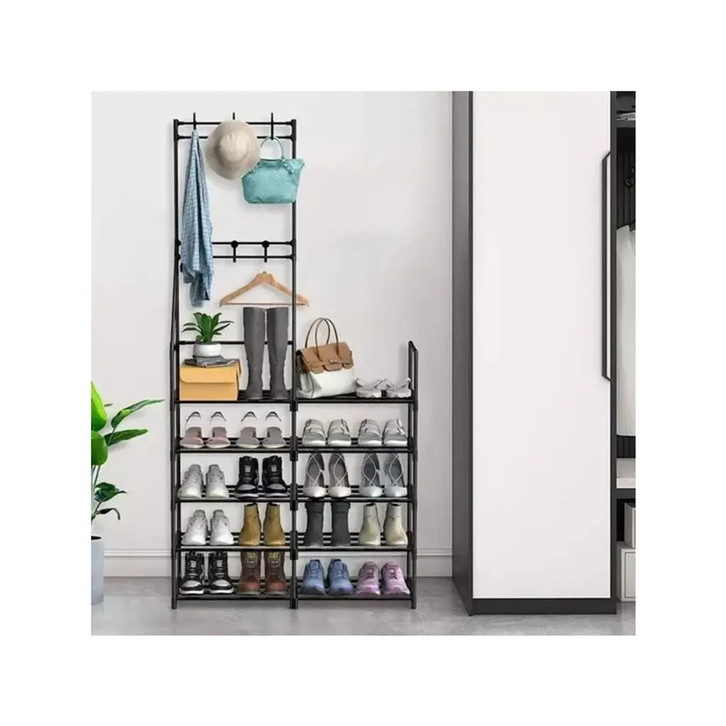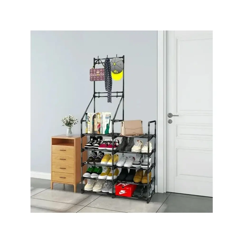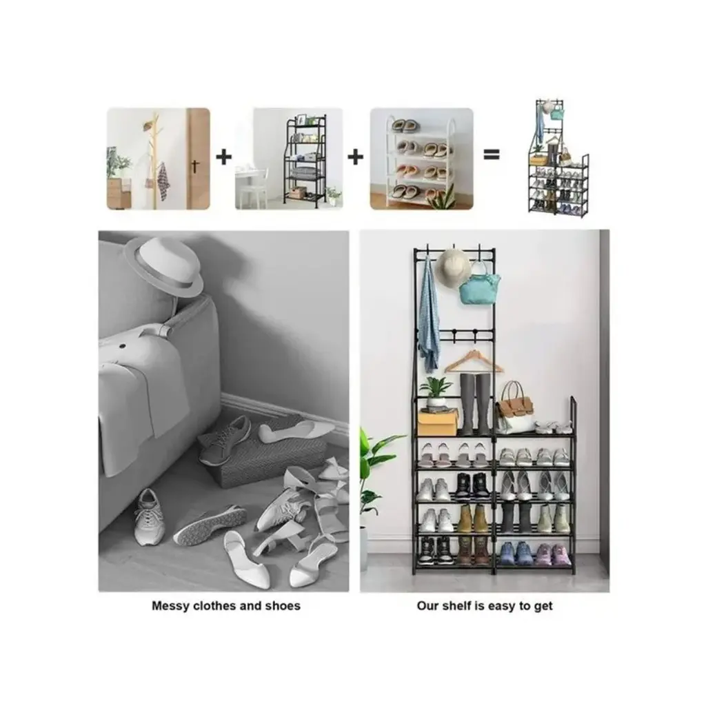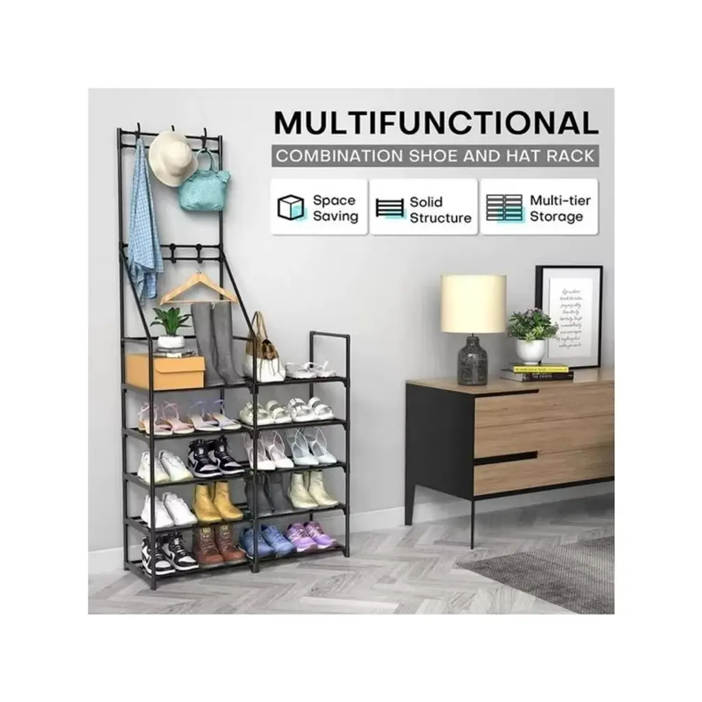 5 Tiers Sturdy Shoe Rack, 20 Pairs Shoe Rack Organizer, 3-in-1Shoe Rack & Coat Rack, Space-Saving Shoe Rack for Closet, Non-Woven Fabric Shoe Shelf. The Shoe Rack Organizer Is Both Multi-Functional And Practical, As It Provides A Compact, Space-Saving Solution For Storing Your Footwear, And Can Be Used To Hold Other Items As Well. The 5 Tiers Upper Shelf Is Convenient For Hanging Hats, Clothes And Other Items. It¡¯S Ideal For Apartment, Dorm Room And Other Small Space. This Is The Perfect Combination Of Shoe Rack, Coat Rack And Other Small Items Storage Organizer. No Need To Mount On The Wall, No Damage To Your Wall.Shoe Rack for Entryway/ Coat Rack / Shoe Rack / Shoe Organizer/ Coat and Shoe Rack/ Shoe Rack with Coat Hanger/Shoe Rack Entryway/Entryway RackSpecification:Type: Multifunctional Coat RackRoom Type: ClosetNumber of Shelves: 5Product Dimensions: 12.2"D x 33"W x 69"HInstallation Type: FreestandingItem Weight: 4.36 poundsAssembly Required: YesTips: When installing the shoe hat rack, please make sure that all parts are tightly pressed without leaving any space. And it would be more steadier if you put the heavy objects at the bottom layer.This shoe rack also includes two extra tiers equipped with hooks for hanging hats, coats, or other accessories. This convenient feature allows you to optimize your storage options and keep your closet clutter-free.The hangers can be quickly assembled according to the instructions and the parts provided. Simply wipe the surface of the hanger with a cloth.