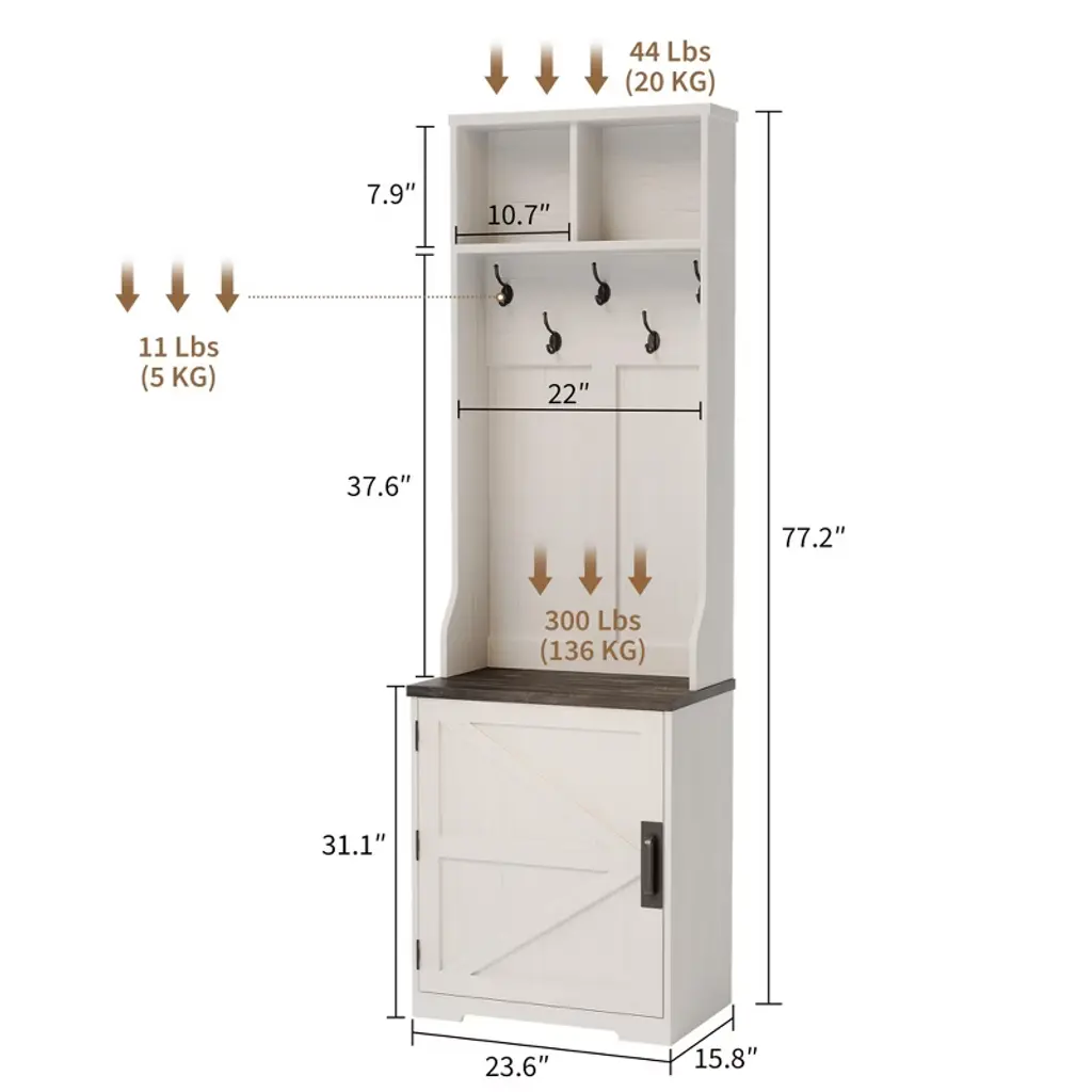 Modern Farmhouse Coat Rack Freestanding, 77" Hall Tree with Shoe Storage Cabinet, 5 Hooks & 2 Open Cubbies, Space Saving Entryway Furniture for Hallway, Living Room, Mudroom
