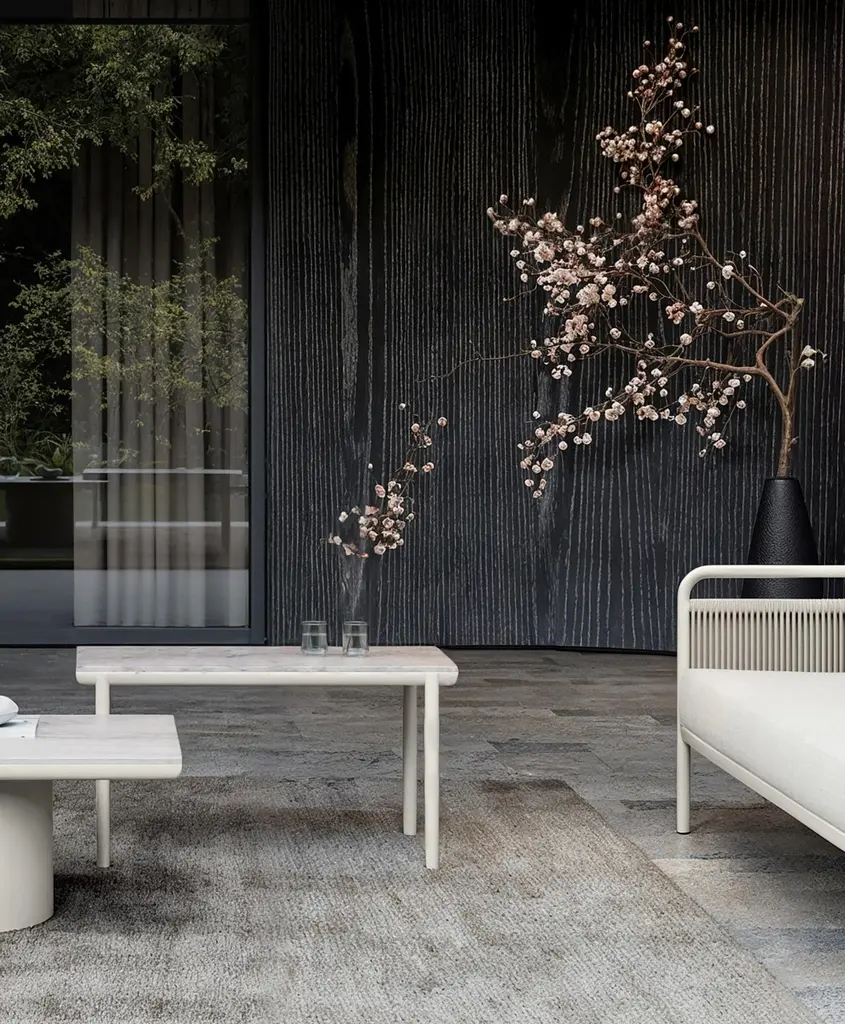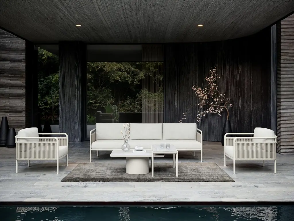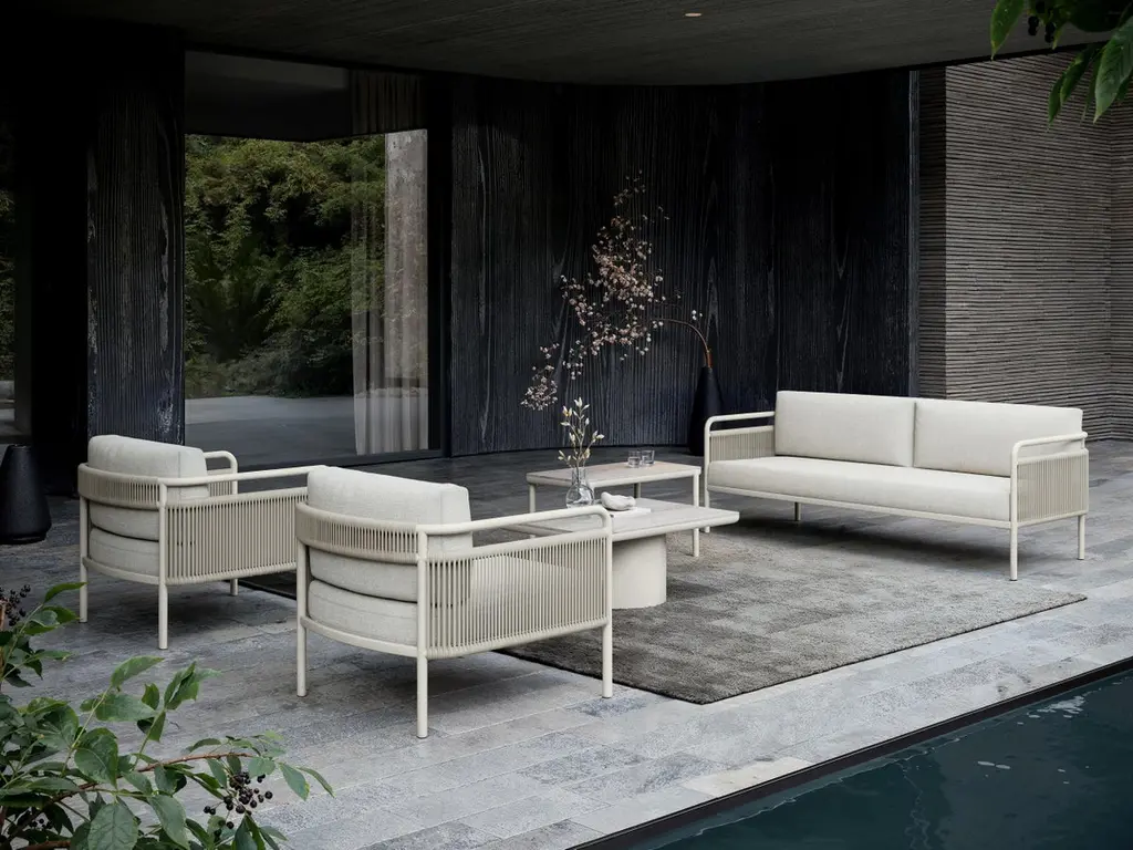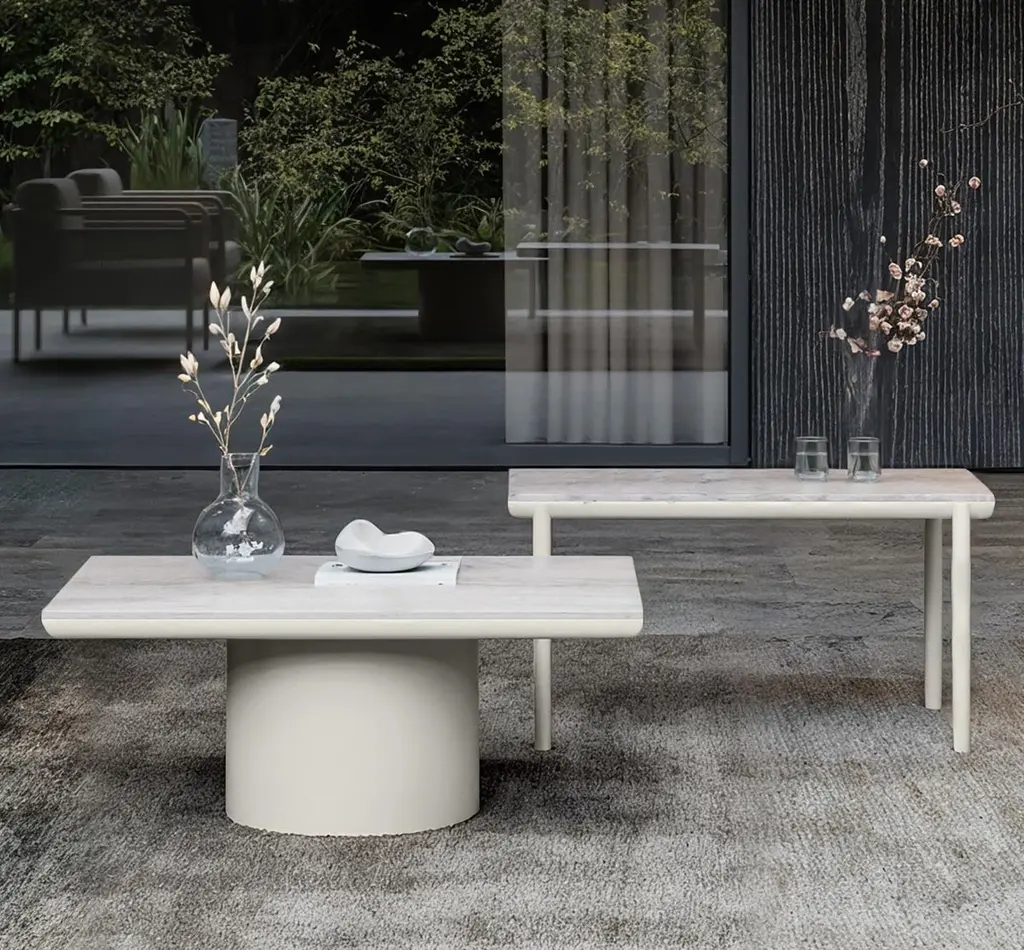 Link-Bisque Sintered Stone And Powder-Coated Aluminum Coffee Table by SNOCDimensions: D 43 x W 84 x H 45 cm. Materials: Aluminium and sintered stone.Link-BisqueWhen designing the Link collection, Junpei and Iori Tamaki envisioned how multiple pieces placed together would create a link and how that connection would evolve in various ways.To express Link, Junpei & Iori Tamaki believed that a design with both simplicity and distinctive, memorable features was necessary. For the central pieces of the collection, such as chairs and sofas, Junpei & Iori Tamaki adopted a design that emphasizes the contrast between the parts wrapped with rope and those without, set against a simple frame structure. This contrast creates a beauty in the balance of roughness and refinement.SnocSince their foundation in 2004, SNOC’s history has been interwoven with that of international design. Each chapter written with care, each product reflecting its passion. The company understands that a real story exists behind each object and behind that story, a real person desiring something more. Their ever-developing methodology focuses on defining the core of a brand and utilizing those characteristics to help nurture its soul, aiding in forging real connections. This approach , results in their unique “work in progress” style: original, versatile solutions that in their signature blend of sound, vision and design best-suit every environment and situation, arousing a range of emotions on a daily basis as well as standing the test of time.Driven by functional research, an inclusive project and product culture, and deep care for the environment, we exist as the timeless yet present essence of outdoor furniture design elevating private and public space a like with thoughtfully presented, endlessly adaptive creations.