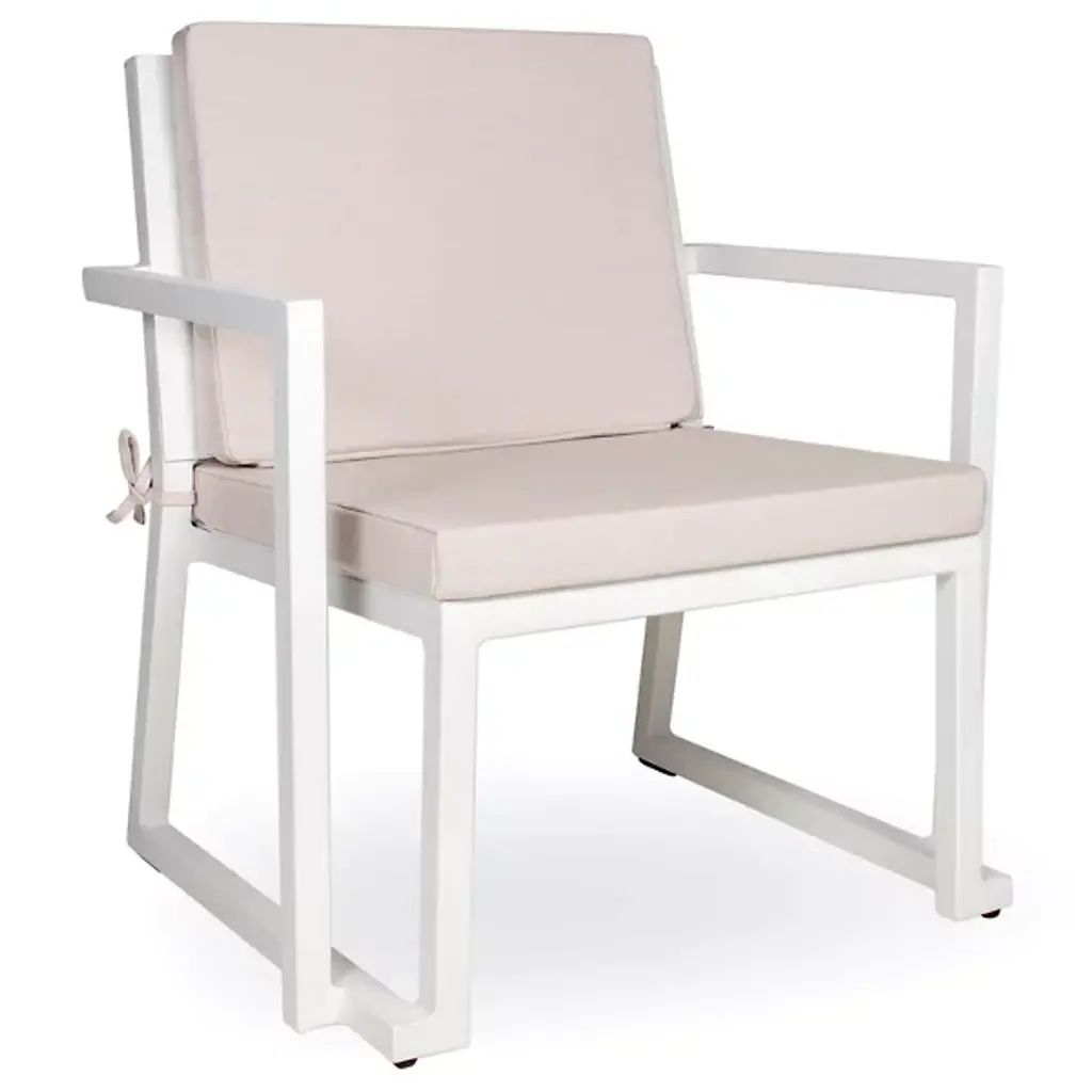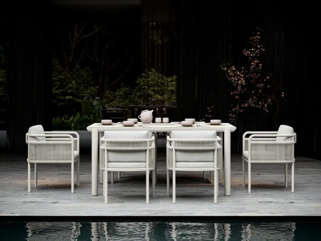 Link-Bisque Wicker, Fabric And Powder-Coated Aluminum Dining Chair by SNOCDimensions: D 59 x W 63 x H 69 cm.Materials: Aluminium, wicker, and Luminesce fabric. Link-BisqueWhen designing the Link collection, Junpei and Iori Tamaki envisioned how multiple pieces placed together would create a link and how that connection would evolve in various ways.To express Link, Junpei & Iori Tamaki believed that a design with both simplicity and distinctive, memorable features was necessary. For the central pieces of the collection, such as chairs and sofas, Junpei & Iori Tamaki adopted a design that emphasizes the contrast between the parts wrapped with rope and those without, set against a simple frame structure. This contrast creates a beauty in the balance of roughness and refinement.SnocSince their foundation in 2004, SNOC’s history has been interwoven with that of international design. Each chapter written with care, each product reflecting its passion. The company understands that a real story exists behind each object and behind that story, a real person desiring something more. Their ever-developing methodology focuses on defining the core of a brand and utilizing those characteristics to help nurture its soul, aiding in forging real connections. This approach , results in their unique “work in progress” style: original, versatile solutions that in their signature blend of sound, vision and design best-suit every environment and situation, arousing a range of emotions on a daily basis as well as standing the test of time.Driven by functional research, an inclusive project and product culture, and deep care for the environment, we exist as the timeless yet present essence of outdoor furniture design elevating private and public space a like with thoughtfully presented, endlessly adaptive creations.