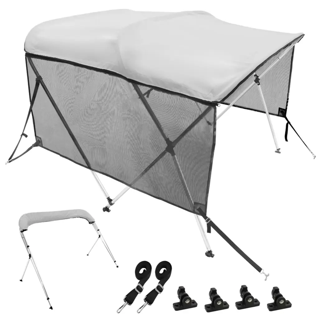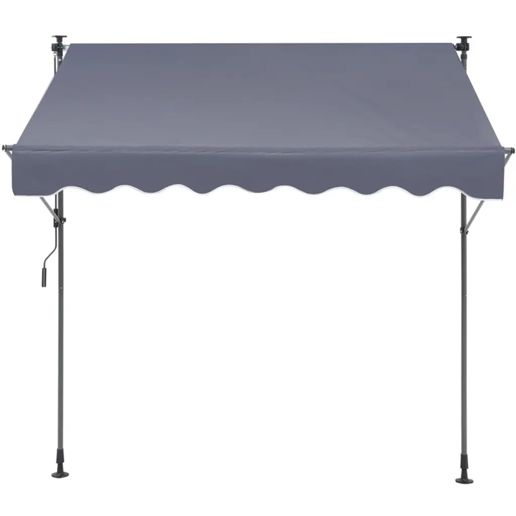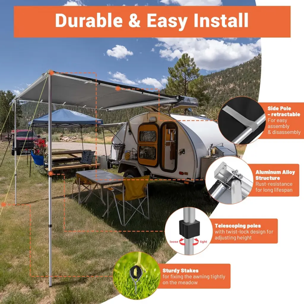 Features:- Compatibility - 8 1/6 x 6 7/12 ft Car Side Awning offers 54 sq. ft large shading area for outdoor activities, fit for most vehicles with rooftop rails and compatible with rail width less than 3 3/8";, distance between rail and roof more than 13/16";, and the space of mounting 2 brackets more than 39 3/8"; in length- Anti-UV & Water Resistant - Upgraded with PU-coated ripstop polyester for up to 2000mm water-resistance and UV50+ protection, this awning gives you a cozy shelter from harmful sun rays and unexpected drizzles- 2-Way Installation - Vehicle awning attaches to a roof rack or roof rails on the vehicle. You can install the awning on the side or rear of vehicle, with height adjustable standing poles to fit different cars; Twist-lock design of telescoping poles help extend the poles quickly, enabling fast setup of awning within minutes- Semi-Automatic Retractable Awning - Features motorized roller tube for effortlessly retracting the awning without the hassle of manual folding, easy to disassemble and store it in the bag for your next journey- Sturdy & Stable - Aluminum alloy structure with high-quality 304 stainless steel brackets for rust-resistance and sturdiness, along with pegs and guy ropes for ensuring stability in different weathers for camping, picnics, or other outdoor activities. Specifications:- Unfolded Overall Dimension(LxWxH) 78 3/4" x 98 7/16" x 84 5/8"- Adjustable Height 45 1/4"to 84 5/8"- Guy Rope Length 118 1/8"- Distance Between Roof Rail & Car Roof ≥13/16"- Compatible Rail Width ≤3 3/8"- Space of Mounting 2 Brackets ≥39 3/8"- Material Aluminum Alloy Frame, 300D Ripstop Polyester- Net Weight 18.4 LbsPackage Contents:- 1x Awning- 2x Guy Ropes- 2x Sets of Mounting Brackets- 4x Pegs- 4x M8x25 Bolts and M6x55 Bolts- 4x M6 Nyloc Nuts / M8 Nyloc Nuts- 2x Wrenches and Stakes- 1x Manual