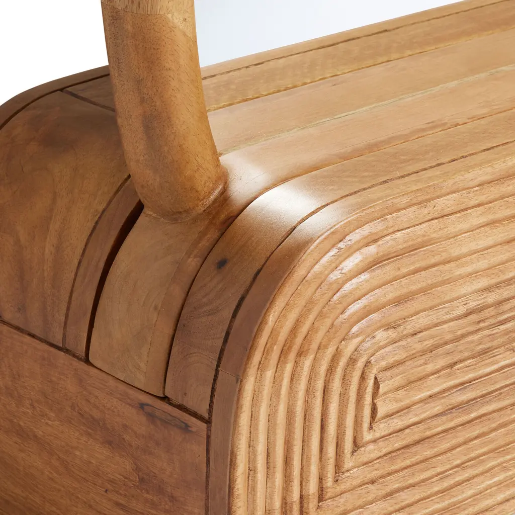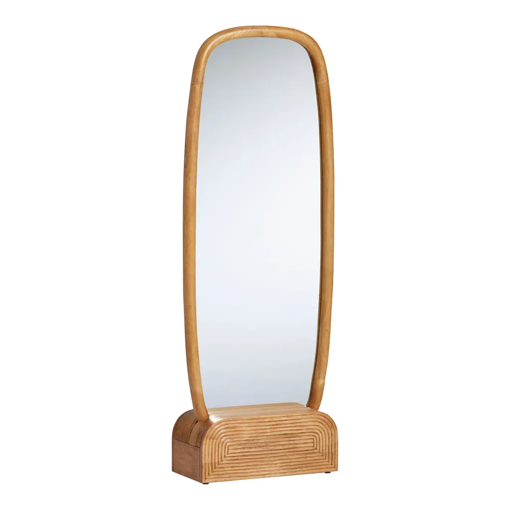 Cast a unique reflection with our arched wood full-length mirror designed to sit in a carved wooden base with intricate line detailing. Easy to assemble and move from room to room, this versatile mirror brings new life to bedrooms, guest rooms and living spaces. With its natural, warm finish and welcoming rounded shape, this mirror is sure to be a centerpiece wherever it's placed.