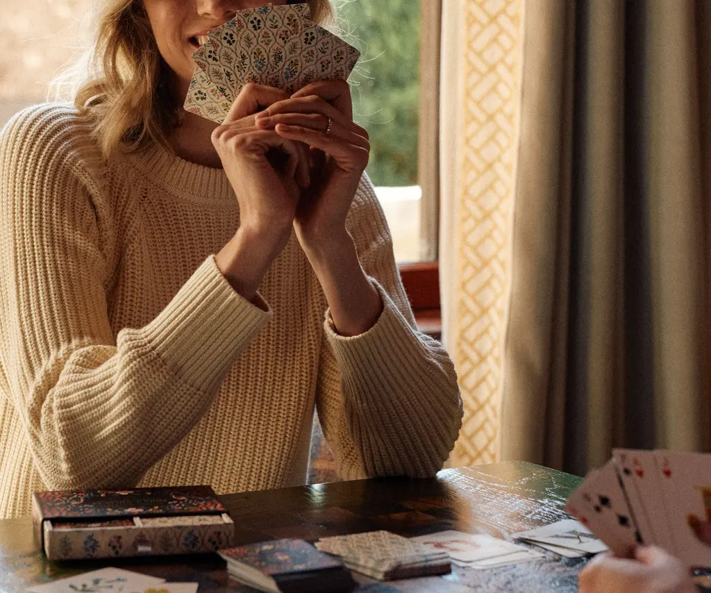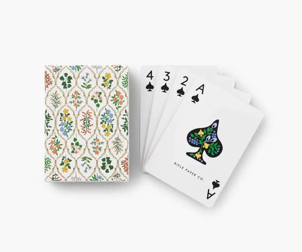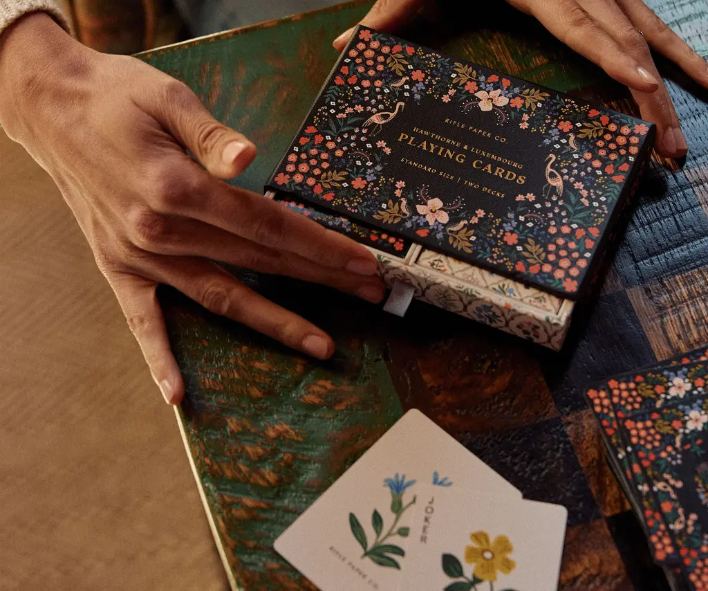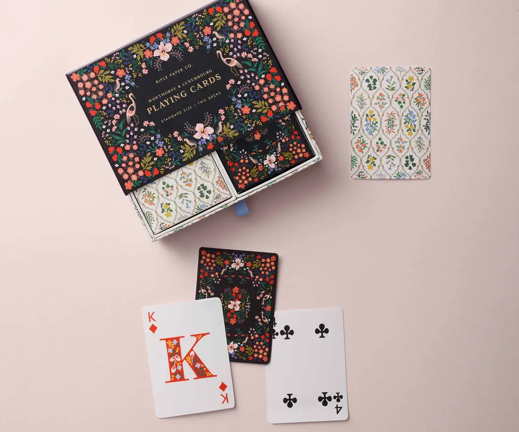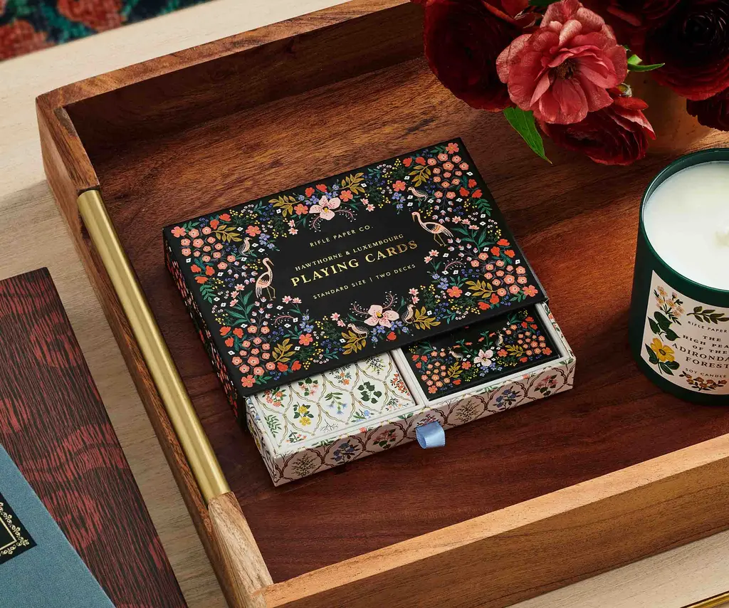 A set of two standard playing card decks in a decorative keepsake box with gold foil and a ribbon pull tab. All cards feature full-color illustrations with added decoration on all face cards and jokers. The decks include 56 standard cards, and are produced by the United States Playing Card Company.