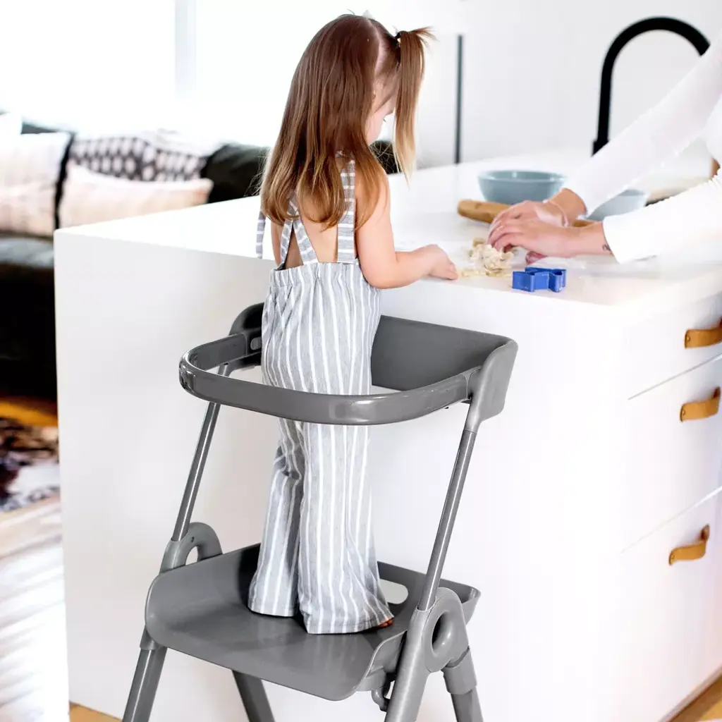 THE TOWER OF POWER.A sleek answer to your toddler’s “Let me try!” demands, the Boon PIVOT Toddler Tower gives you an easy way to give your curious child a view of the action. This toddler kitchen step stool brings them up to the right height and lets you encourage them to learn about cooking, baking and more. Unlike other toddler towers that get in the way, PIVOT folds flat and tucks away easily so it won’t trip you up when not in use. And with a lightweight design, you can move it over to the kitchen sink to get those sticky hands clean. PIVOT is designed for toddlers ages 18 months to 4 years old, with a weight limit of up to 50 pounds. With the PIVOT learning stool, next time your kid says, “Let me try!” you’ll be ready."