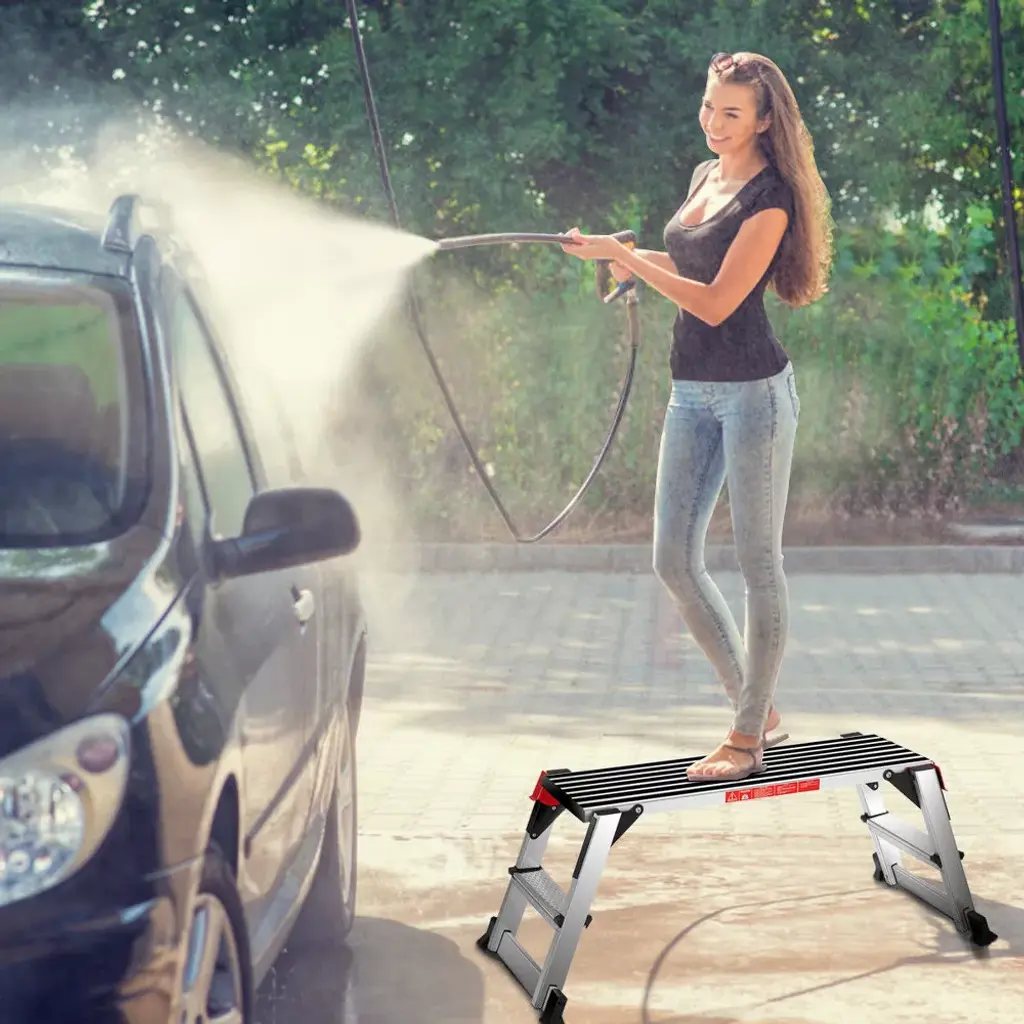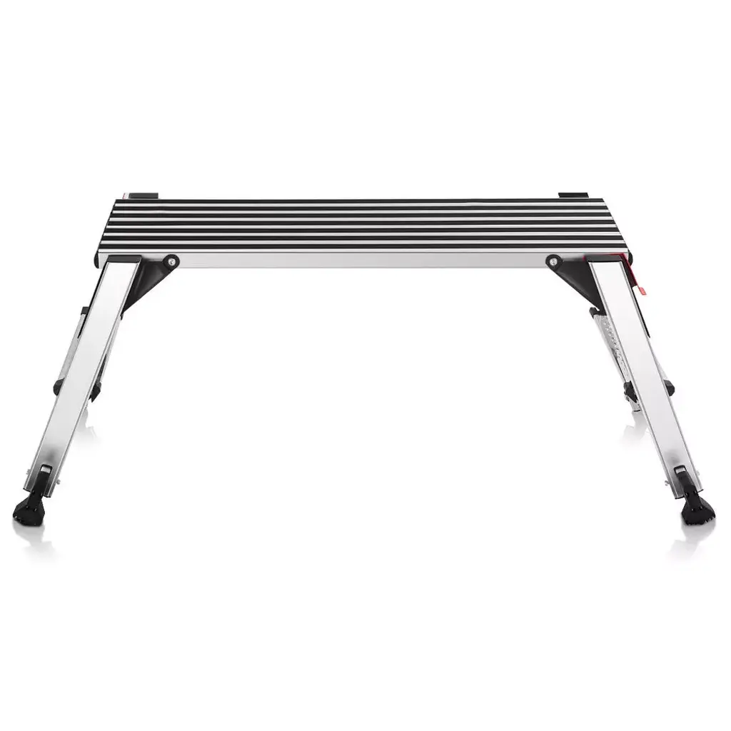 This is our foldable work Platform, which is ideal for any task around the kitchen, office, bathroom, and garage. Whether it's reaching a high cabinet, changing the light bulb or washing the windows, our products make it easier to get any job done. This lightweight step stool provides security to any job. The contemporary design fits for many of today's kitchens. There are four non-slip thick rubber pad on the bottom of four legs, providing safety when you using it. It will be very simple to storage and transport owing to its folding and lightweight features. Don't hesitate to buy it nowFeaturesFour non-slip rubber pads on the bottom of four legs for safety using Offer large platform for comfortable and safe Heavy duty aluminum construction, sturdy and safeFolding and lightweight features for easy storage and transportLock and open system for easily open and foldPerfect for little height in the home, office, bathroom, garageGood for changing bulbs, washing windows and so onMaterial: AluminumOpen dimension: 49.5''W x21''D x19.5''HFolding dimension: 15''W x8''Thickness x39''HNet weight: About 18LbsWeight capacity: 330LbsPackage includes: 1 x Folding Work Platform
