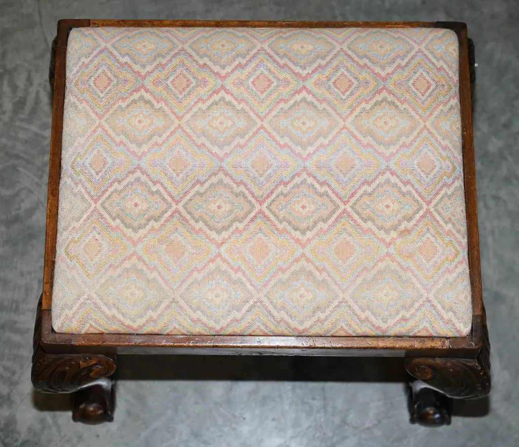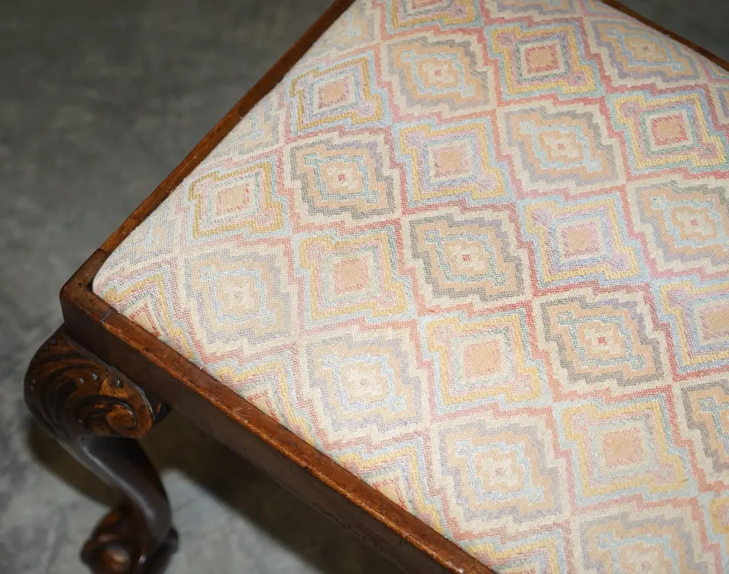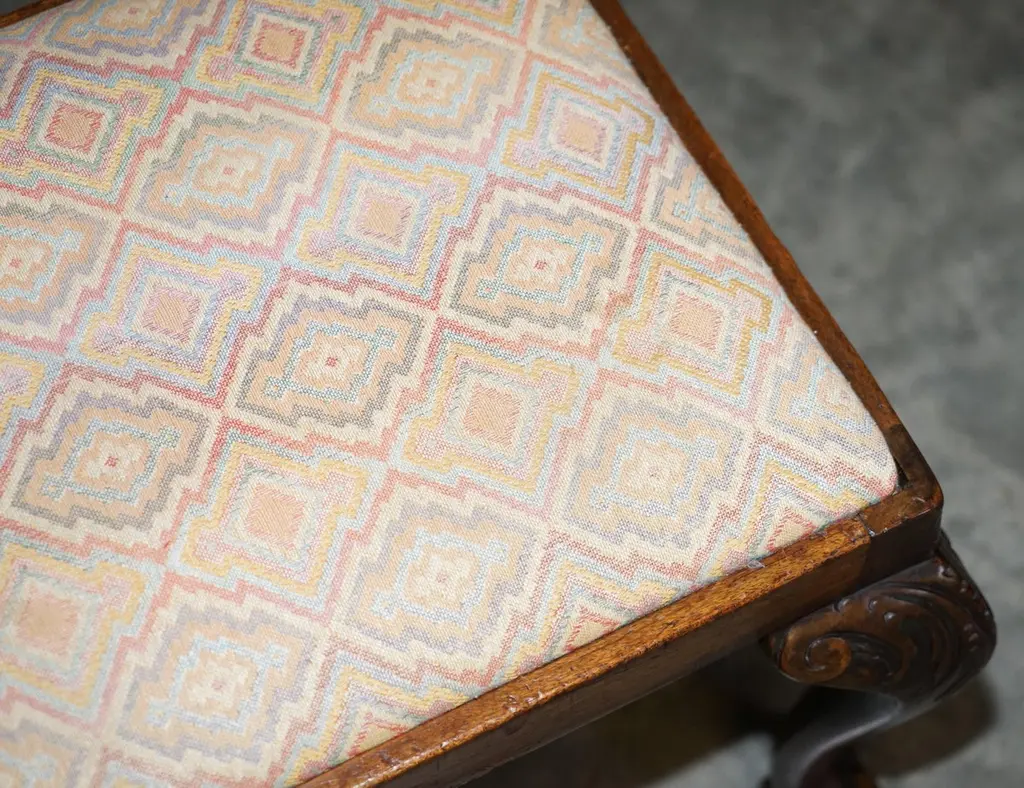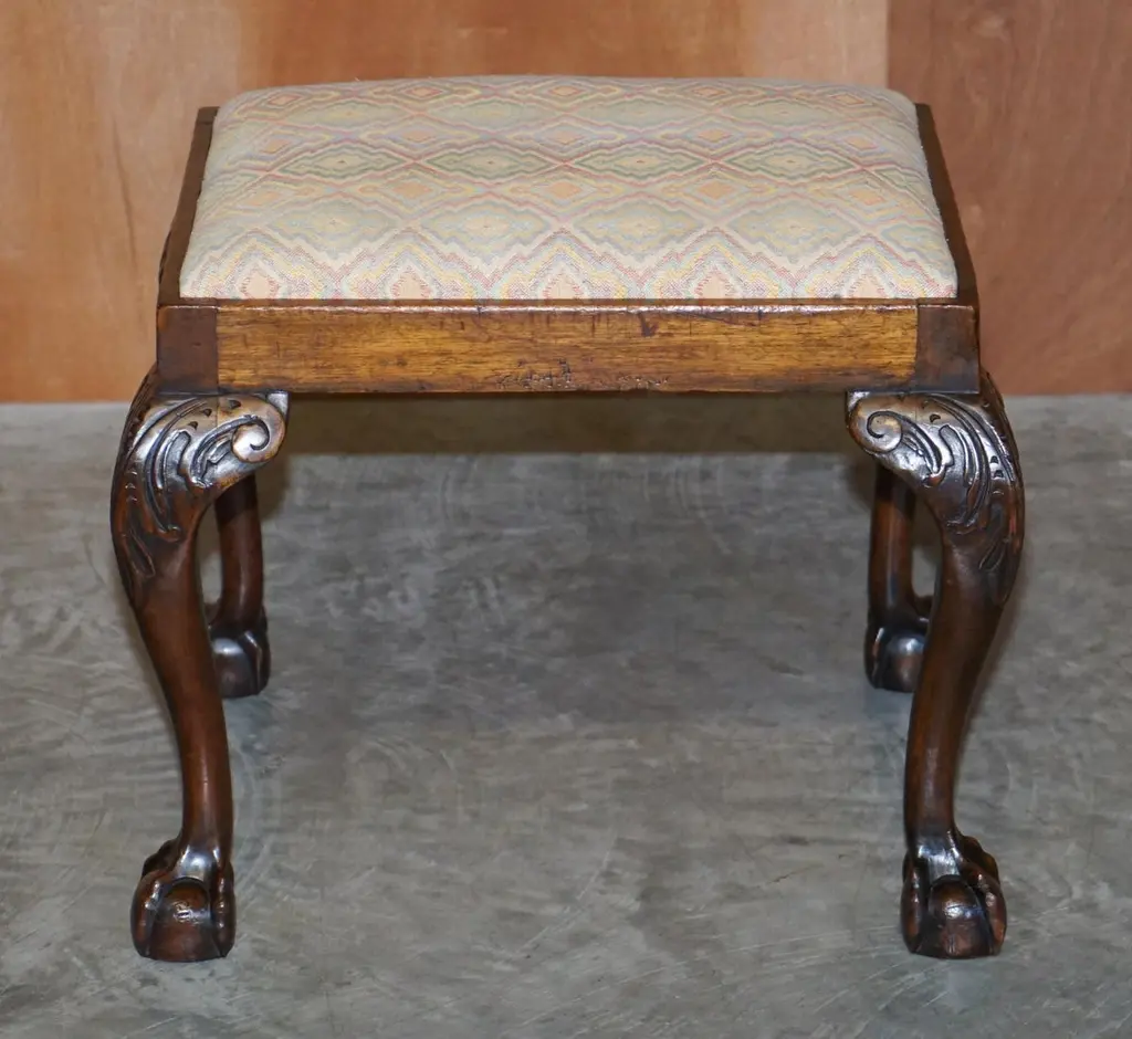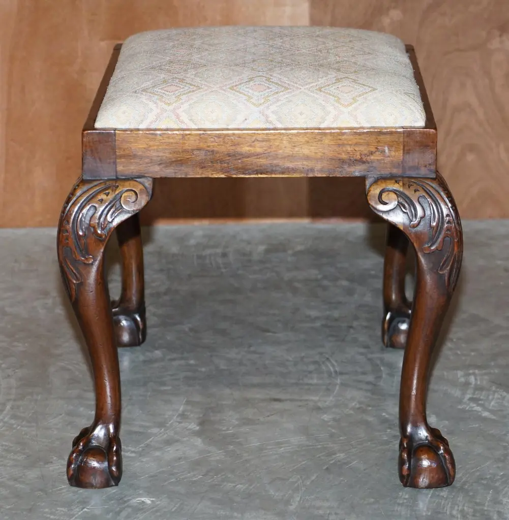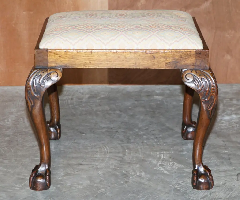 We are delighted to offer this sublime circa 1780 George II and later walnut stool with ornately carved legs and Claw & Ball feetThis piece is a very good looking well made and decorative stool with a glorious timber patina. It is just over 240 years old, in that time, I'm sure its had some alterations and repairs, I can see traces of old worm which have been treated as a matter of recourse. Otherwise it is a very fine example indeed This piece is expertly hand carved, the timber patina is to die for, its pure art furniture that functions perfectlyWe have cleaned waxed and polished it from top to bottom, there will be age and use related patina marks all over DimensionsHeight:- 49.5cmWidth:- 59cmDepth:- 49cmPlease note all measurements are taken at the widest pointThis item is available for collection from our Pulborough warehouses RH20 1DF.ConditionPlease view the very detailed pictures as they form part of the description pertaining to the condition.Please note vintage period and original items such as leather seating will always have natural patina in the form of creasing and wear, we recommend annual waxing to ensure no moisture is lost, also hand dyed leather is not recommended to sit in direct sunlight for prolonged periods of time as it will dry out and fade.