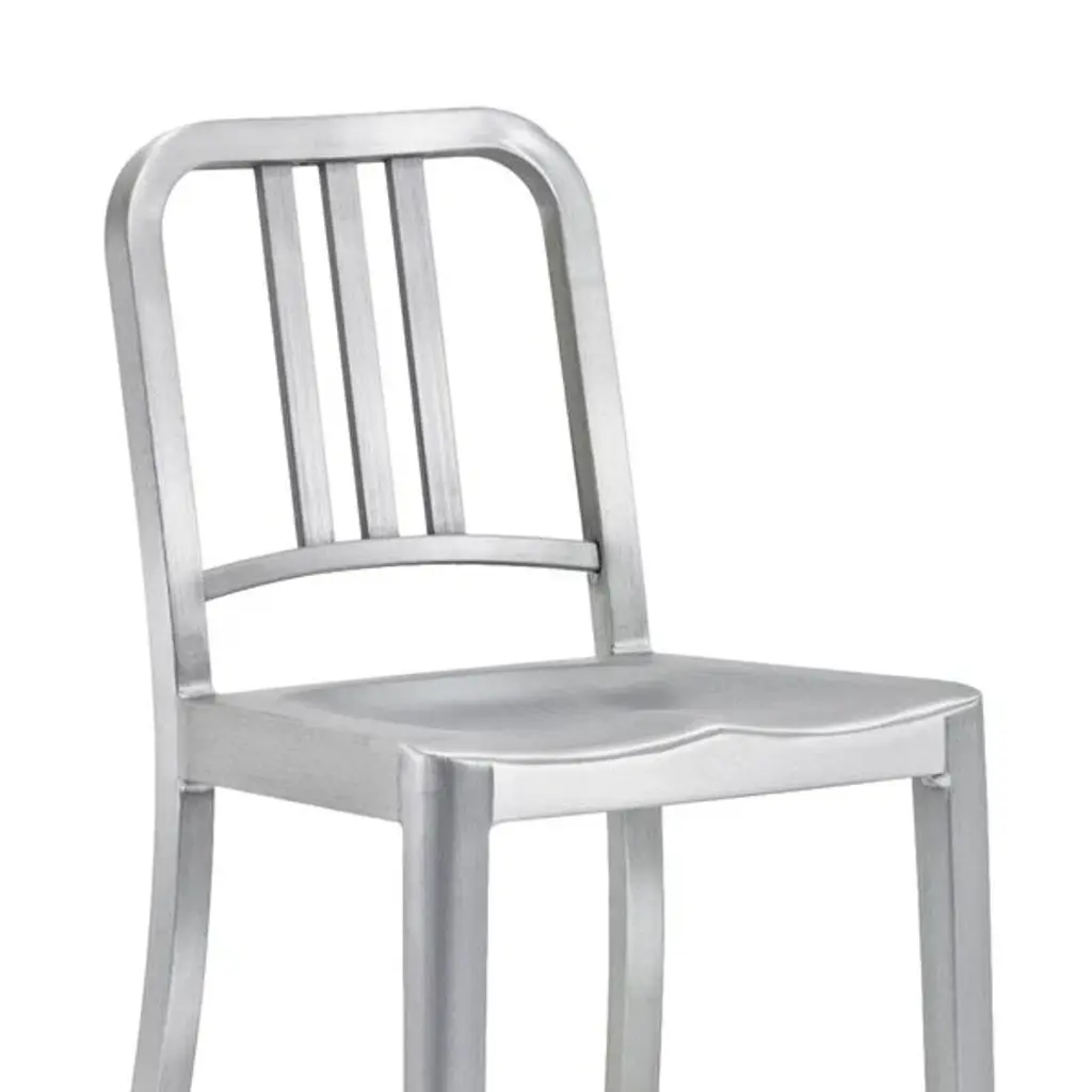 1006 Navy by Emeco, 1944 The original. The 1006 Navy Chair® was originally created in 1944 for the US Navy as a lightweight, non-corrosive, fire resistant and super strong chair for ships and submarines. All chairs and stools are still built by hand from 80% recycled aluminum in Hanover, Pennsylvania. Outdoor approved. Small carbon footprint. Guaranteed for life. Standard glides: soft plastic TPU glides for all-around use, including outdoor use. Alternative glides available at an upcharge.