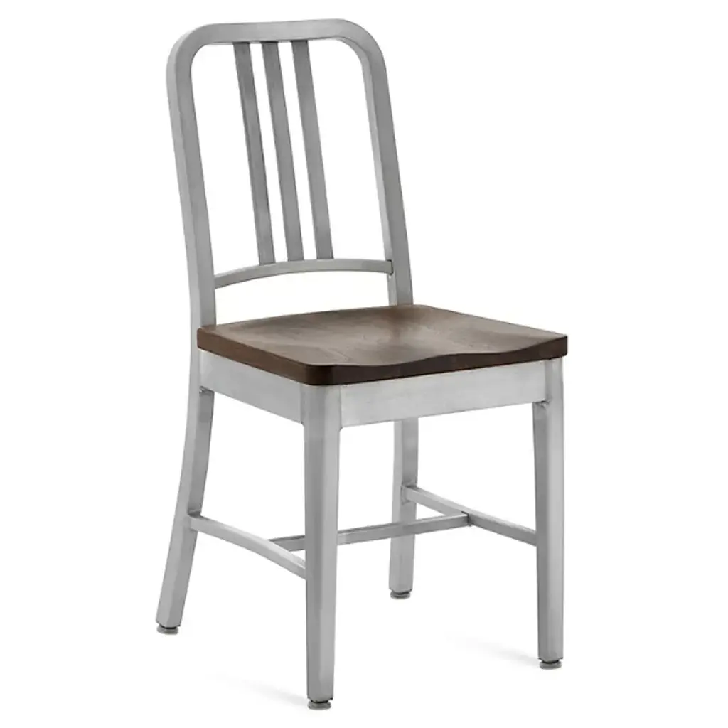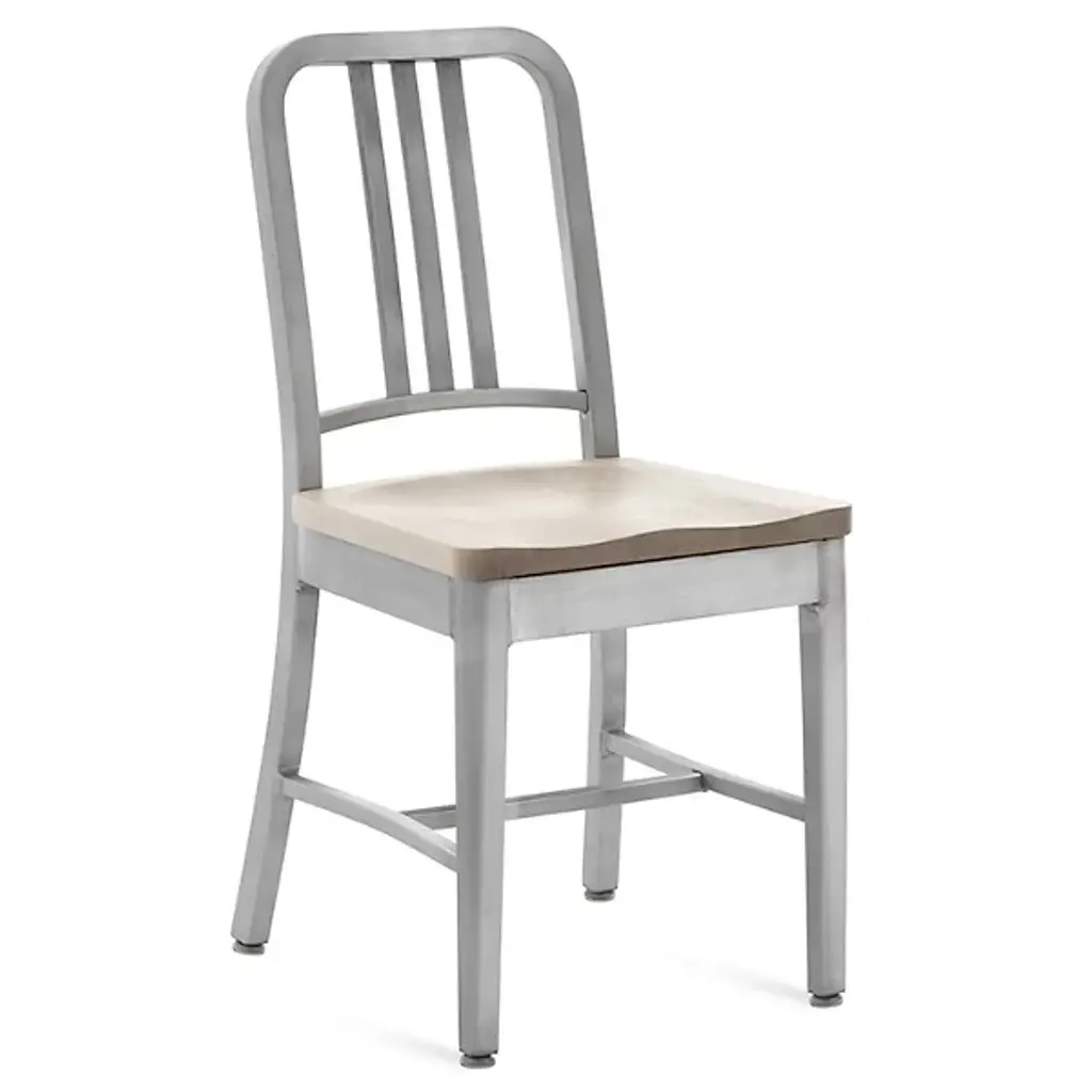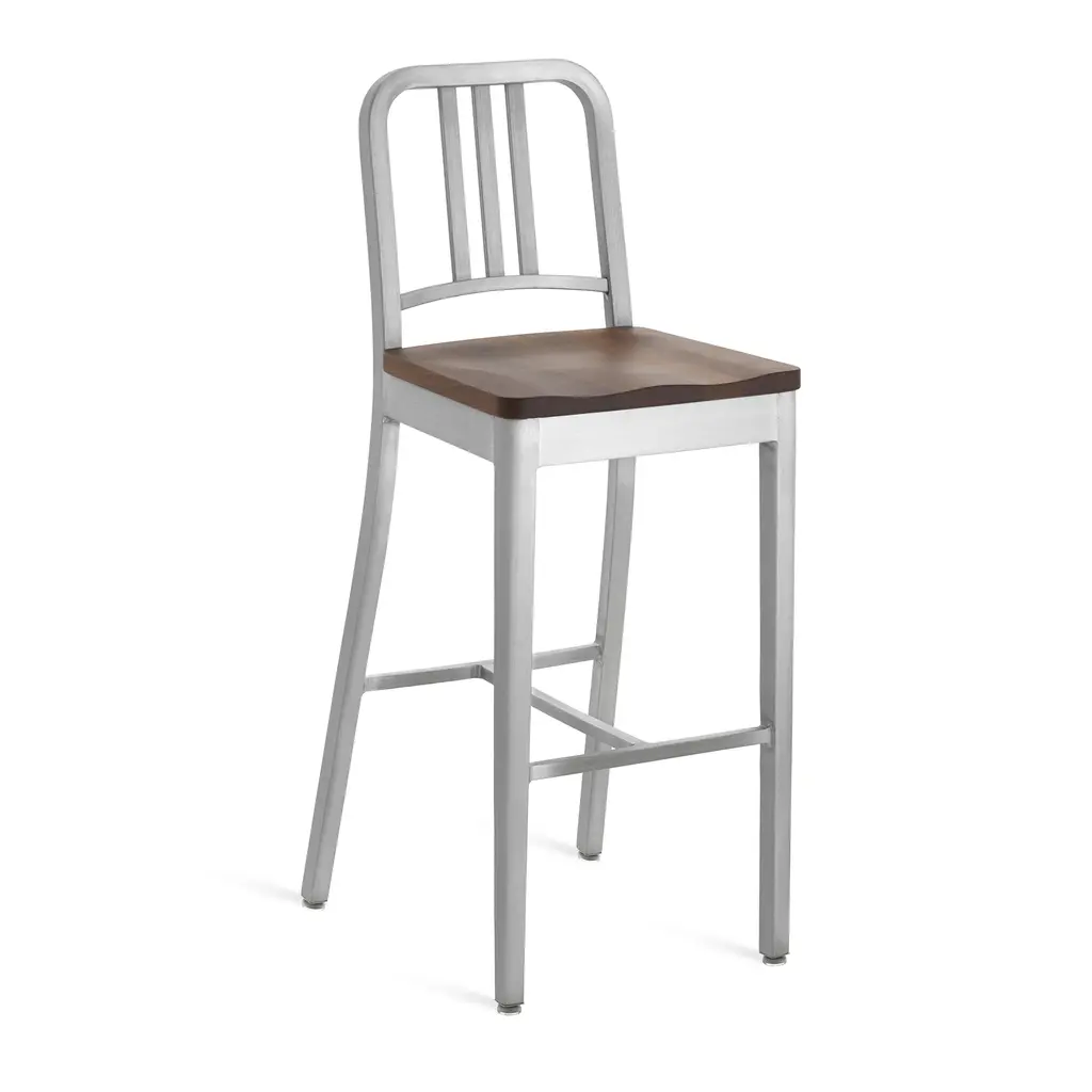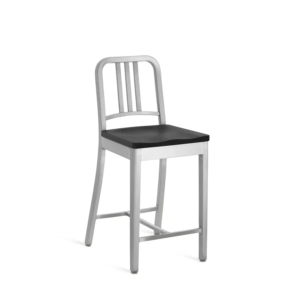 1104 Navy by Emeco, 1954 Originally created as a library chair for the US Navy, the 1104 Navy adds a solid wood seat to our original aluminum Navy chair. Available in six solid wood finishes - all locally sourced from sustainably managed forests and handcrafted in collaboration with our Amish neighbors in Lancaster, Pennsylvania. Seats in Accoya are for outdoor use only. Learn more . Standard glides: soft plastic TPU glides for all-around use, including outdoor. Alternative glides available at an up-charge. Please note that wood is a natural material, with variations in color and grain pattern to be expected.