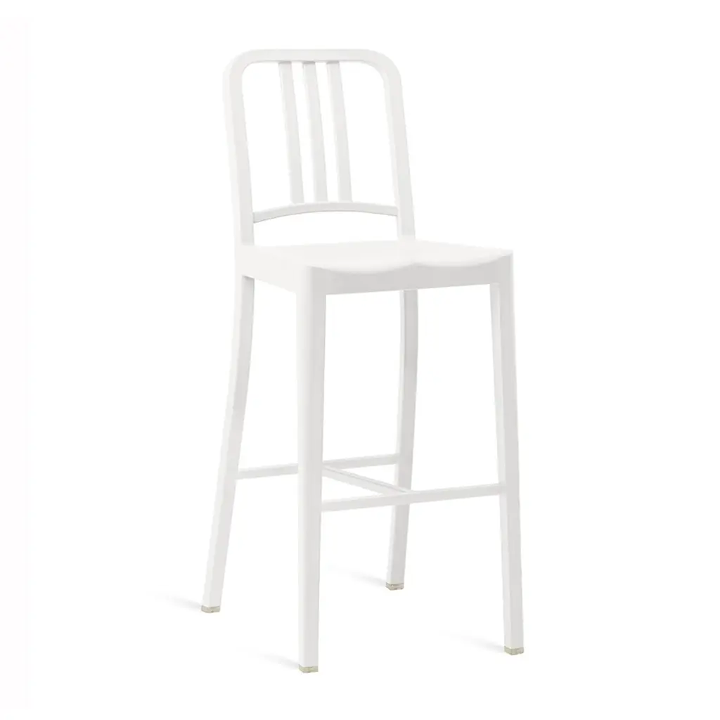 Like the original 111 Navy chair, the 111 Navy Stool from Emeco is an engineering success, designed to stand up to heavy use, and made right here in the United States. An innovative collaboration between Coca-Cola and Emeco, the 111 Navy Stool is solving an environmental problem: the discarding of plastic soda bottles that pollute our environment. The result is utilizing 150 discarded PET bottles towards the creation of the stool, saving millions of Coca-Cola bottles from the landfill each year. The simple silhouette and variety of colorful finishes let you effortlessly match to fit your interior needs. Highlights