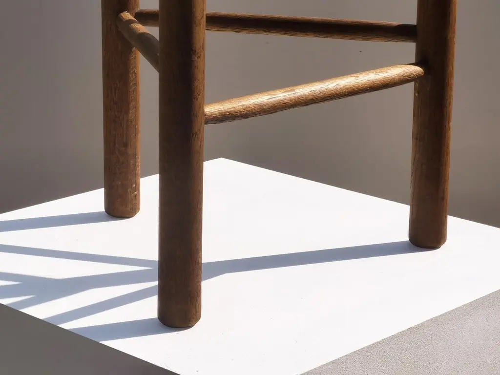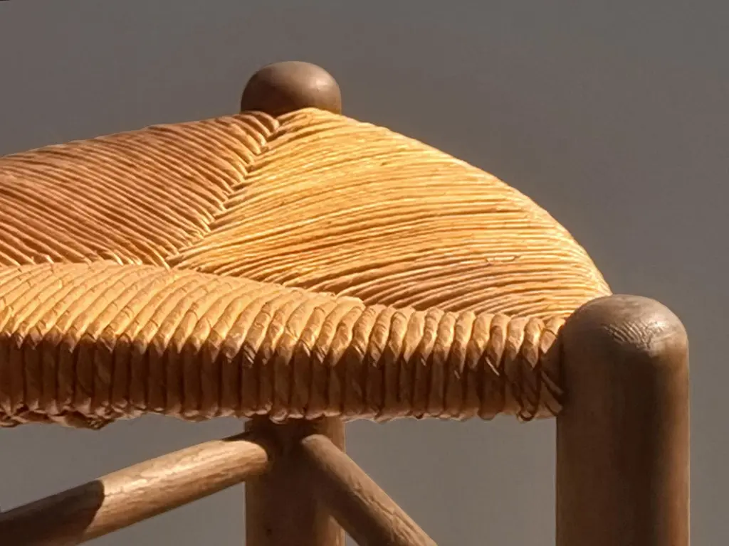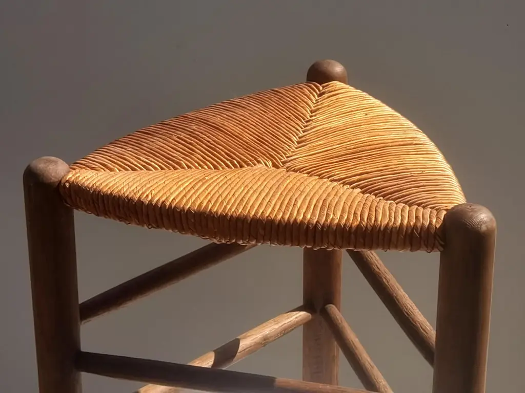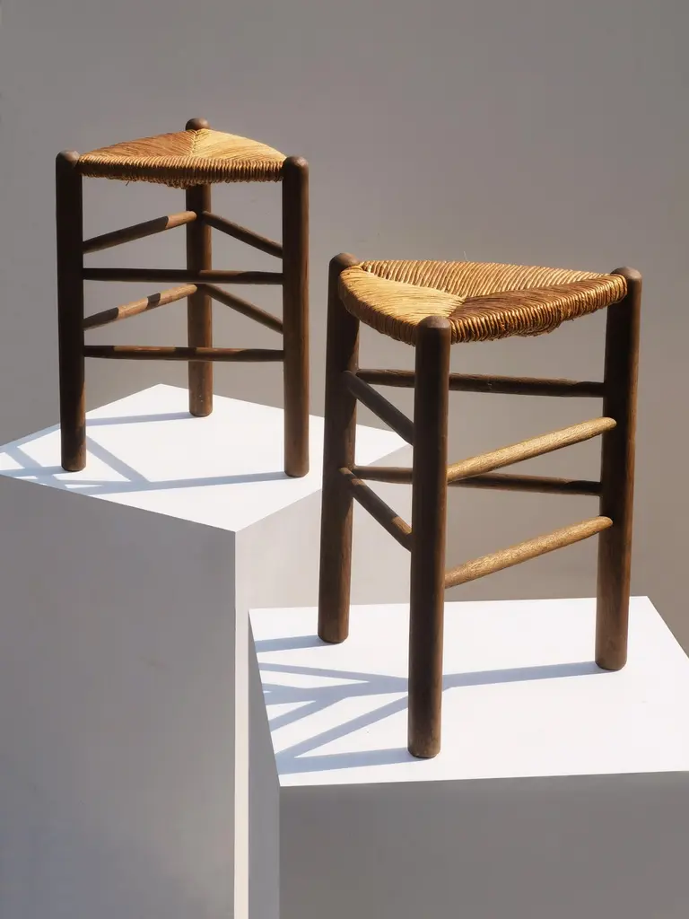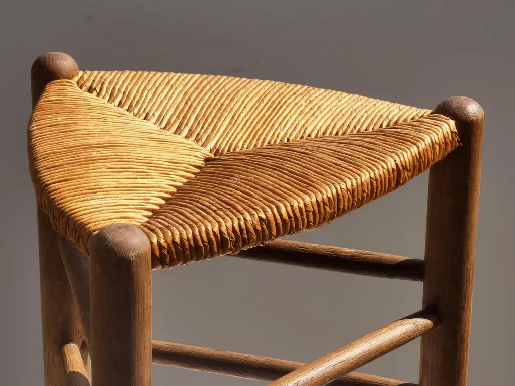 One singular and charming (of a set of 3, 2 other pieces being on sale as a pair in our other sales) single tripod stool, Mid-Century Modern, Modernist, Rustic Modern, Brutalist, solid and architectural tripod structure in solid elm, singular triangular shaped woven straw seat, in the spirit of the creations of Charlotte Perriand, by Pierre Faucheux, France 1950.The wood and the straw combined to this unusual triangular design are giving this piece a unique warm feel in any interior.2 OTHER IDENTICAL PIECES ARE AVAILABLE, ON SALE IN OUR OTHER SALES, TO FORM A SET OF 3 PIECES.CONDITION: In original condition.Wear, scratches, cracks, deformation, traces, patina of use on all surfaces.