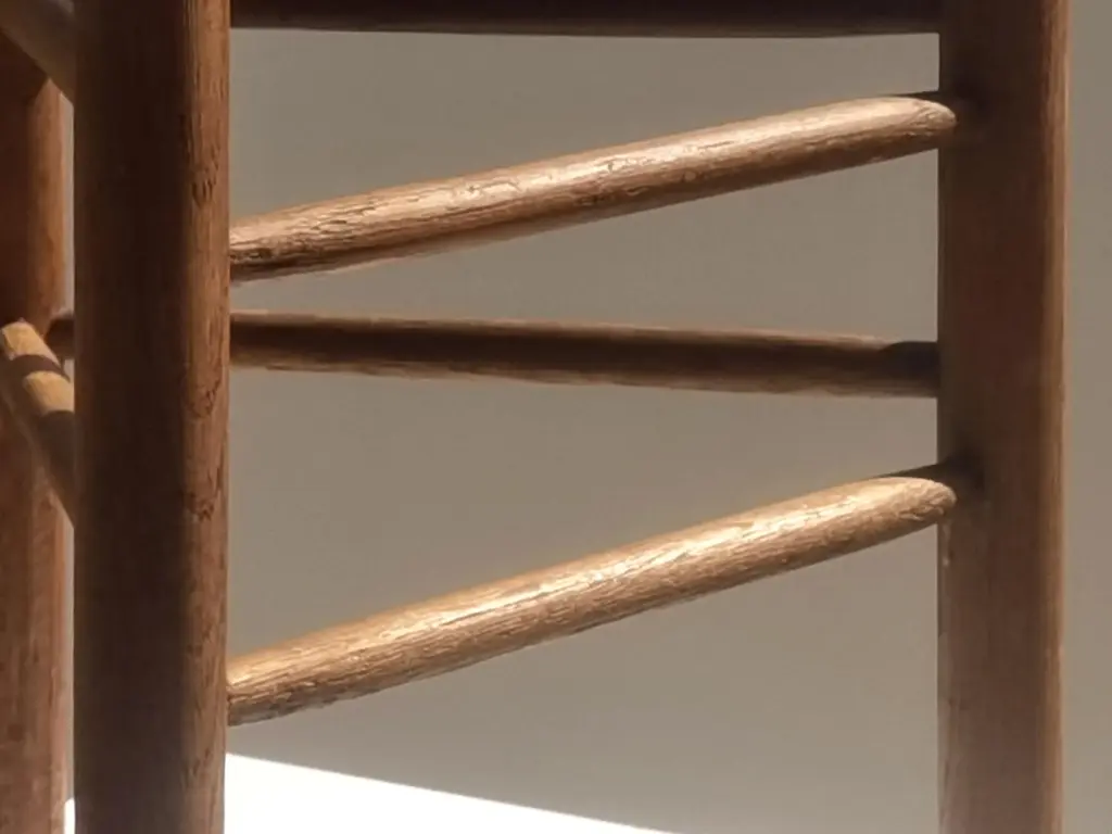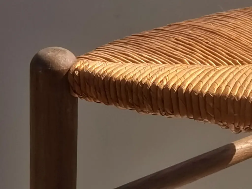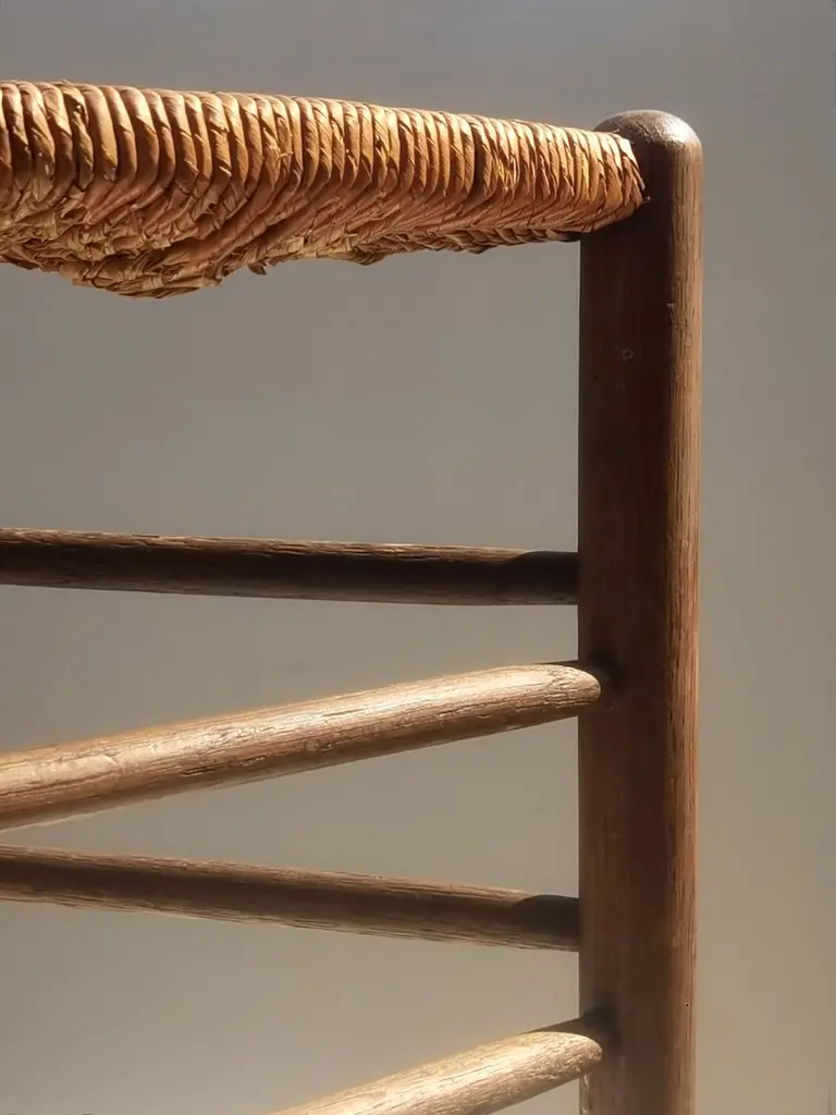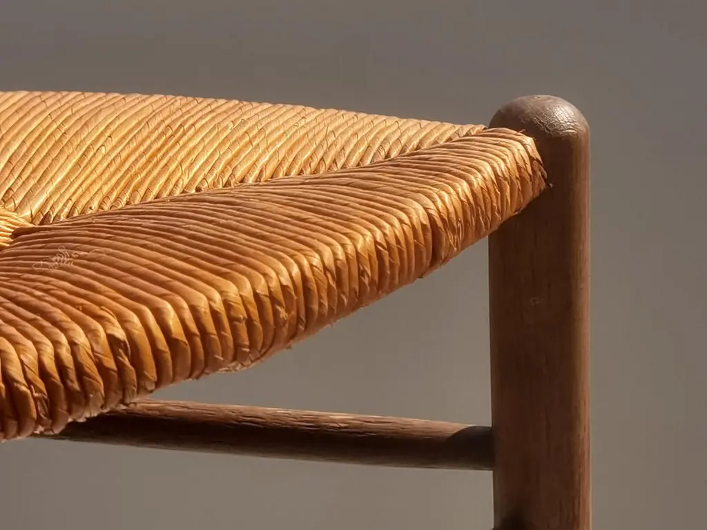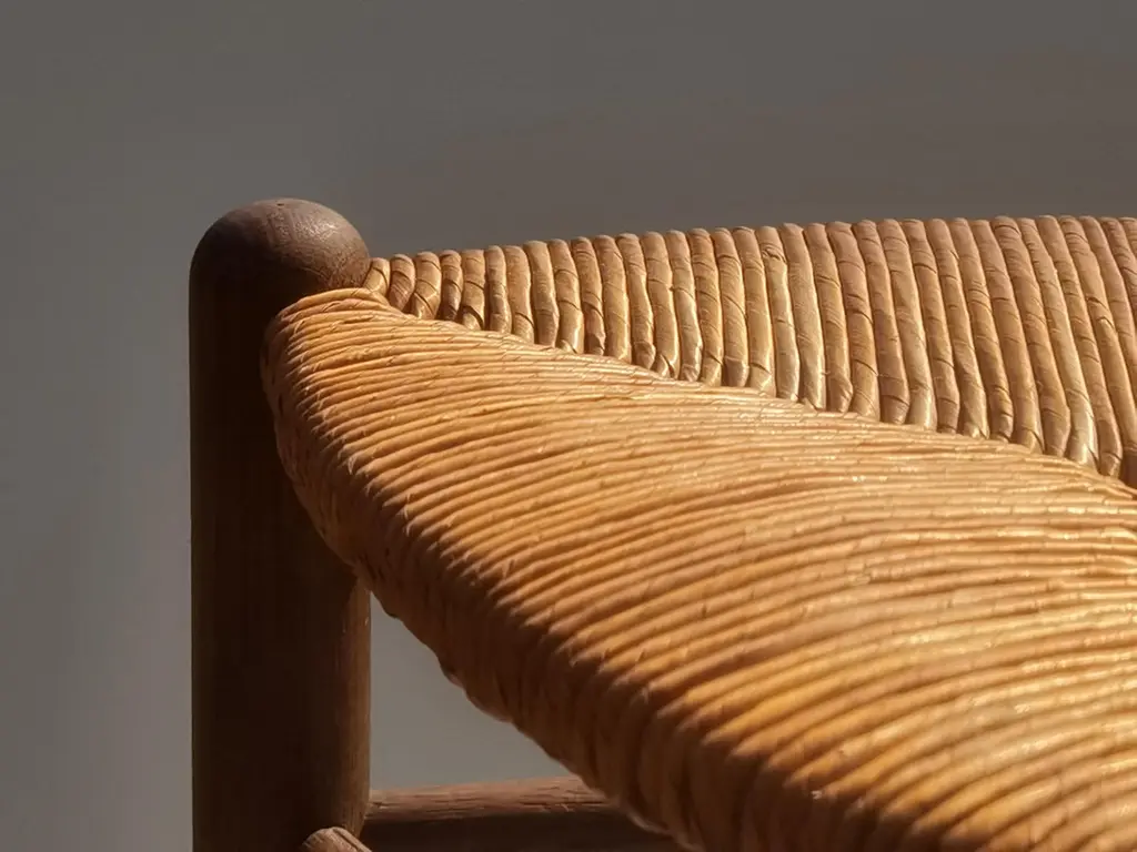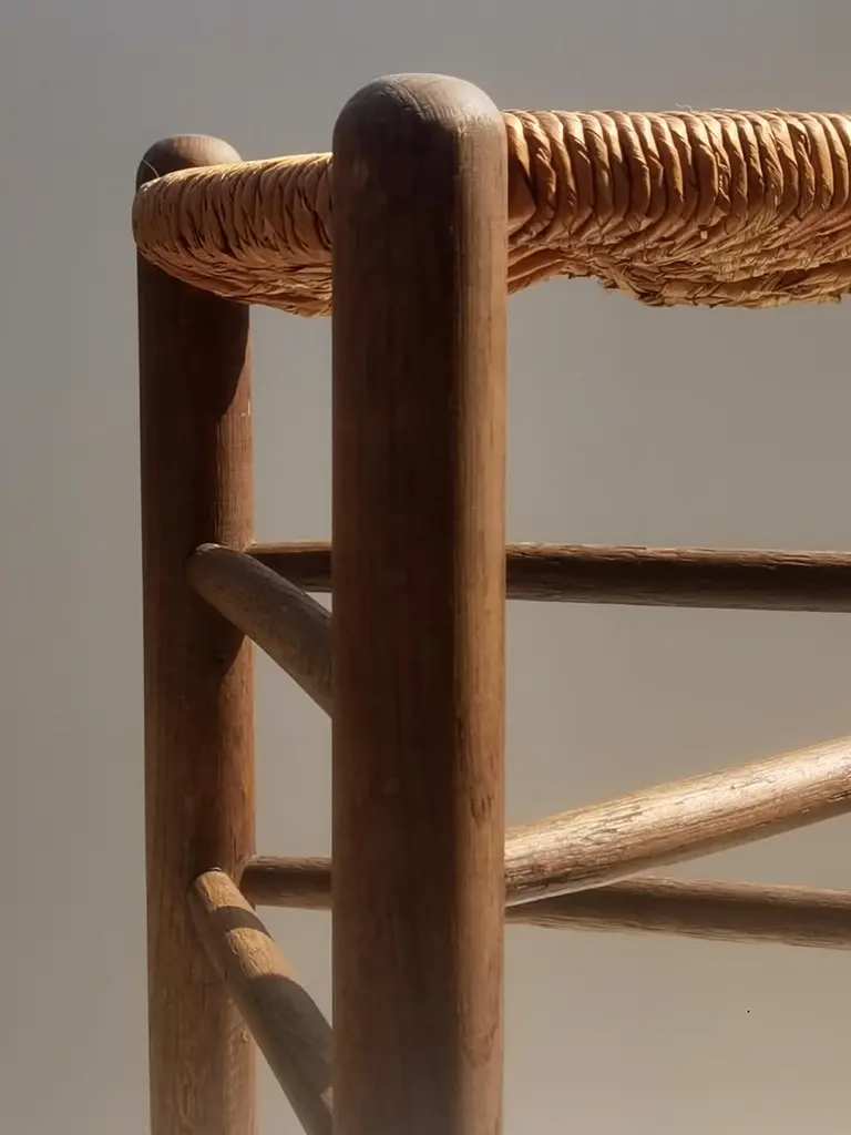 One singular and charming (of a set of 3, 2 other pieces being on sale as a pair in our other sales) single tripod stool, Mid-Century Modern, Modernist, Rustic Modern, Brutalist, solid and architectural tripod structure in solid elm, singular triangular shaped woven straw seat, in the spirit of the creations of Charlotte Perriand, by Pierre Faucheux, France 1950.The wood and the straw combined to this unusual triangular design are giving this piece a unique warm feel in any interior.2 OTHER IDENTICAL PIECES ARE AVAILABLE, ON SALE IN OUR OTHER SALES, TO FORM A SET OF 3 PIECES.CONDITION: In original condition.Wear, scratches, cracks, deformation, traces, patina of use on all surfaces.