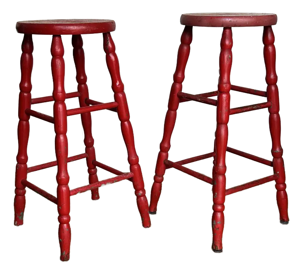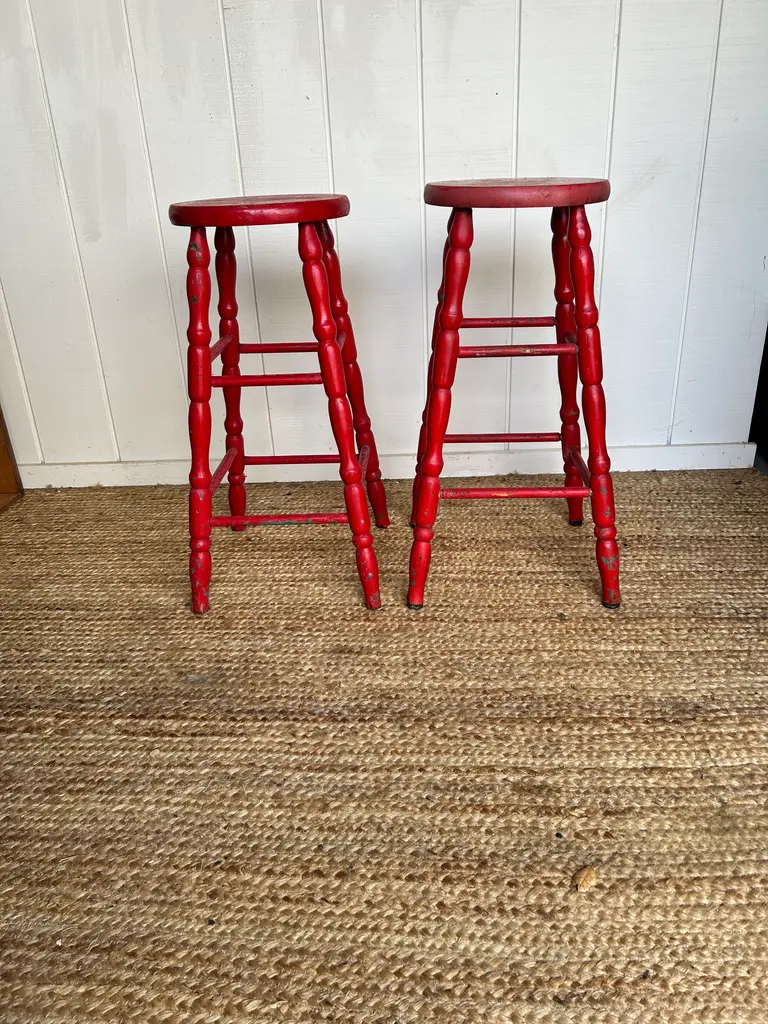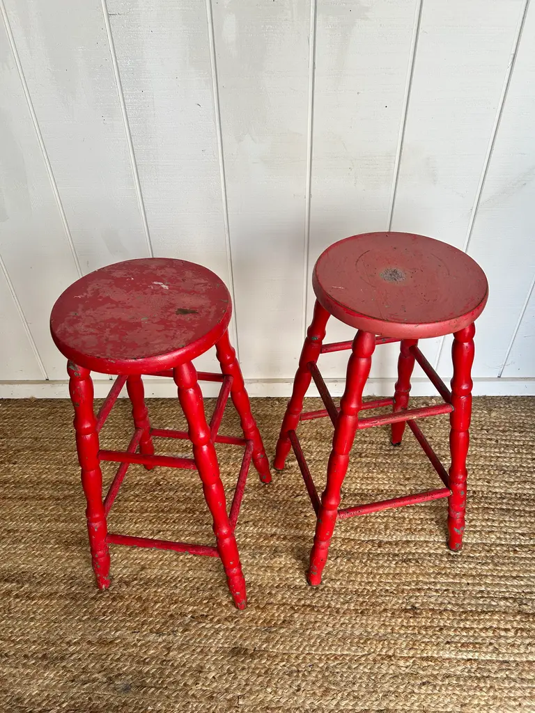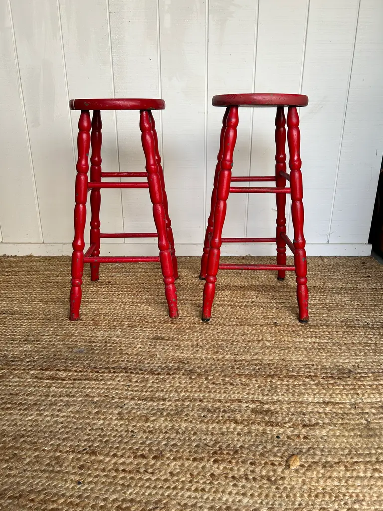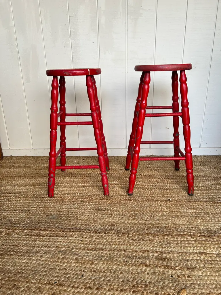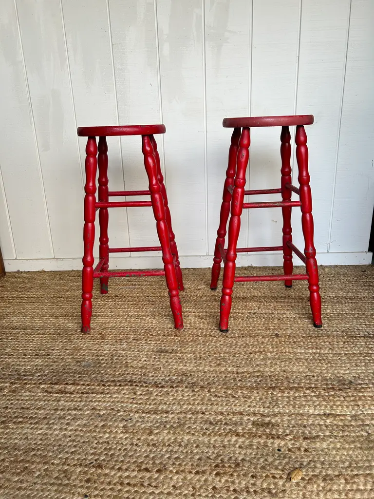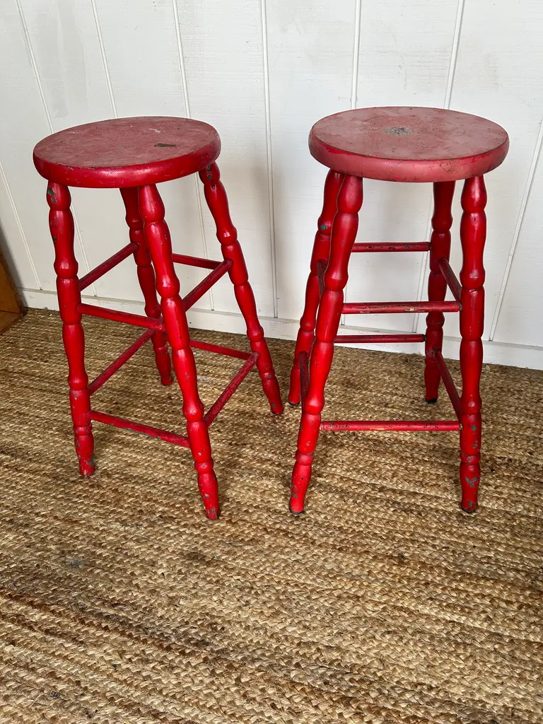 Two charming vintage stools. Outrageous patina. Worn red paint with glimpses of green underneath. Turned spindle legs with two stretchers. Both are in great condition. Condition consistent with age and use. Questions always welcomed!