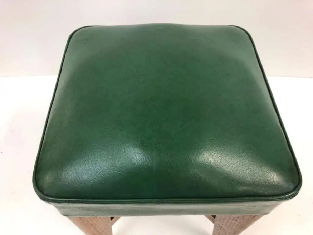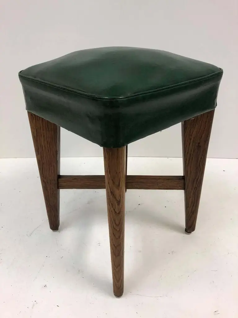 1940s French oak stools. Original vinyl seats and structurally sound. Two of the stools has X-base stretchers.