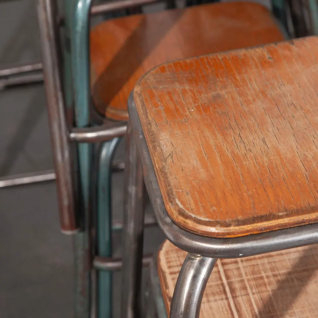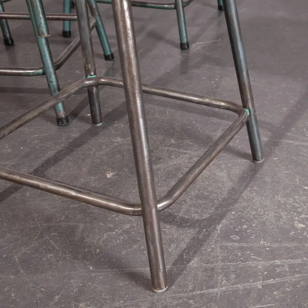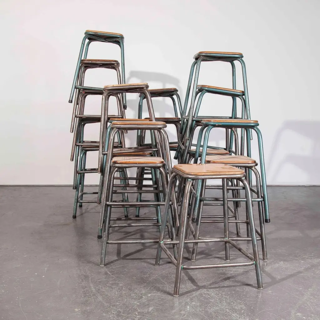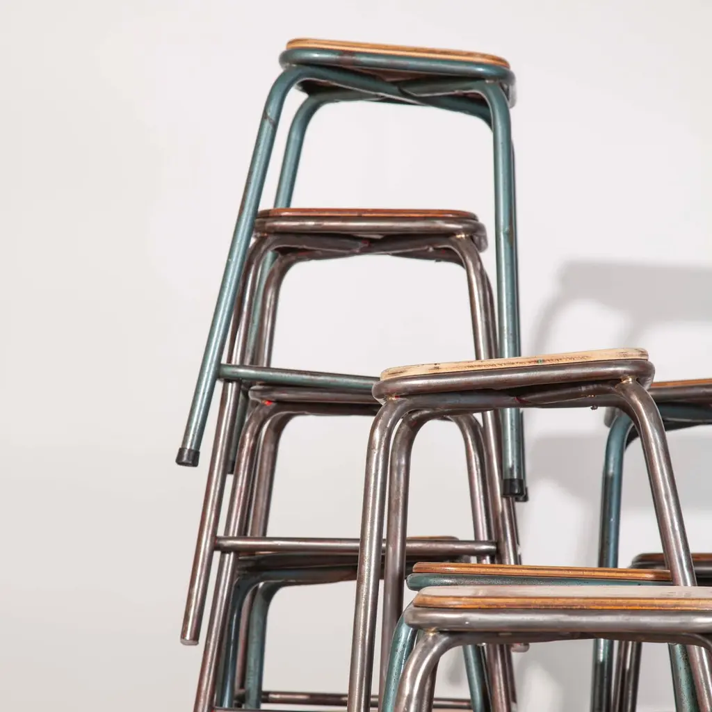 1950s vintage Mullica industrial French stacking high stools, various quantities available.950’s vintage Mullica industrial French stacking high stools – various quantities available. We have a number of stools available and are selling them in any quantity required. We are huge fans of the French company Mullica and these wonderful stools in good original condition, with birch ply seats, are getting increasingly hard to find. Made in the late 1950?s and used typically in schools, universities and laboratories. We service and wax each stool individually before they leave our workshop and we deliver stools of excellent quality. We specialise in high quality vintage seating and have a large range. We only sell the very best seating in great condition with rich colour and patina, please see the other seating we have listed and please contact us for more details or advice. Practical seat height of 58cm with a footrest bar. Stool seats are 32cm square.Workshop report:Our workshop team inspect every product and carry out any needed repairs to ensure that everything leaves us serviced and maintained ready for many more years of life. All of our vintage products show the rich beauty and history of their life with the knocks and bumps of many years of use and we try to minimize restoration to keep every piece as original as possible.