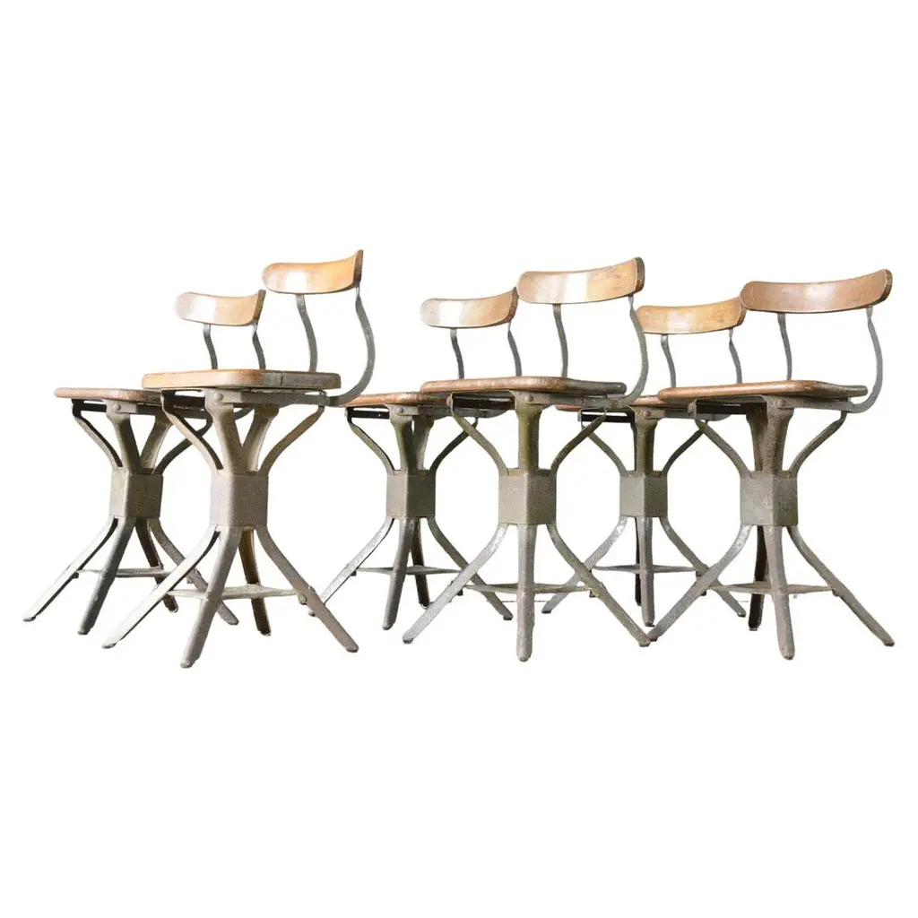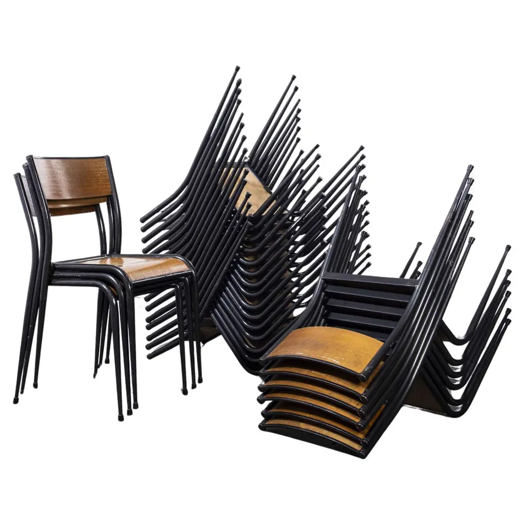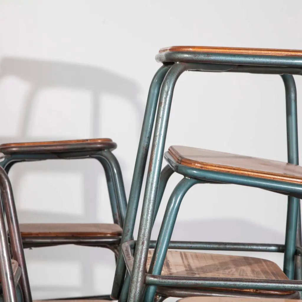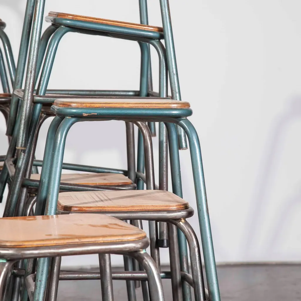 1950s vintage Mullica industrial French stacking high stools, various quantities available.950’s vintage Mullica industrial French stacking high stools – various quantities available. We have a number of stools available and are selling them in any quantity required. We are huge fans of the French company Mullica and these wonderful stools in good original condition, with birch ply seats, are getting increasingly hard to find. Made in the late 1950?s and used typically in schools, universities and laboratories. We service and wax each stool individually before they leave our workshop and we deliver stools of excellent quality. We specialise in high quality vintage seating and have a large range. We only sell the very best seating in great condition with rich colour and patina, please see the other seating we have listed and please contact us for more details or advice. Practical seat height of 58cm with a footrest bar. Stool seats are 32cm square.Workshop report:Our workshop team inspect every product and carry out any needed repairs to ensure that everything leaves us serviced and maintained ready for many more years of life. All of our vintage products show the rich beauty and history of their life with the knocks and bumps of many years of use and we try to minimize restoration to keep every piece as original as possible.