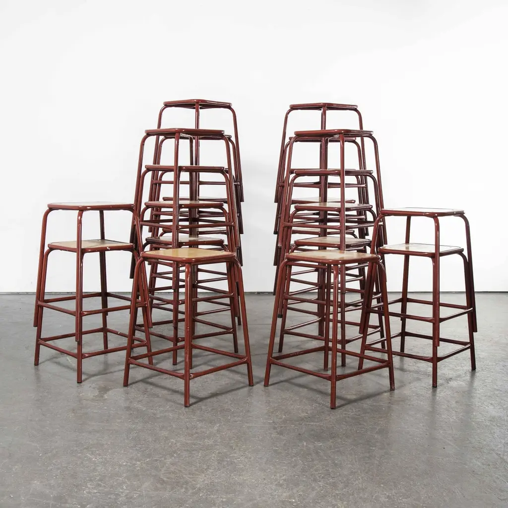 1970’s French dark red laboratory stools – various quantities available1970’s French dark red laboratory stools – various quantities available. Good honest lab stools, heavy steel frames with solid heavy birch ply seats. We clean them and check all fixings, they are good to go. Seat height 59cm.Workshop ReportOur workshop team inspect every product and carry out any needed repairs to ensure that everything leaves us serviced and maintained ready for many more years of life. All of our vintage products show the rich beauty and history of their life with the knocks and bumps of many years of use and we try to minimise restoration to keep every piece as original as possible.