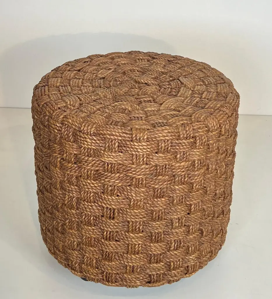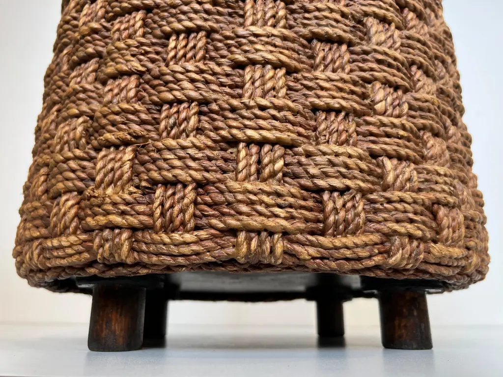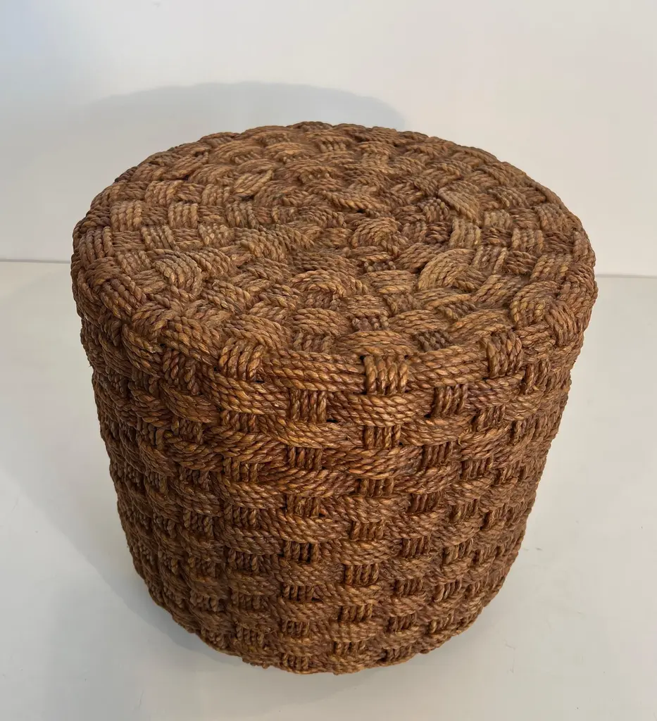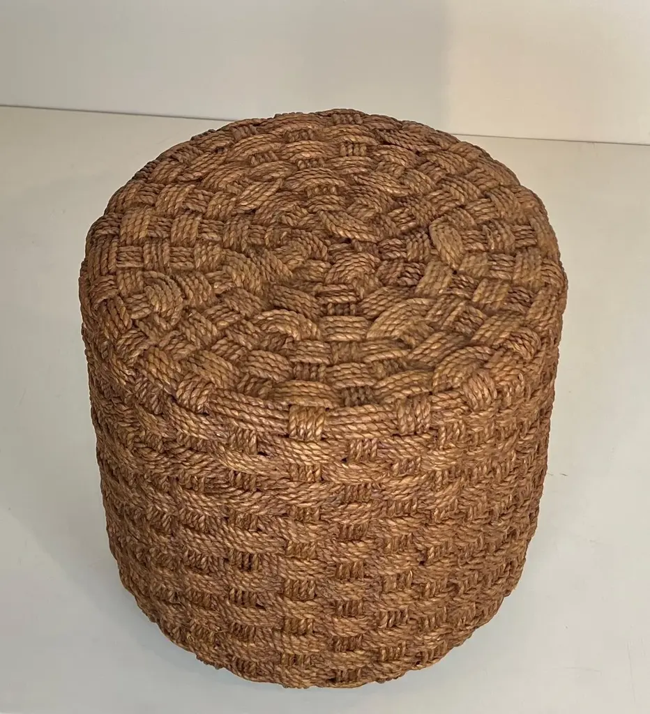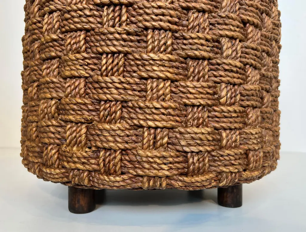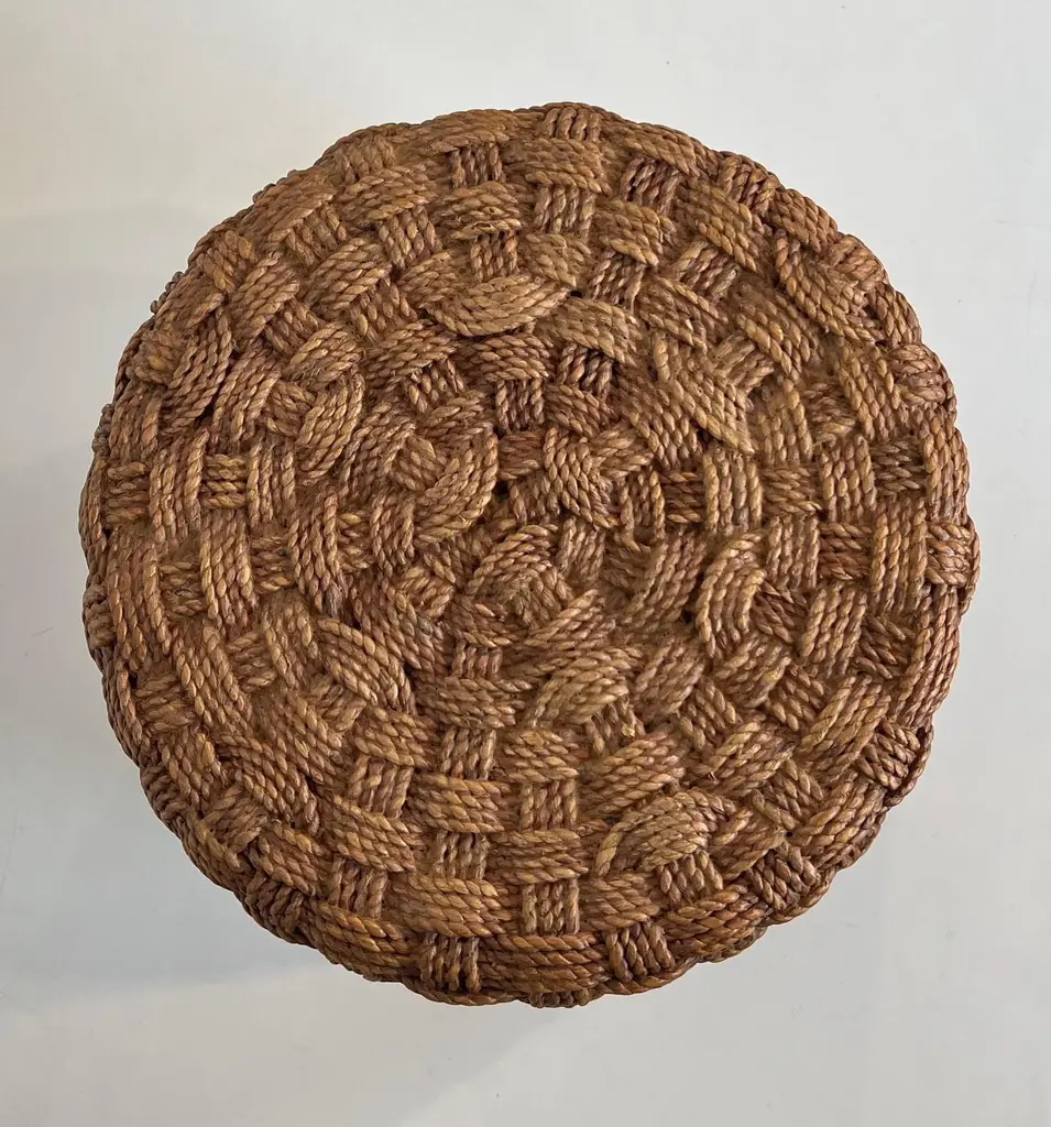 This beautiful stool is made of rope with round wooden legs. It is a French work in the style of Adrien Audoux and Frida Minet (Audoux Minet). 12 pieces available. Circa 1970
