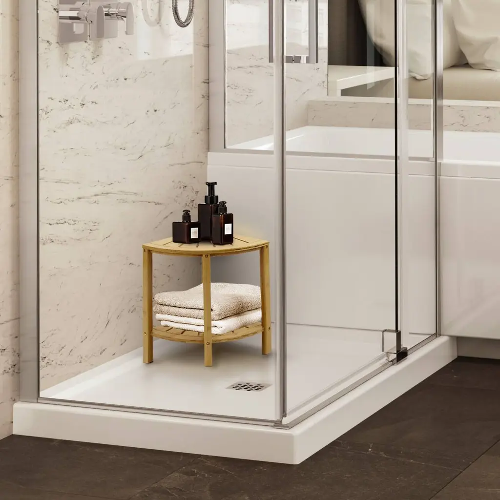 2-Tier Bamboo Corner Shower Stool Bench With Storage Shelf - Natural