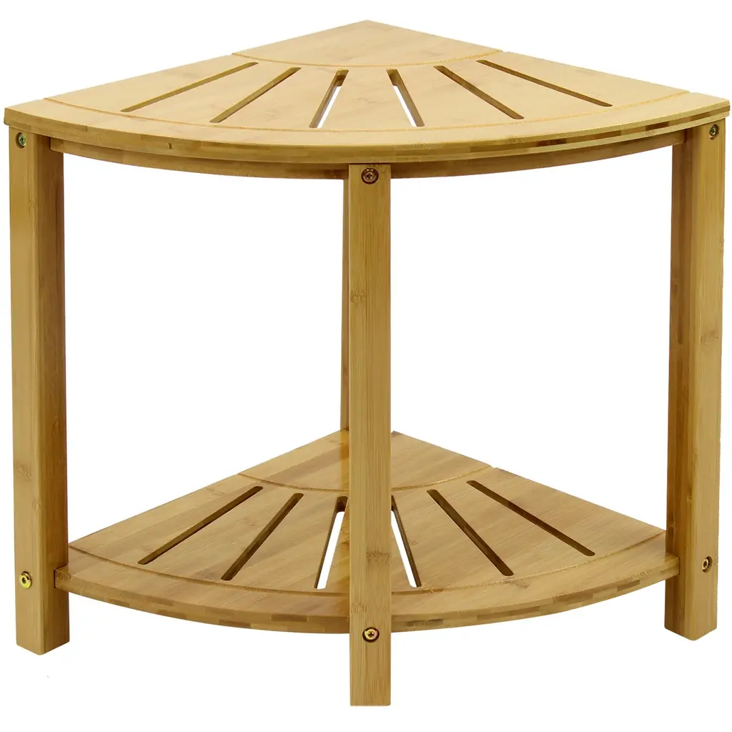 Prepare for a spa-like retreat with the Sorbus Bamboo Corner Bench. From the shower to the sauna, this attractive bench offers seating and storage for all your bath essentials. The contoured triangular seat is sturdy and comfortable for users while the lower shelf keeps shower necessities close at hand. Simply take a seat while scrubbing the bottoms of your feet or use this shower stool as a foot rest when shaving your legs! The bamboo construction is mold and mildew resistant for lasting use and vented to allow soap and water to pass through. For additional use, display toiletries, linens, and more on the seat or shelf underneath. The compact design fits in most spaces and helps create the feeling of a spa-like retreat.Versatile and multi-purpose.In the bathroom, use this stool for everyday use or to welcome overnight guest with 5-star amenities that rival a luxury hotel! The lower storage shelf is sturdy enough to hold items like towels, toilet paper, baskets of shampoo, lotion, soap, magazines, flowers, candles, and more. It's versatile enough to be used in a sauna, mudroom, garden, or to complement a patio with nature inspired style.Sturdy bamboo designTriangle inspired shape with slotted curved seat and lower shelf.Made of100% bamboo construction. Color is natural.Includes non-slip base for traction and stability.Suitable for indoor use. Wipes clean.Minimal assembly. Instructions INCLUDED.Bath accessories NOT INCLUDED.Supports up to 220 lbs.Measures approximately 15.5' L x 15.5'' W x 16.50'' H.