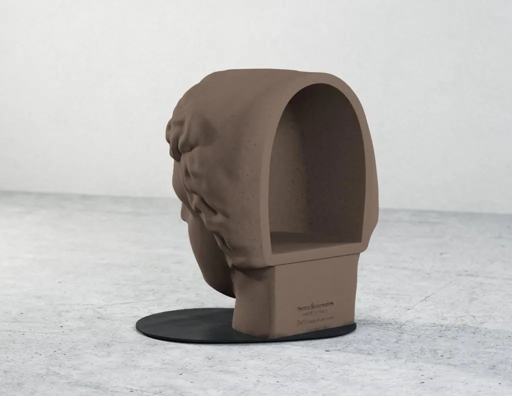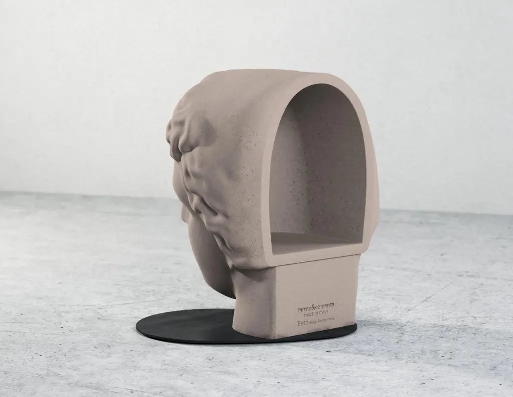 Surrealism, primitivism, metaphysics and brutalism. Art together with architecture and design build a scenario of inspirations and continuous references through which the material rises to an expressive language, ready to welcome and rework formal suggestions of different origins. Betti and Fusto the series that introduce the new design approach. A human face with mysterious origins and a clear classical reference to soften the brutalism of concrete.Material:Concrete and metal baseColor available: Ink, silver, fir, dark chocolate, powder, brick, ultramarine and creamSome of the images enclosed are rendering.