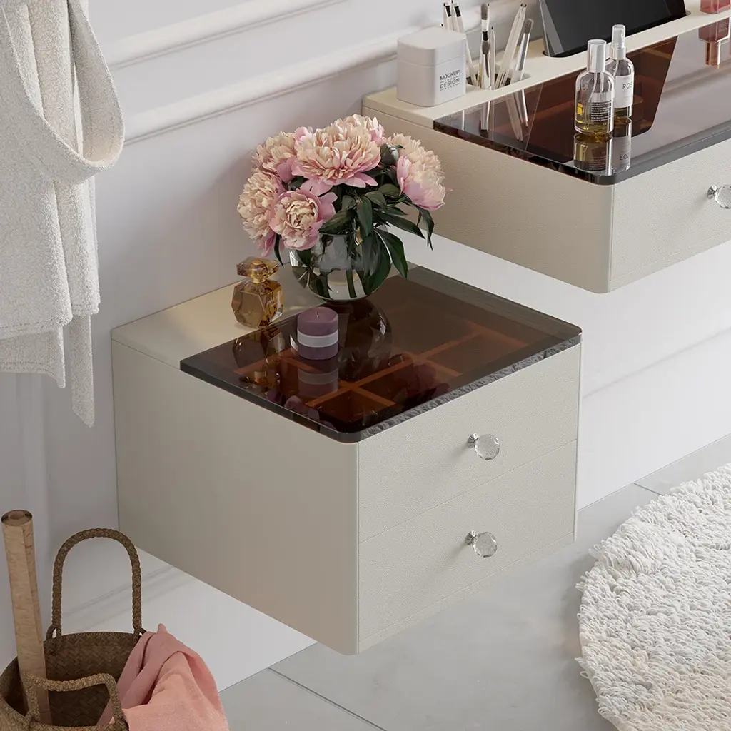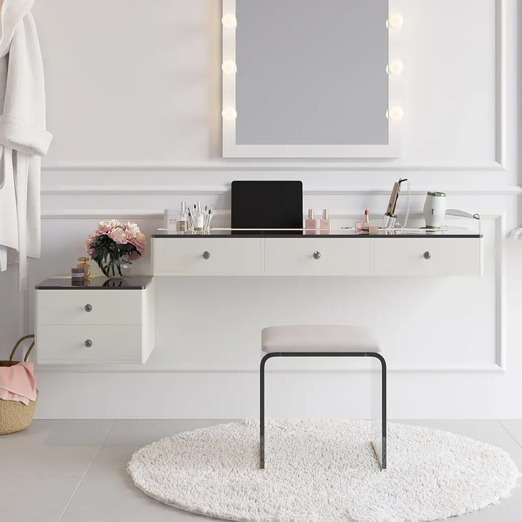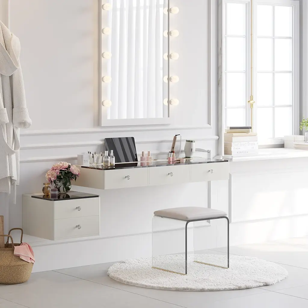This floating makeup vanity delivers all the features you need to get your daily makeup done. Features with wall-mounted design and amber tempered glass top, different sizes of cutouts to cradle electric hair accessories, let alone ample storage of 3 drawers for your cosmetic products. The top panel can hold a phone or tablet, which is perfect for watching videos while doing makeup.
