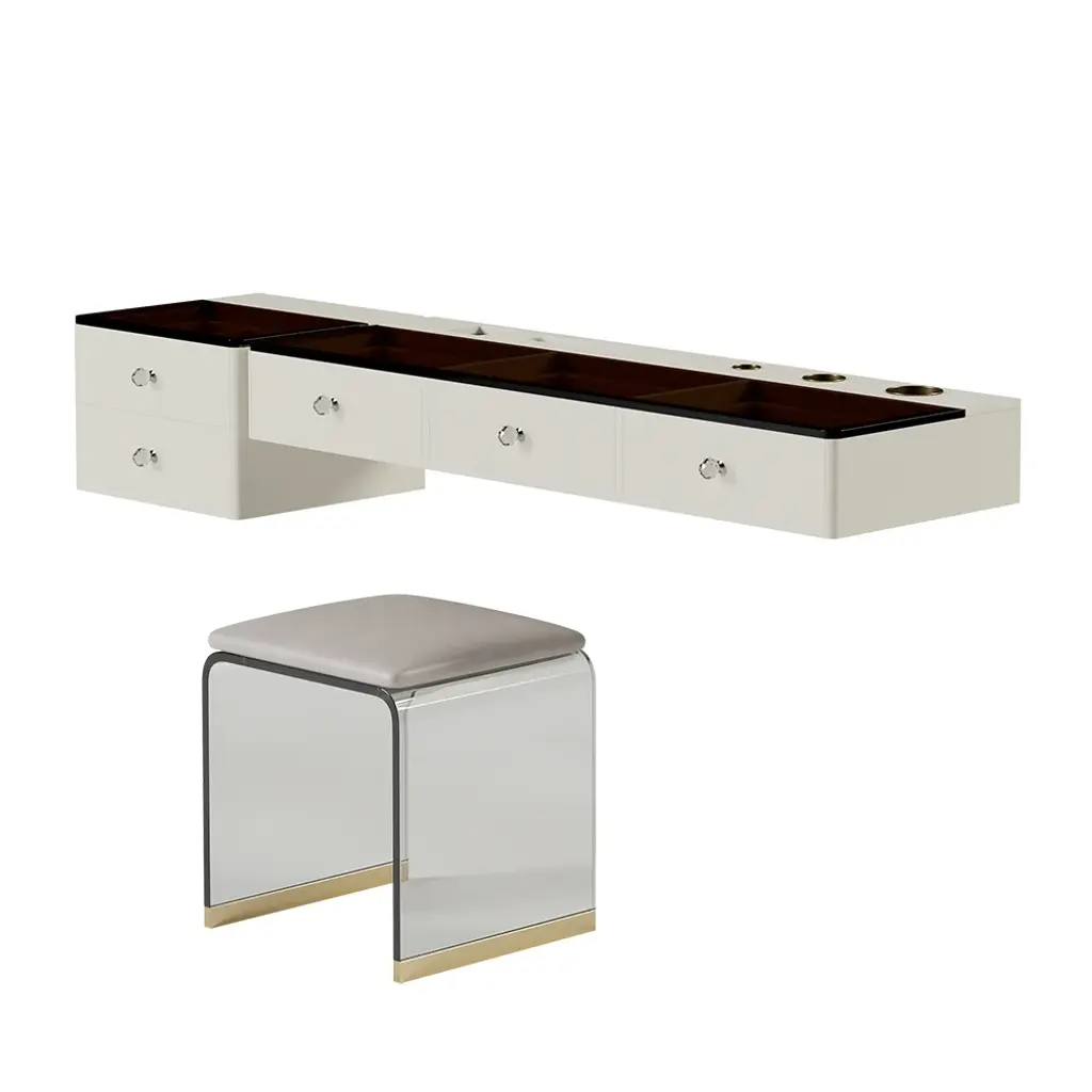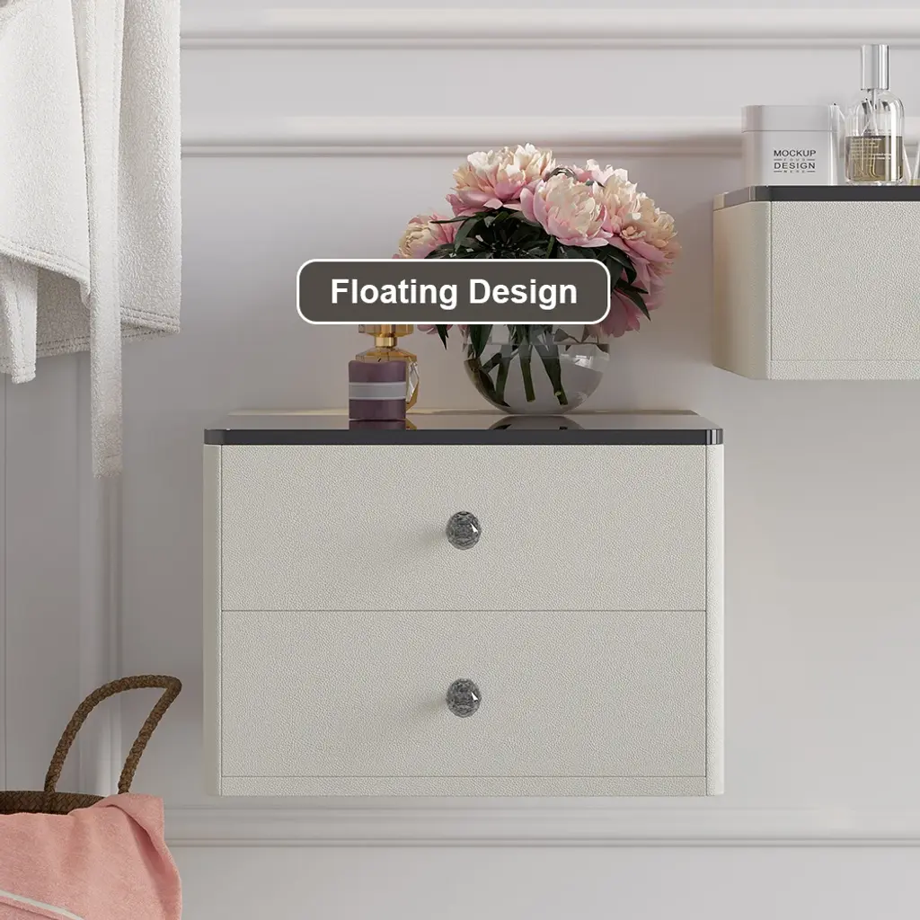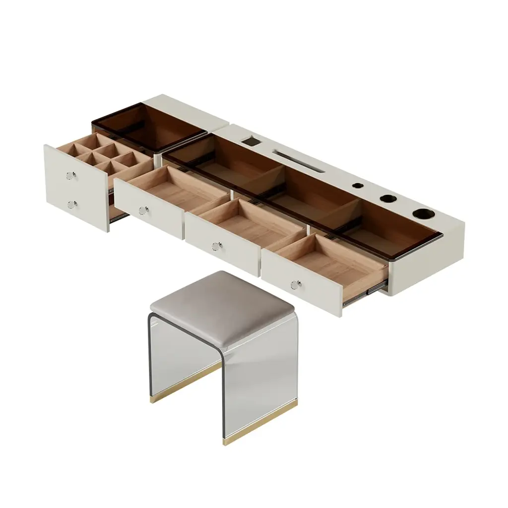 This floating makeup vanity delivers all the features you need to get your daily makeup done. Features with wall-mounted design and amber tempered glass top, different sizes of cutouts to cradle electric hair accessories, let alone ample storage of 3 drawers for your cosmetic products. The top panel can hold a phone or tablet, which is perfect for watching videos while doing makeup.