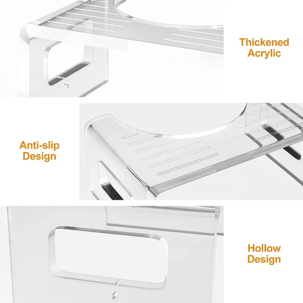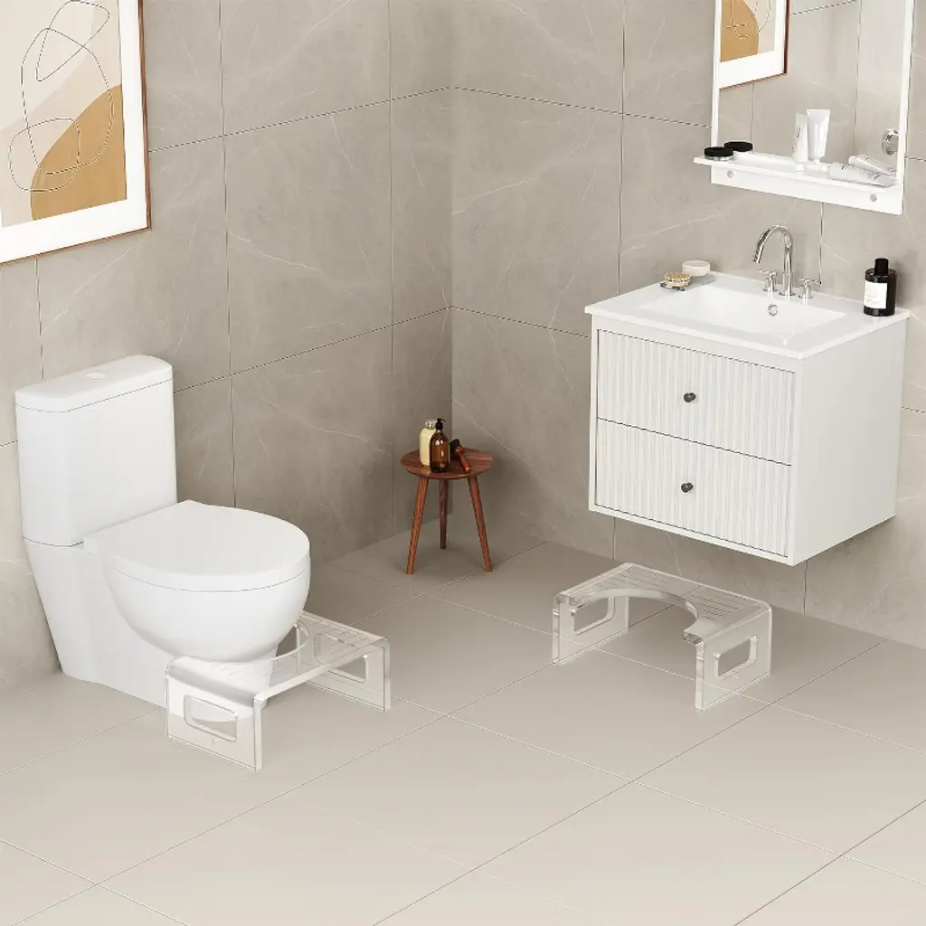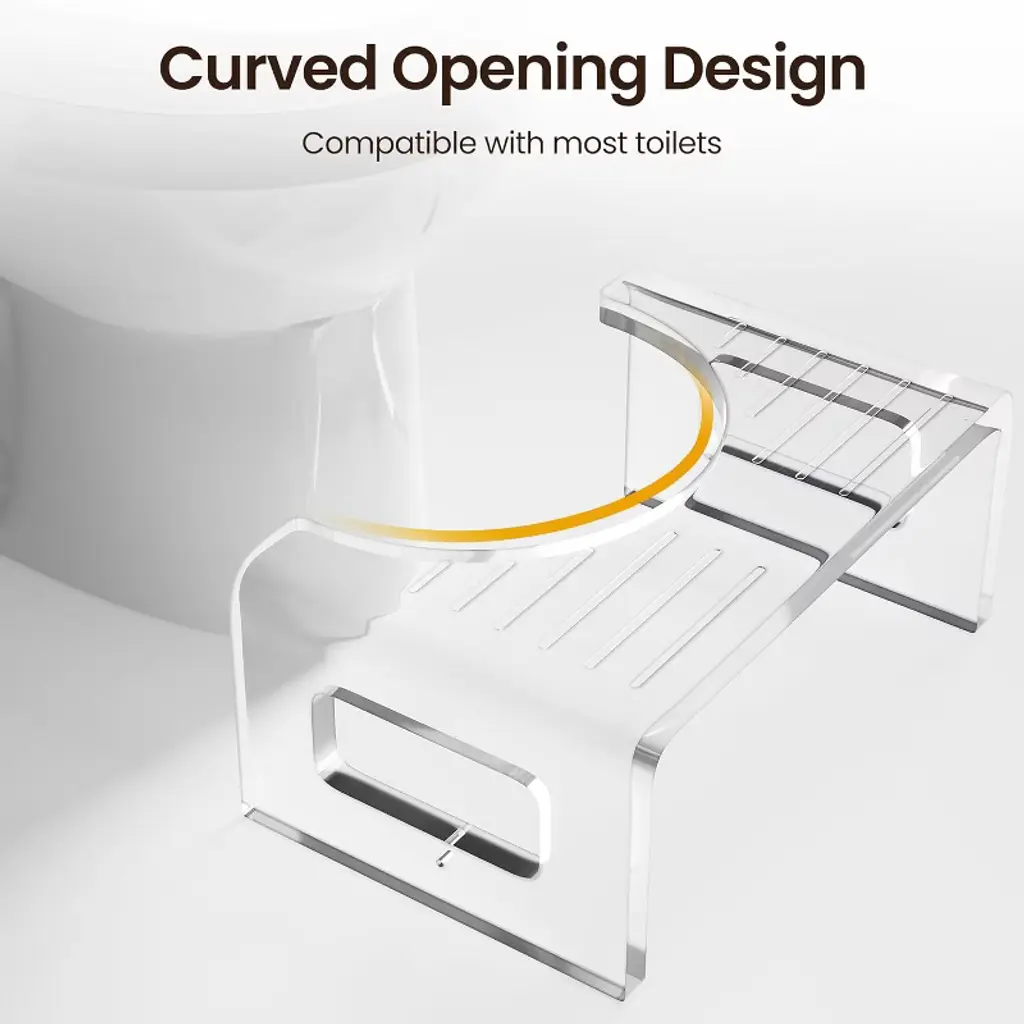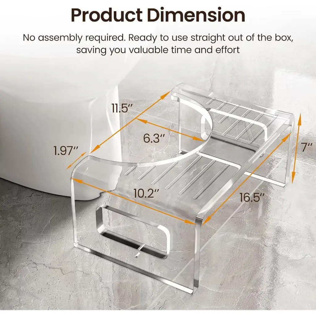 This acrylic toilet stool is designed to mimic a natural squatting posture, positioning the intestines at an optimal angle to make bowel movements faster and easier. It enhances gut health, reduces bloating and constipation, and helps prevent hemorrhoids, making it a doctor-recommended tool for a healthier bathroom routine. Safe and practical, the versatile stool also doubles as a step stool for children, with a textured, hollow design that boosts slip resistance and rounded edges to prevent injuries. Expertly crafted from 100% acrylic, it is durable, waterproof, and ready to use straight out of the box. Its sleek, transparent surface is not only stylish but also easy to clean, making it an ideal choice for any home. Specification Product Name: Acrylic Toilet Stool Color: Transparent Material: Acrylic Overall Dimensions: 16.5''L x 10.9''W x 6.9''H Weight Capacity: 300lbs
