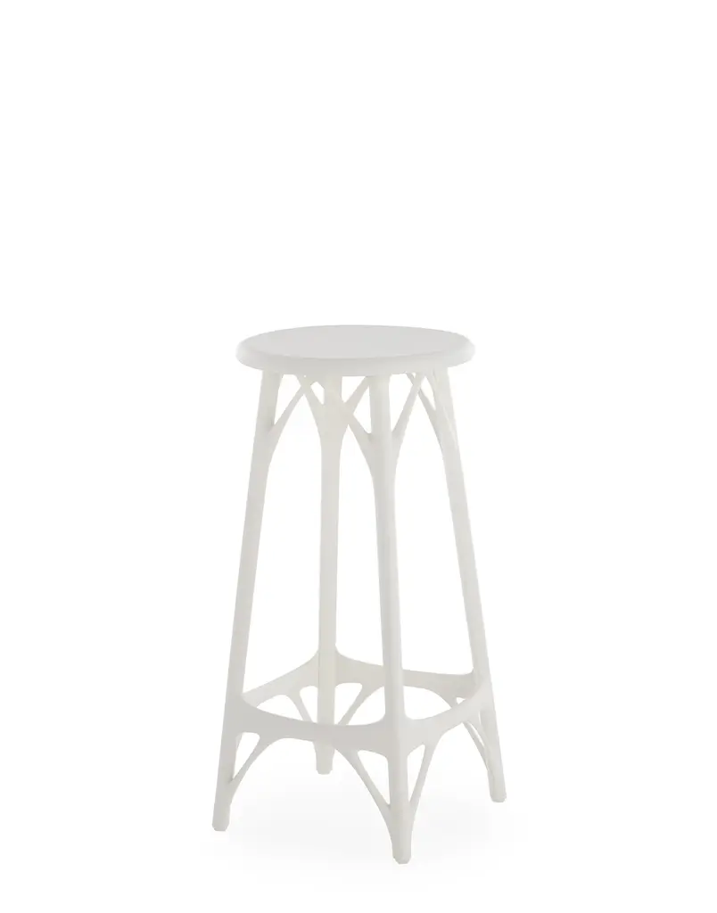 A stool made from recycled material for maximum sustainability. A.I. STOOL LIGHT is sustainable in materials and production process and is the result of thorough optimisation: three models can be made from the same mould, meaning that even industrial manufacturing can adopt a green approach. The added value of A.I. lies in the fact that it is the first product family conceived by Artificial Intelligence in response to input received from the designer (Philippe Starck) and the know-how of the company (Kartell). Specifically, creative thinking, company know-how and artificial intelligence have merged to develop a chair model based on an algorithm that respects the original brief of the designer and the company a comfortable product with the structural strength and solidity required while upholding one of Kartell’s main values: to be an injection-moulded industrial product of outstanding aesthetic quality.