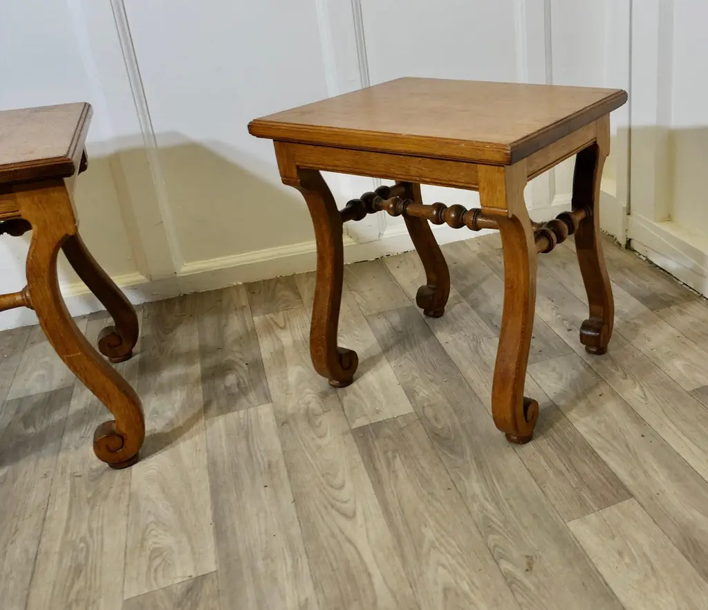 A Pair of French Arts and Crafts Oak Stools, Occasional Tables These are a delightful Pair of Golden Oak Stools from France, they have inward curling feet and beautifully turned stretchersThese are good solid stools, in good condition with a good colour and patinaThe stools are 18” high, 17” wide and 14” deepZX59