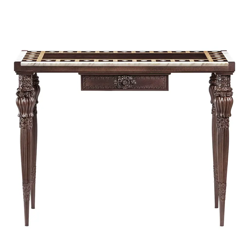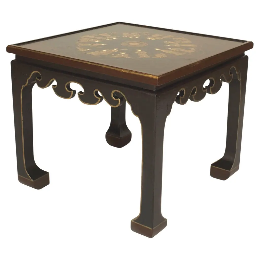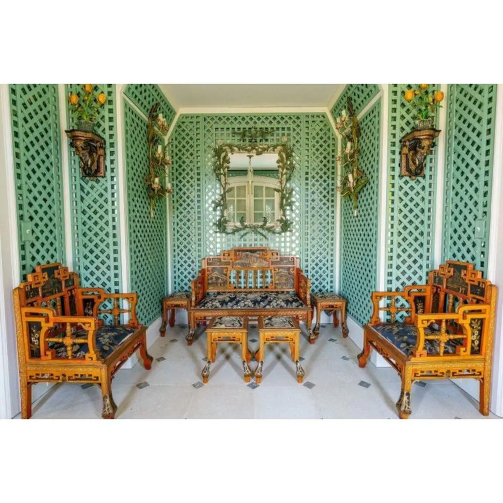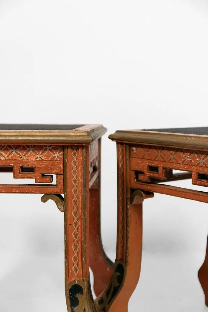 A set of four early 20th-century red-painted chinoiserie stools with hand-painted scenic panels depict idyllic pagodas and floral motifs, rendered in a rich black and gold palette that beautifully contrasts with the vibrant red frames. Intricate fretwork and pierced geometric detailing throughout the backrest, arms, and base emphasize the ornate chinoiserie style, while turned spindles add further refinement to these stunning antique stools.This set of four stools was originally part of a seven-piece salon suite, which included a pair of armchairs and a settee. The suite belonged to the collection of William L. Bernhard and Catherine Cahill, whose Southampton, New York estate reflected their passion for elegant and historic design. Catherine Cahill, the daughter of prominent attorney John T. Cahill, was a noted animal rights activist. William L. Bernhard, a philanthropist and descendant of the Lehman banking family, is recognized for his involvement in the arts and cultural institutions.Pricing reflects individual pieces.