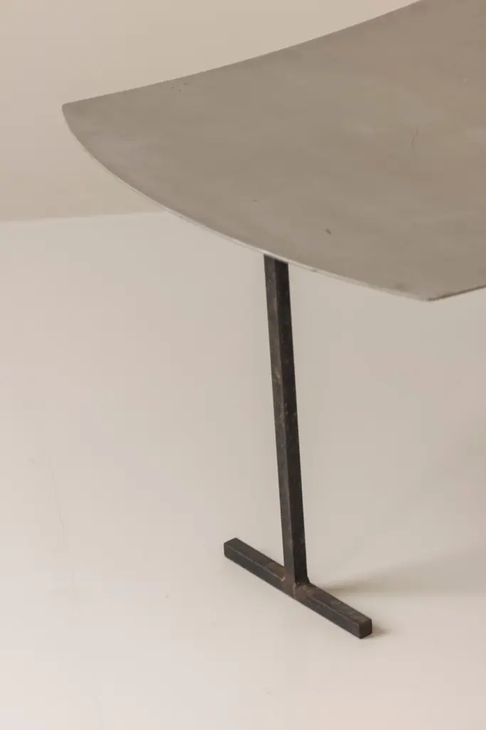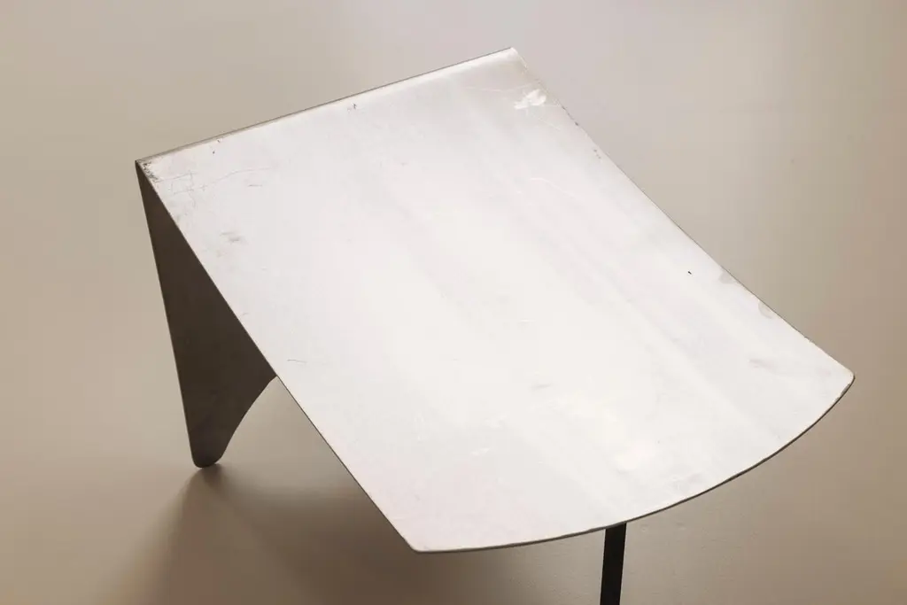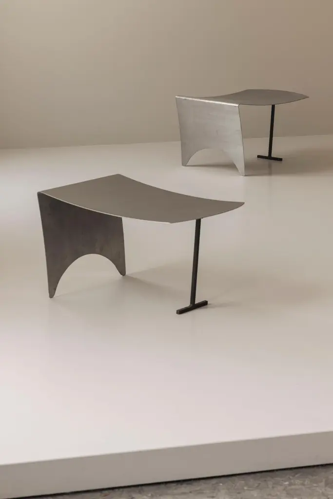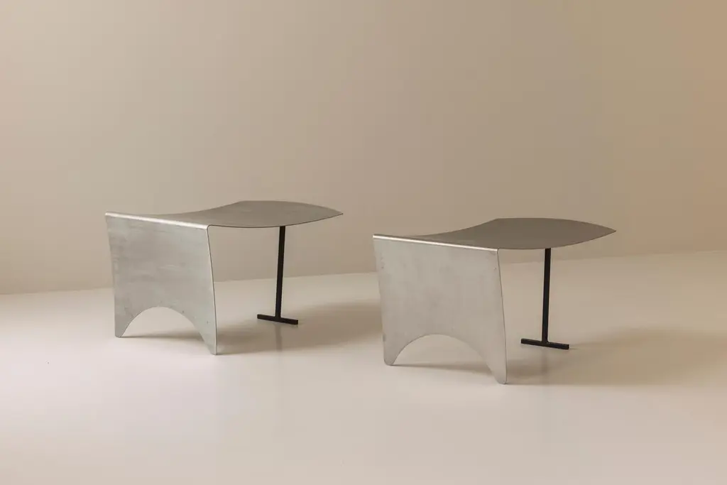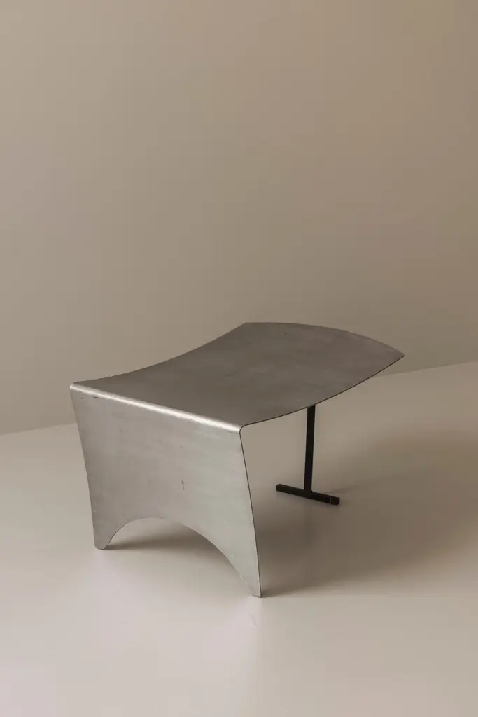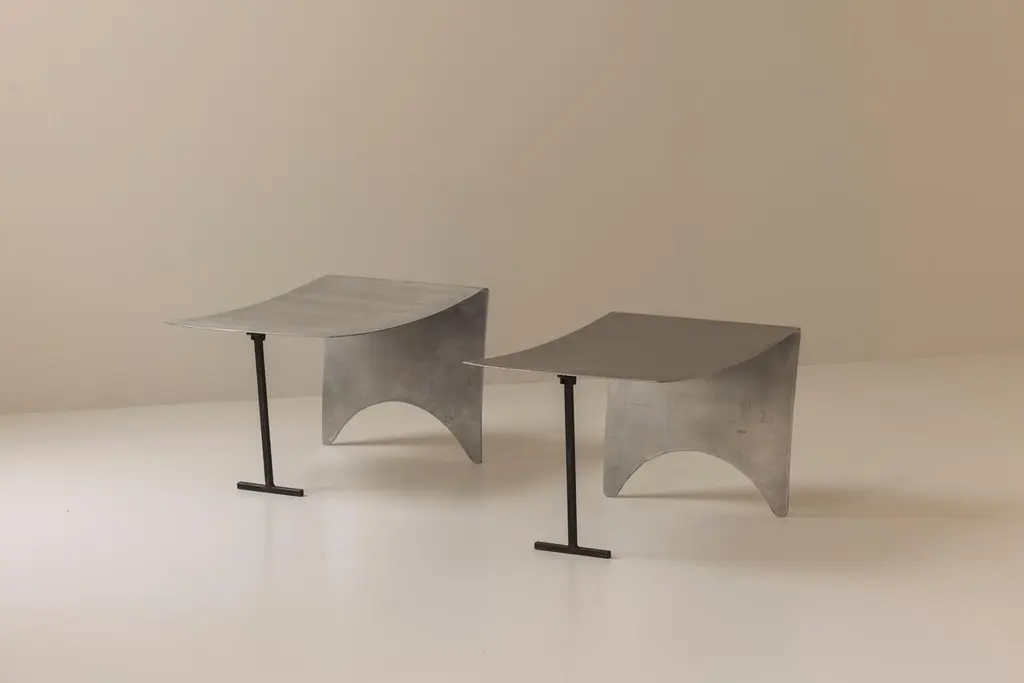 A striking set of four metal stools from France, dating to the 1980s, and embodying the bold, industrial spirit of the decade’s avant-garde design. Each stool is formed from curved sheet metal, supported by minimalist welded legs, creating a dynamic interplay between balance, tension, and negative space. Their sculptural silhouettes are as much art objects as they are functional seating, making them perfectly suited for both modern interiors and curated gallery-style environments. The raw, unfinished metal surfaces celebrate the material’s inherent texture, giving each piece a unique patina. Priced and sold per piece.