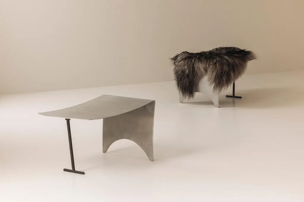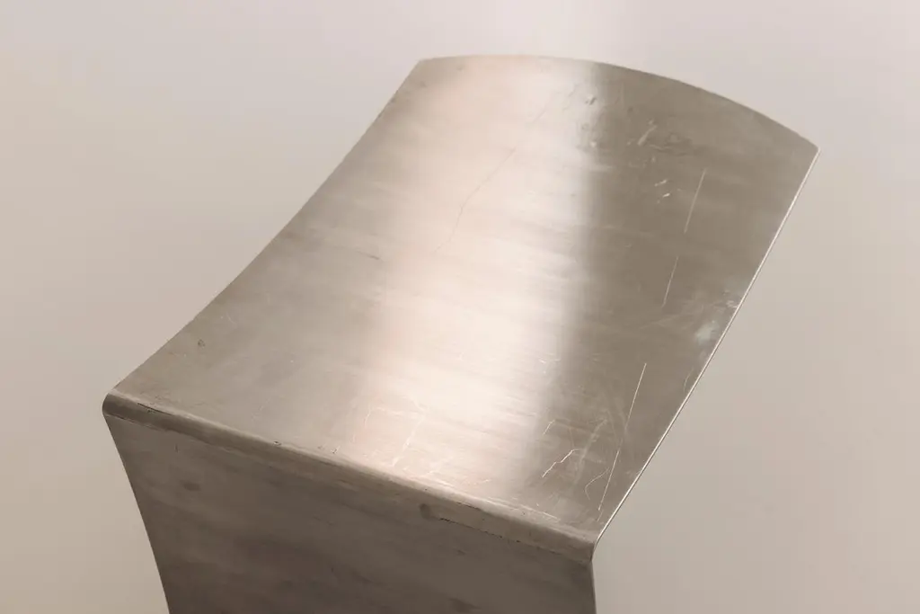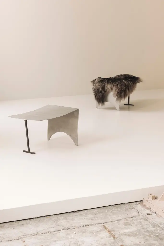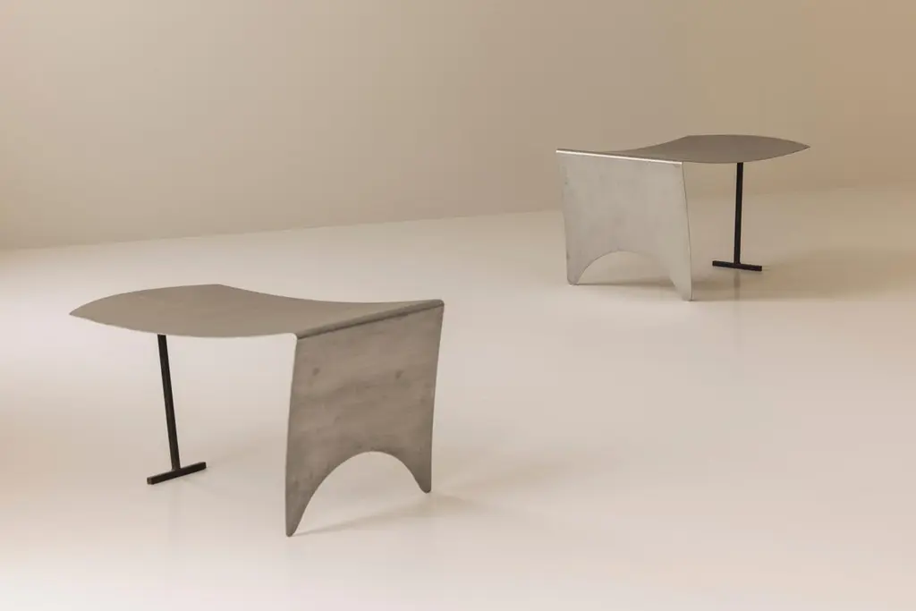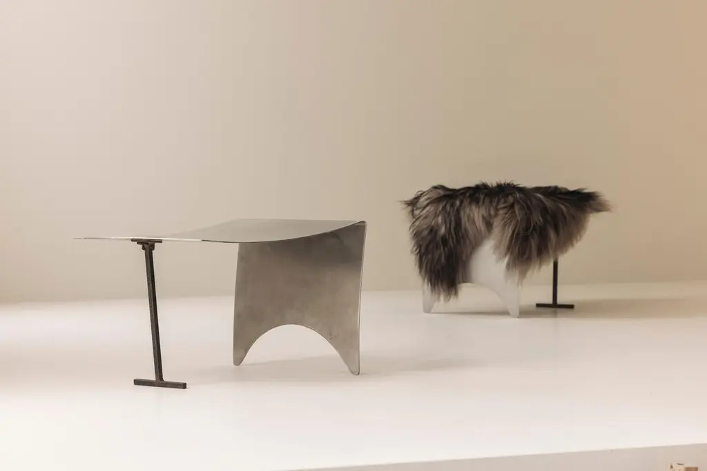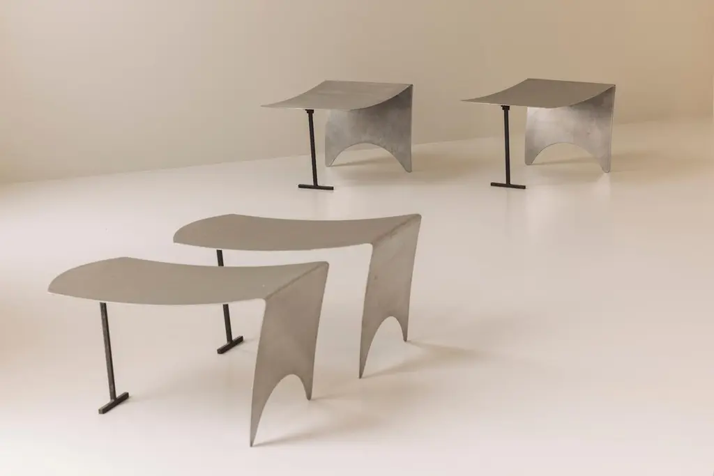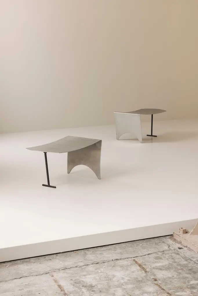 A striking set of four metal stools from France, dating to the 1980s, and embodying the bold, industrial spirit of the decade’s avant-garde design. Each stool is formed from curved sheet metal, supported by minimalist welded legs, creating a dynamic interplay between balance, tension, and negative space. Their sculptural silhouettes are as much art objects as they are functional seating, making them perfectly suited for both modern interiors and curated gallery-style environments. The raw, unfinished metal surfaces celebrate the material’s inherent texture, giving each piece a unique patina. Priced and sold per piece.