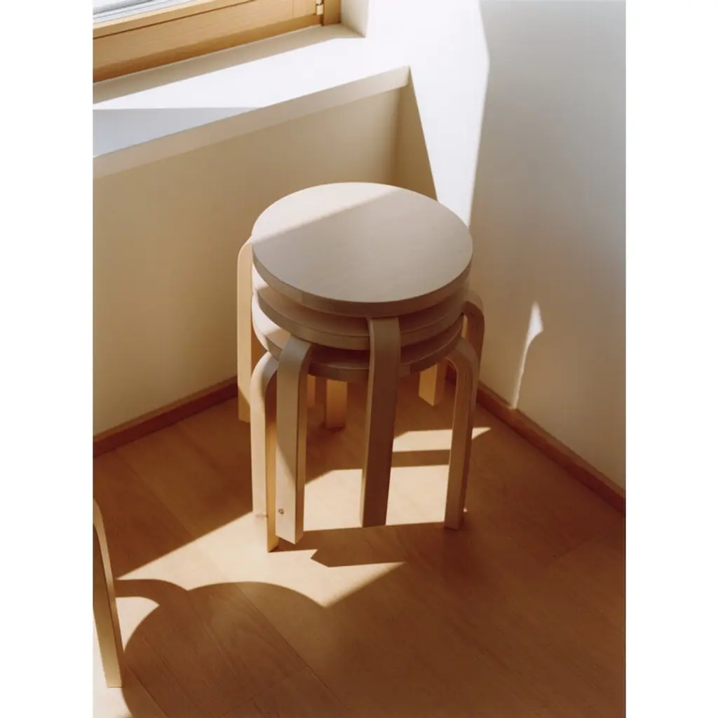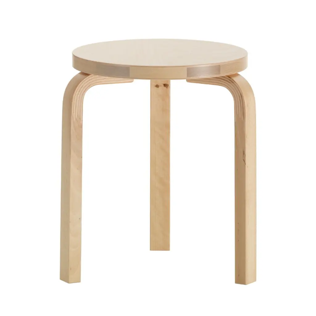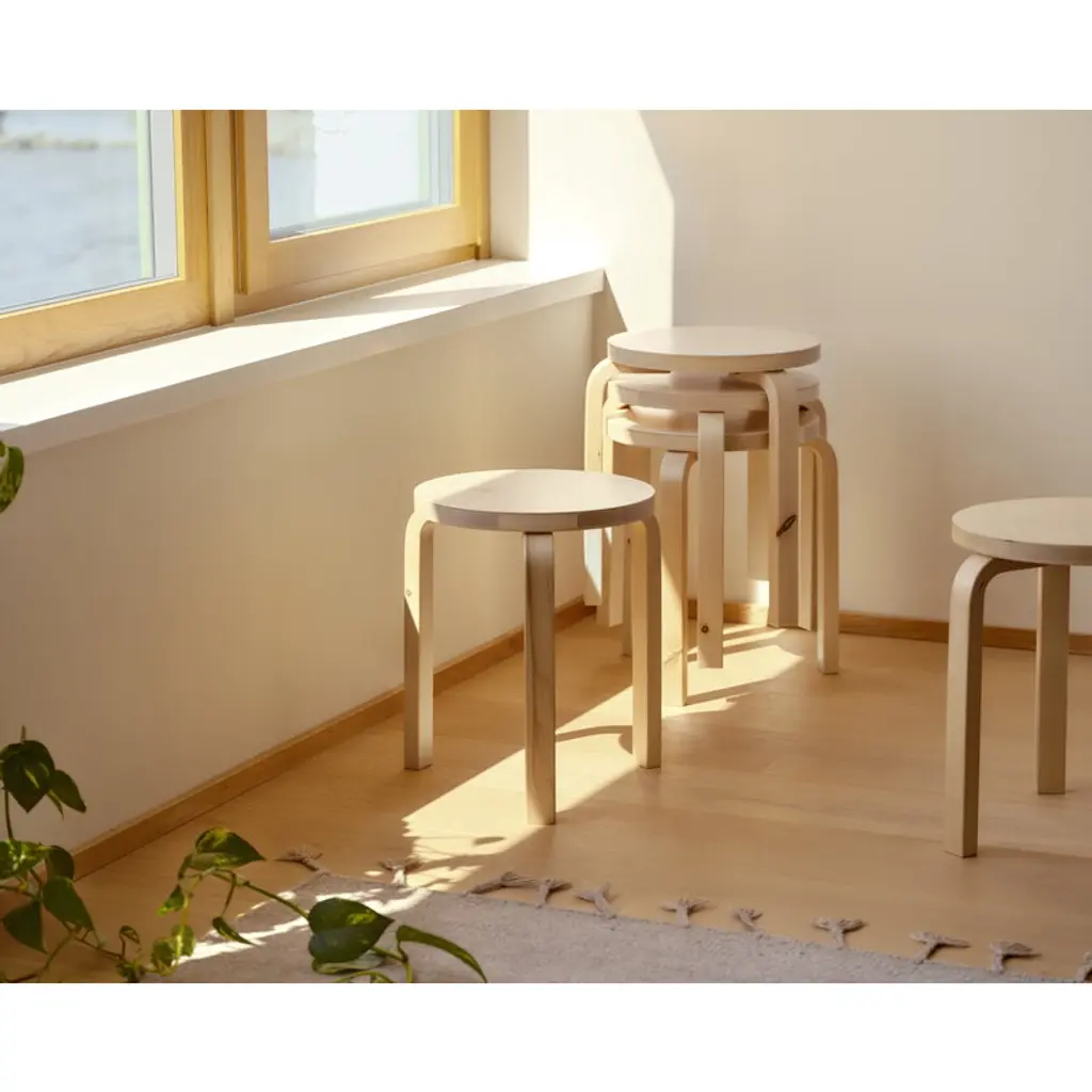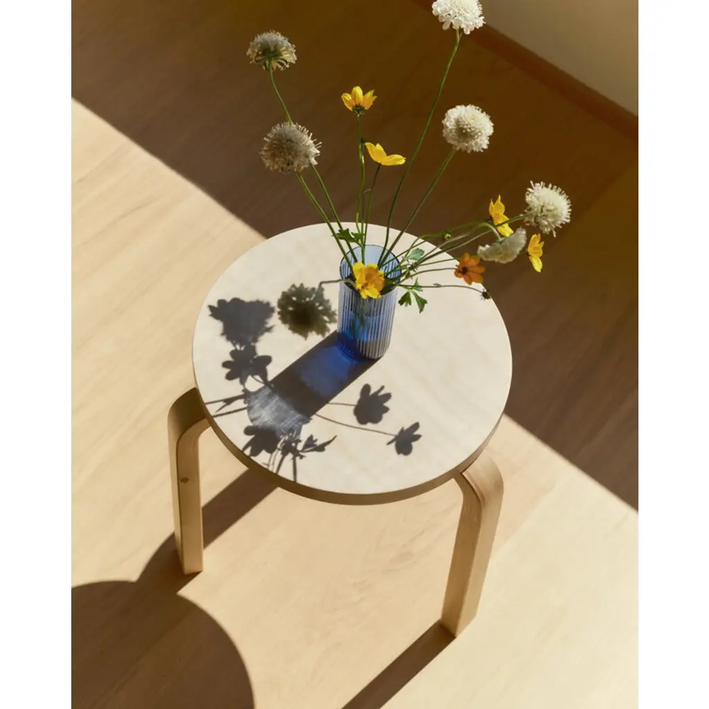 Artek's Stool 60 celebrates the authentic beauty of birch wood: this stool is made of so-called wild birch that shows the material's natural variation in its entirety. The surface might have visible knots, marks or darker heartwood. In this three-legged stool, both the legs and the veneered seat are crafted from wild birch. The stool is made in Finland. By using "wild birch", Artek wishes to challenge our expectations of visual uniformity in natural materials and to spark conversation about the need for a new, more sustainable esthetic. Due to climate change, Finnish wood nowadays has more color variations than before, as well as marks left by insects previously unseen in Finnish forests. These marks or knots do not affect the durability or usability of the wood but are only esthetic limitations. First introduced in 1933, the Aalto stool caused quite a sensation in the design world of its time due to its revolutionary L-leg structure. To bend the leg of Aalto’s stool, a piece of straight, solid birch is sawn open at the end in the direction of the fibers, forming the shape of a fan, with thin pieces of plywood then glued in the grooves. This structure makes it possible to bend the wood by heating or steaming it at the desired angle and when dry, it will have a very strong structure that can be easily attached to the seat.
