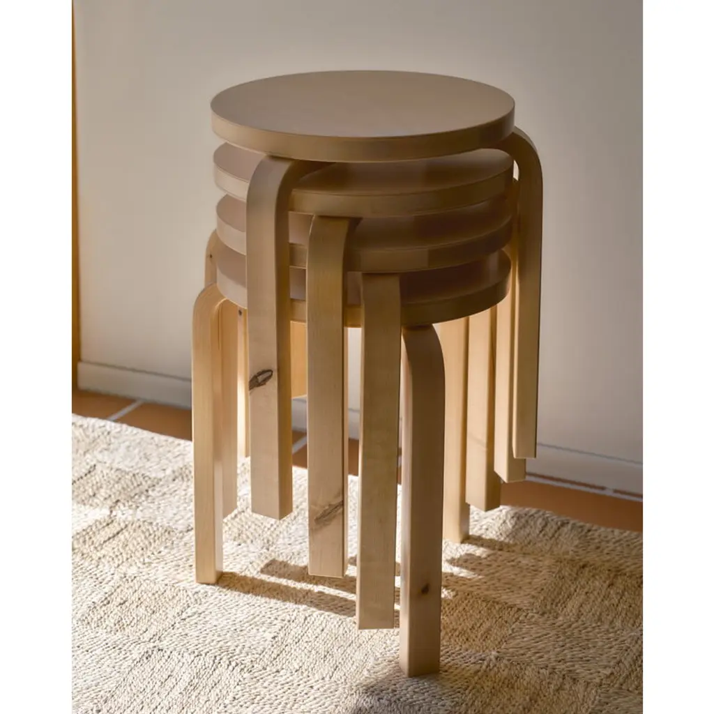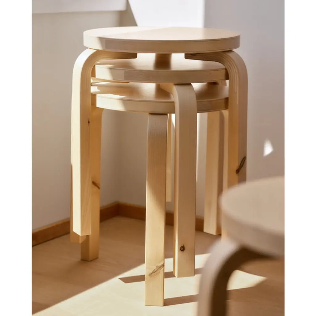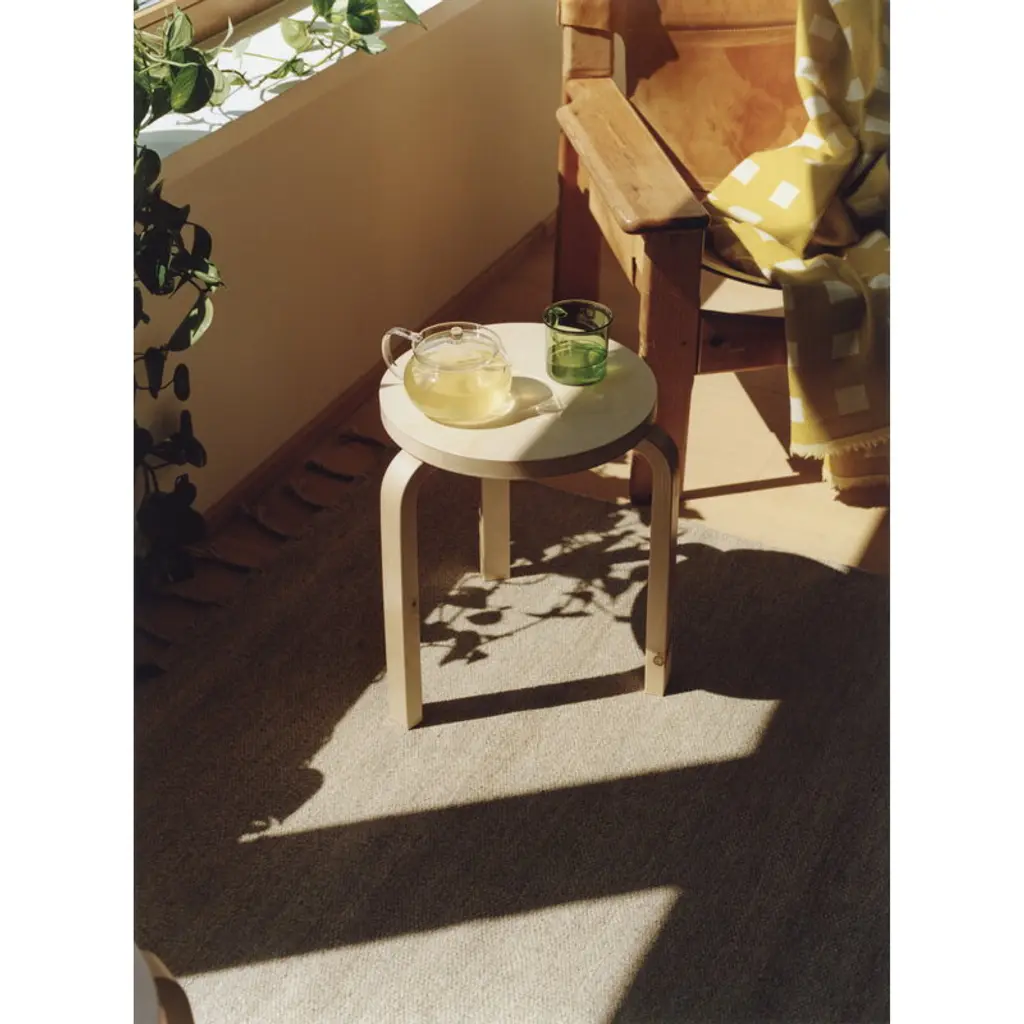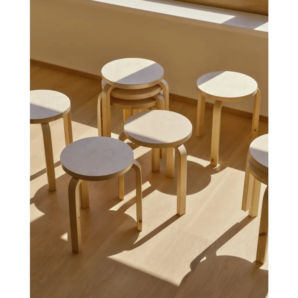 Artek's Stool 60 celebrates the authentic beauty of birch wood: this stool is made of so-called wild birch that shows the material's natural variation in its entirety. The surface might have visible knots, marks or darker heartwood. In this three-legged stool, both the legs and the veneered seat are crafted from wild birch. The stool is made in Finland. By using "wild birch", Artek wishes to challenge our expectations of visual uniformity in natural materials and to spark conversation about the need for a new, more sustainable esthetic. Due to climate change, Finnish wood nowadays has more color variations than before, as well as marks left by insects previously unseen in Finnish forests. These marks or knots do not affect the durability or usability of the wood but are only esthetic limitations. First introduced in 1933, the Aalto stool caused quite a sensation in the design world of its time due to its revolutionary L-leg structure. To bend the leg of Aalto’s stool, a piece of straight, solid birch is sawn open at the end in the direction of the fibers, forming the shape of a fan, with thin pieces of plywood then glued in the grooves. This structure makes it possible to bend the wood by heating or steaming it at the desired angle and when dry, it will have a very strong structure that can be easily attached to the seat.
