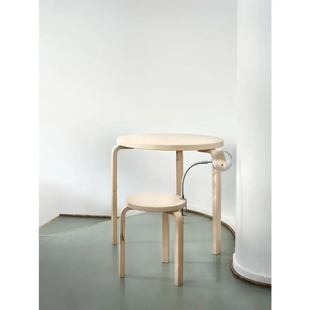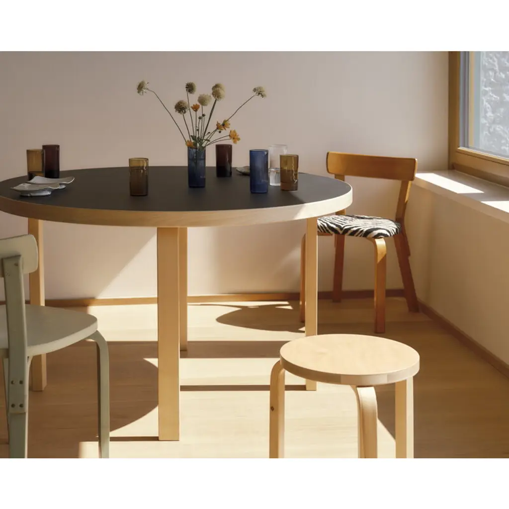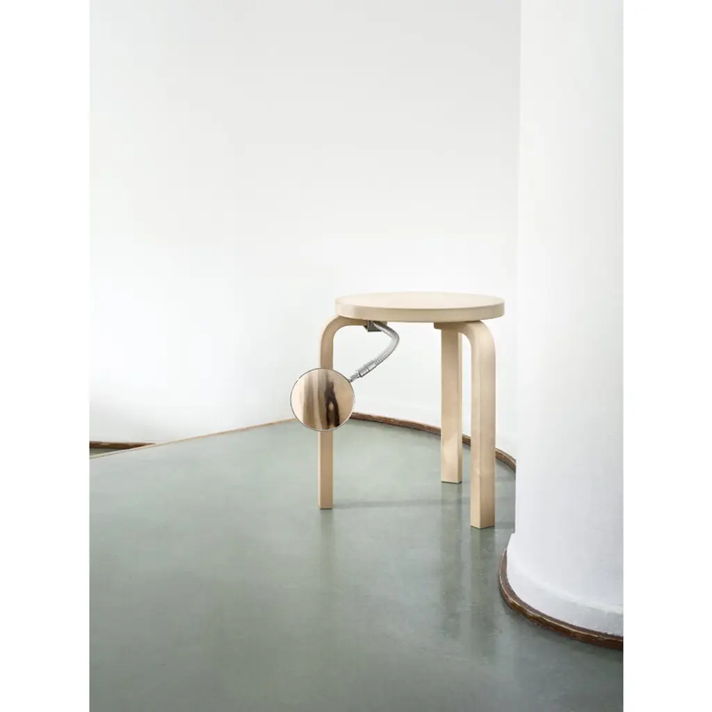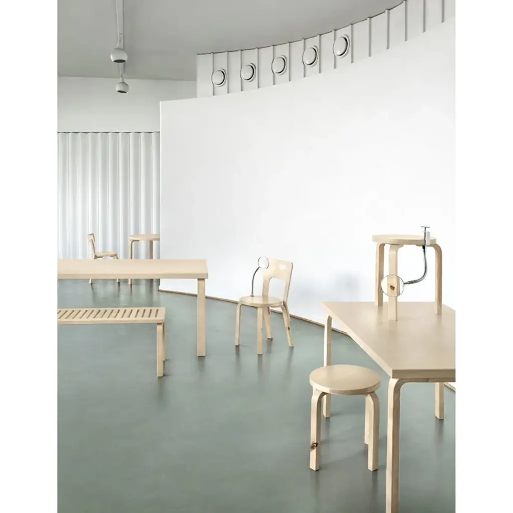 Artek's Stool 60 celebrates the authentic beauty of birch wood: this stool is made of so-called wild birch that shows the material's natural variation in its entirety. The surface might have visible knots, marks or darker heartwood. In this three-legged stool, both the legs and the veneered seat are crafted from wild birch. The stool is made in Finland. By using "wild birch", Artek wishes to challenge our expectations of visual uniformity in natural materials and to spark conversation about the need for a new, more sustainable esthetic. Due to climate change, Finnish wood nowadays has more color variations than before, as well as marks left by insects previously unseen in Finnish forests. These marks or knots do not affect the durability or usability of the wood but are only esthetic limitations. First introduced in 1933, the Aalto stool caused quite a sensation in the design world of its time due to its revolutionary L-leg structure. To bend the leg of Aalto’s stool, a piece of straight, solid birch is sawn open at the end in the direction of the fibers, forming the shape of a fan, with thin pieces of plywood then glued in the grooves. This structure makes it possible to bend the wood by heating or steaming it at the desired angle and when dry, it will have a very strong structure that can be easily attached to the seat.
