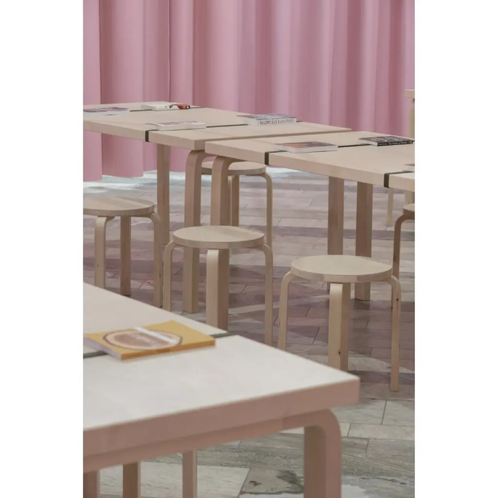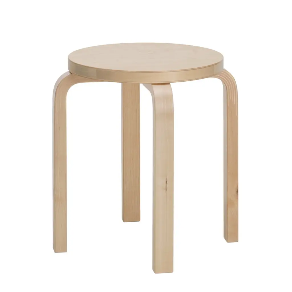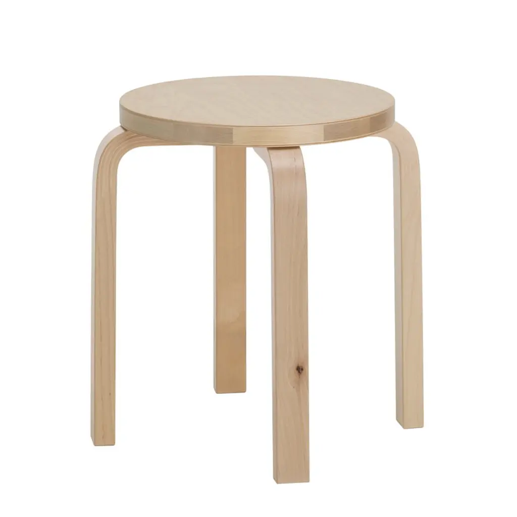 Artek's Stool E60 celebrates the authentic beauty of birch wood: this stool is made of so-called wild birch that shows the material's natural variation in its entirety. The surface might have visible knots, marks or darker heartwood. In this four-legged stool, both the legs and the veneered seat are crafted from wild birch. The stool is made in Finland. By using "wild birch", Artek wishes to challenge our expectations of visual uniformity in natural materials and to spark conversation about the need for a new, more sustainable esthetic. Due to climate change, Finnish wood nowadays has more color variations than before, as well as marks left by insects previously unseen in Finnish forests. These marks or knots do not affect the durability or usability of the wood but are only esthetic limitations. First introduced in 1933, the Aalto stool caused quite a sensation in the design world of its time due to its revolutionary L-leg structure. To bend the leg of Aalto’s stool, a piece of straight, solid birch is sawn open at the end in the direction of the fibers, forming the shape of a fan, with thin pieces of plywood then glued in the grooves. This structure makes it possible to bend the wood by heating or steaming it at the desired angle and when dry, it will have a very strong structure that can be easily attached to the seat.