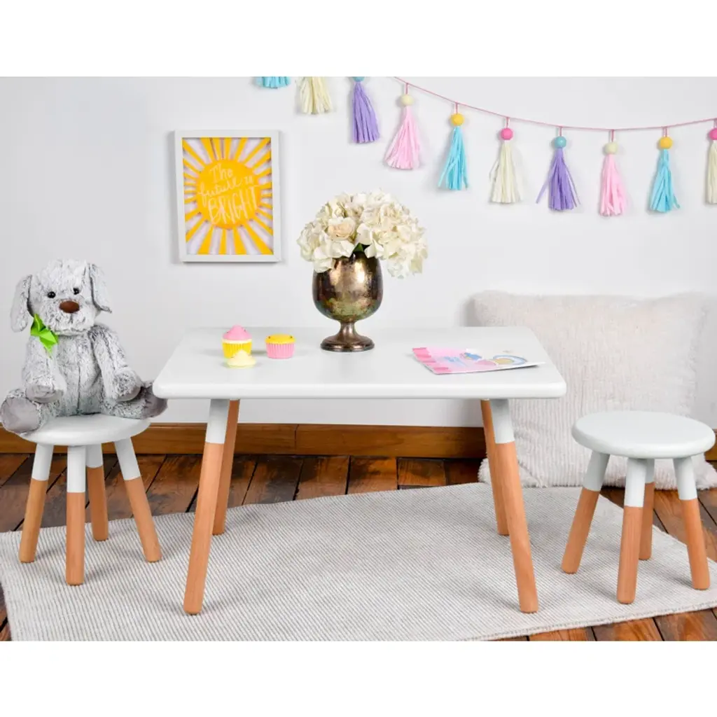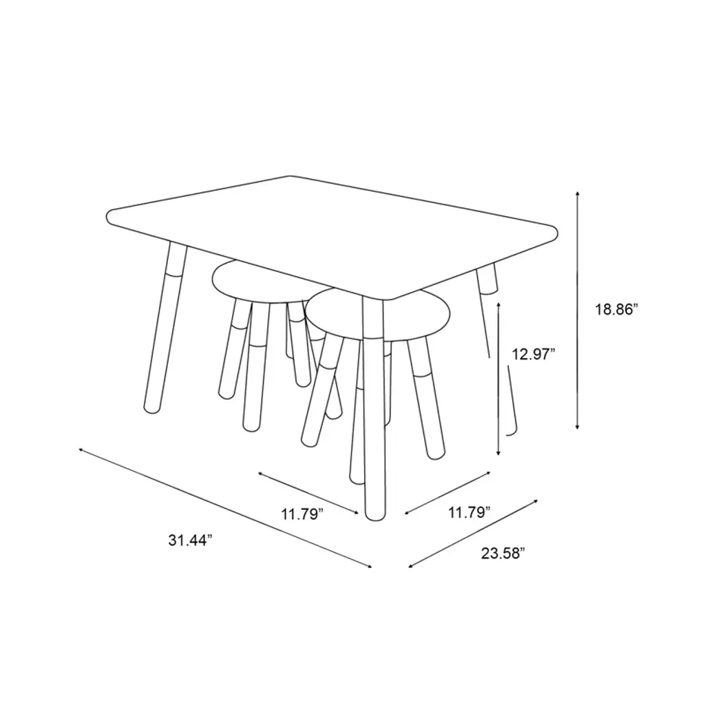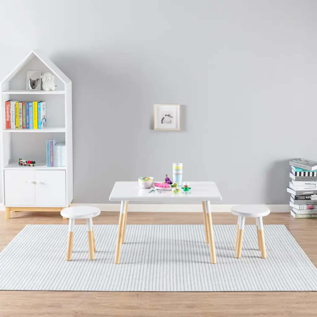 This 3-piece writing table and stool set give your little one a playful spot to draw and construct their most creative masterpieces. It comes with a table and two stools, all made from engineered wood with a two-toned matte finish that works well with any color palette. The 31.44" wide table is an ideal place for tea parties, craft time, and board games. The stool provides enough room for tiny tots up to 7 years old. Plus, we love that the scratch-resistant surface is easy to clean when little messes occur, and stands up to dings and dents.