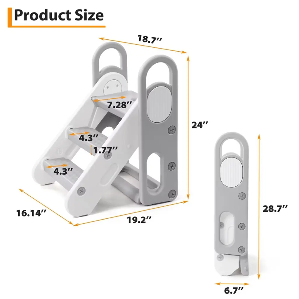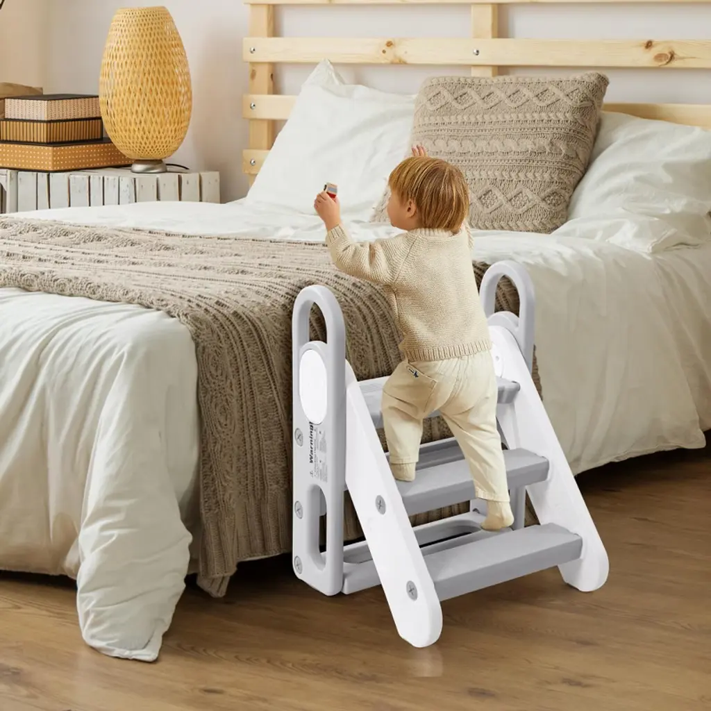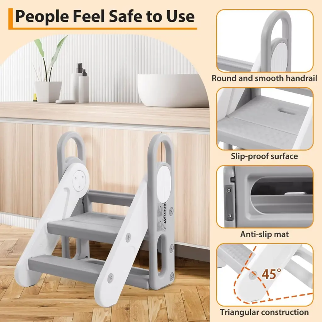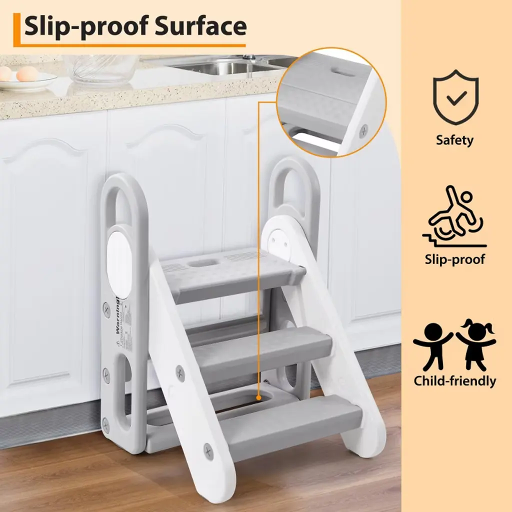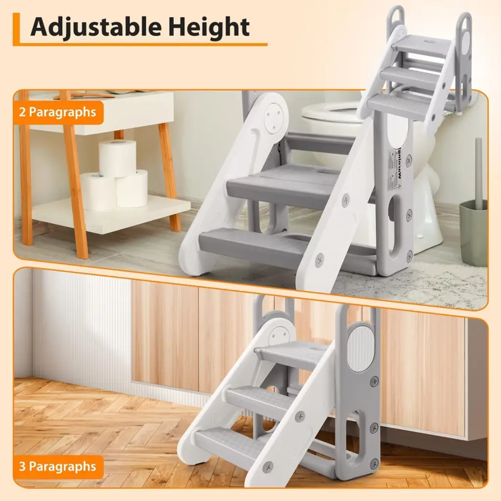 Introducing the Adjustable 3-Step Toddler Stool, the perfect solution for your little one to reach sinks, counters, and toilets safely and independently. Designed with your child's safety and comfort in mind, this foldable step stool features three adjustable steps to grow with your child and provide the perfect height every time.Crafted for versatility, this stool serves as a step ladder, kitchen stool, bathroom stool, and potty training aid. Its sturdy construction ensures stability, while anti-slip pads on each step and the base prevent slipping on smooth surfaces, giving you peace of mind.The built-in handles make it easy for kids to climb up and down confidently, promotingand self-reliance. When not in use, the stool folds flat for convenient storage, saving space in your kitchen or bathroom.Key Features:- Adjustable 3-step design grows with your child for long-term use- Foldable for easy storage and portability- Anti-slip pads on steps and base for maximum safety- Sturdy and durable construction supports toddlers securely- Built-in handles for easy climbing and added stability- Multi-purpose use: kitchen counter, bathroom sink, potty trainingMake everyday tasks easier and safer for your toddler with this versatile, adjustable step stool. Whether reaching the sink to wash hands or brushing teeth, this stool provides the perfect boost with safety and convenience in mind. Invest in a reliable, space-saving step stool that supports your child'sand safety at home.