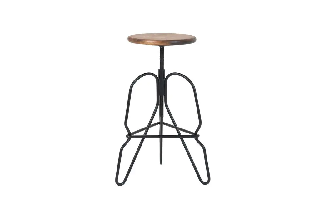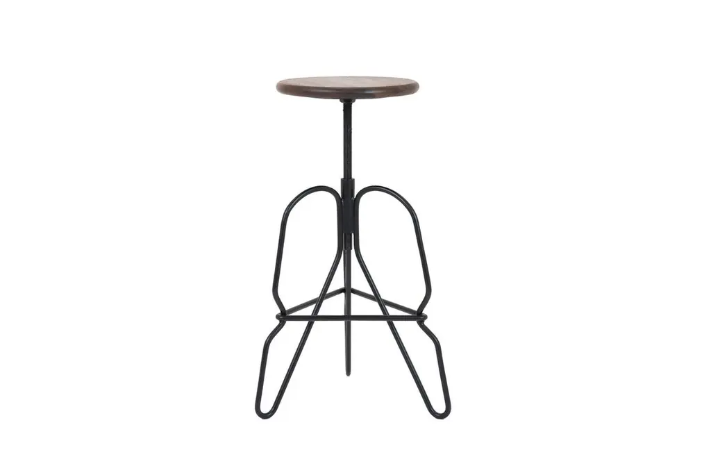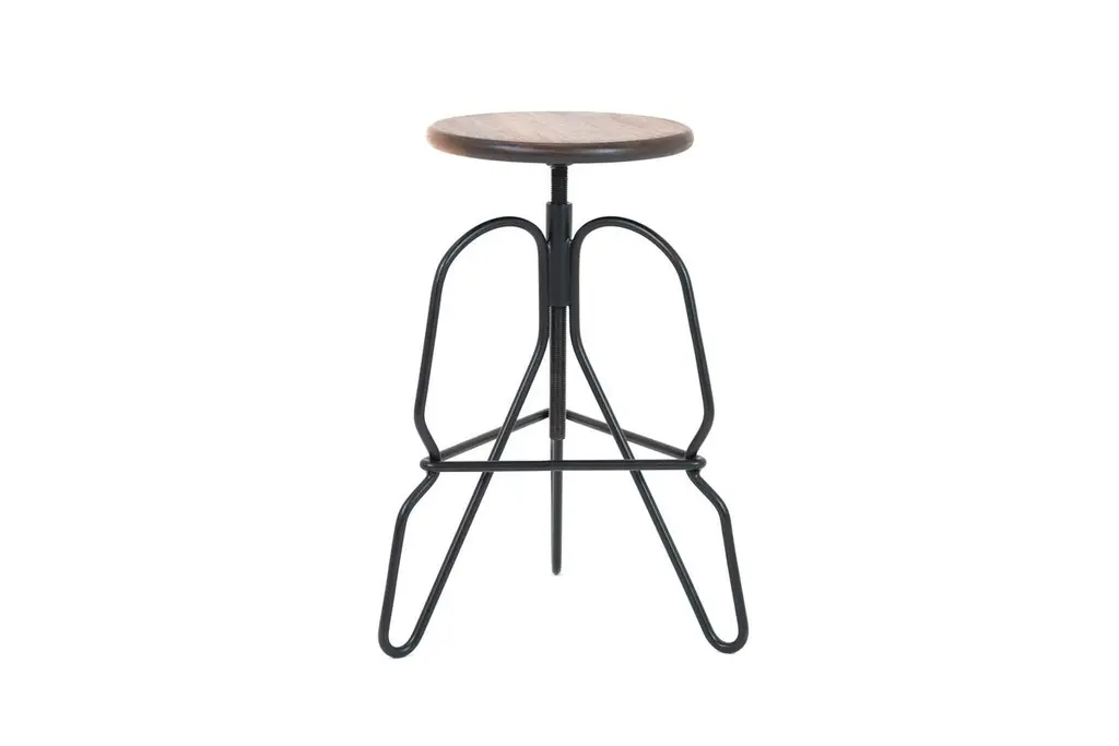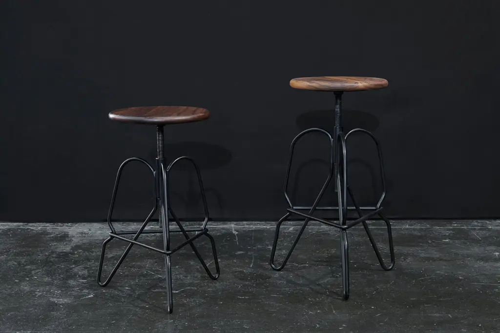 The rig stool is a minimal solid steel stool featuring an adjustable solid wood seat on a threaded rod. The legs are tied together with a triangular brace that serves as a footrest. This handcrafted piece is hand-oiled using our in-house oils and techniques and black-powder coated steel.
