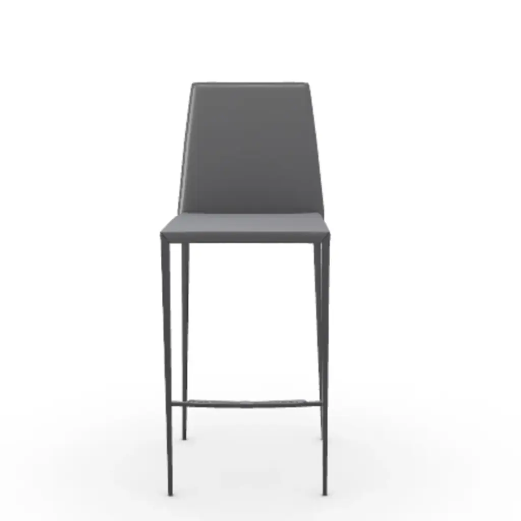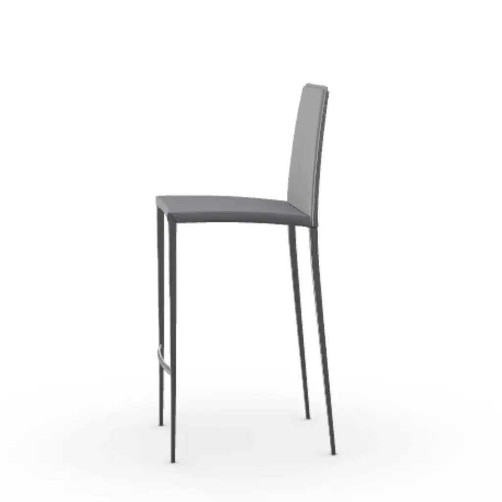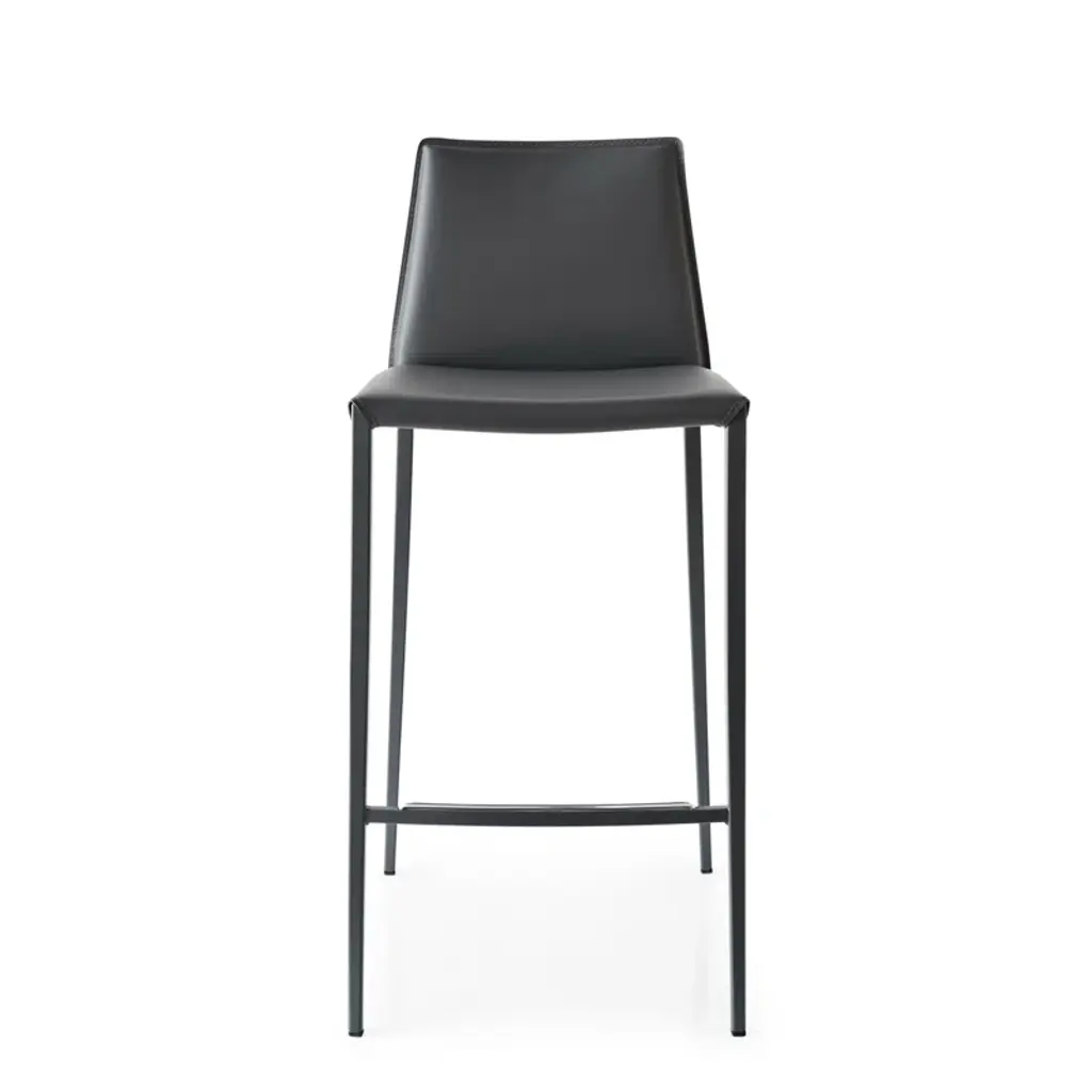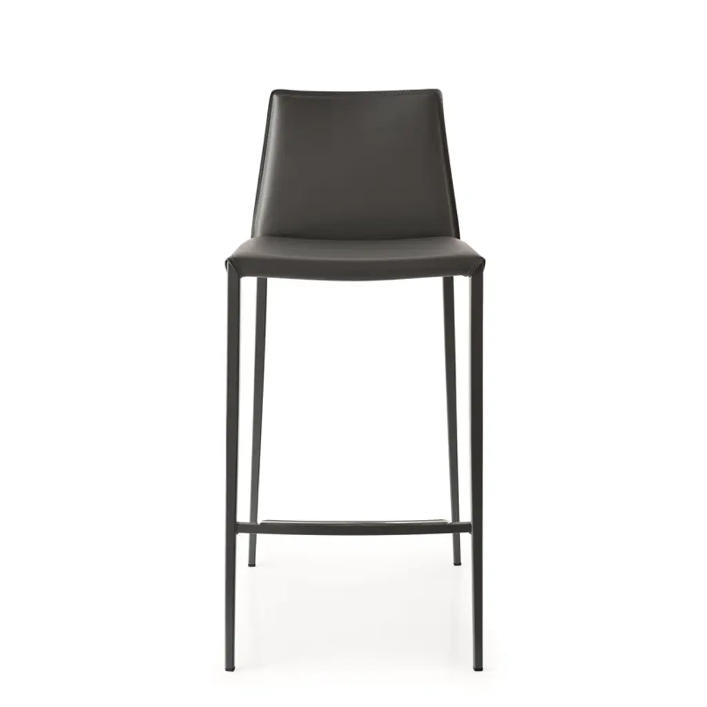 An upholstered stool with an upholstered seat covered in regenerated leather. With its refined minimalism, the upholstered stool features a streamlined design. The 4 legs, thin but resistant, are made of coated metal in the same finish as the seat, a detail of great aesthetic value. A stool brings elegance to a bar area.