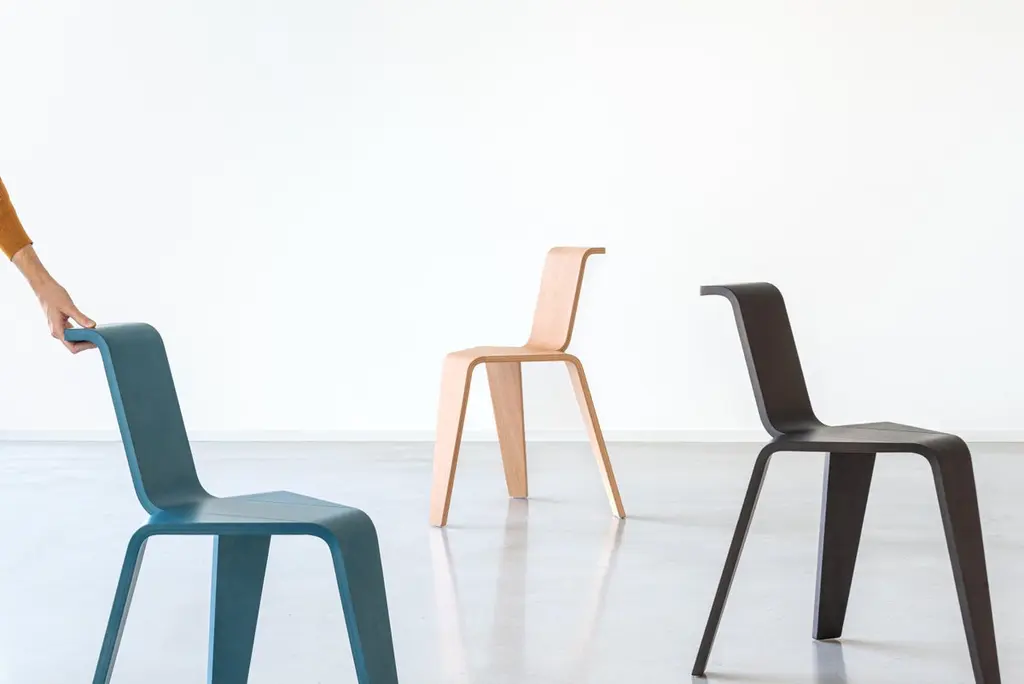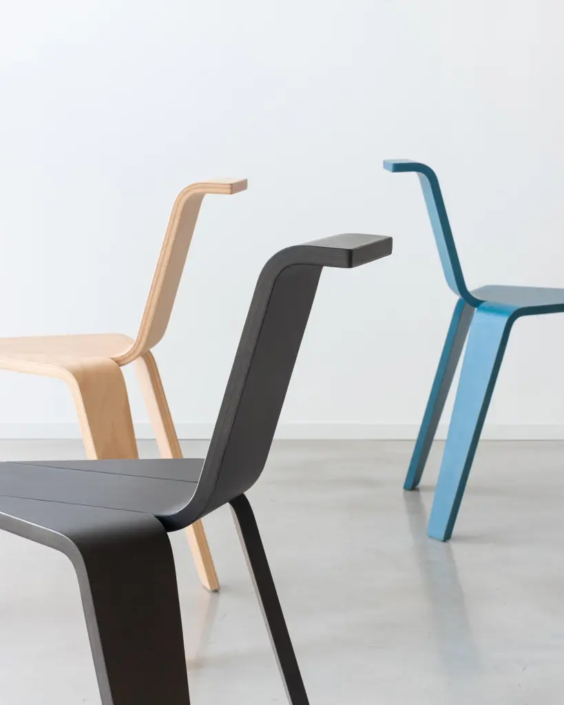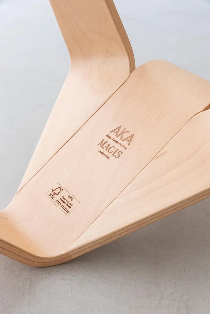 Part chair, part stool, part sculpture: this is AKA.Also Known As... stool, AKA showcases the designer’s great furniture-making exper- tise and his absolute drive for sustainability. Once again, Grcic’s humanistic approach to design is paired with a formal rigour to give us a simple object that interprets the fundamentals of design with intelligence and a hint of irony.Its beauty lies in the details: three pieces of beech plywood are merging rigourous geometry with elegant curves. The two outer sections fit into the notches of the central element in a clean, refined way. The exposed wood grain adds a touch of familiarity to the object. AKA, with its three colour variations, adds character and versatility to a diversity of situations in private and public.