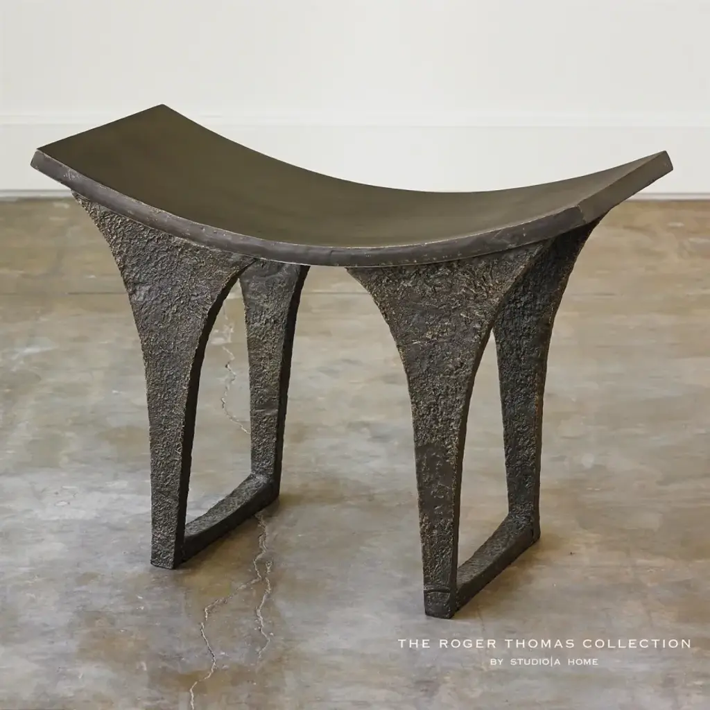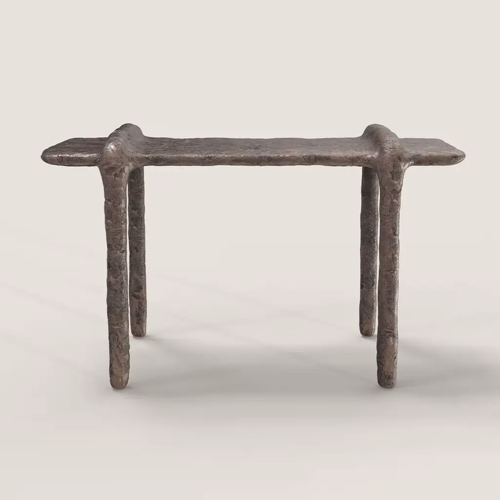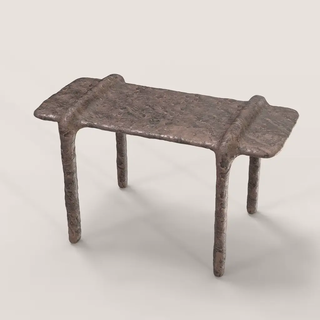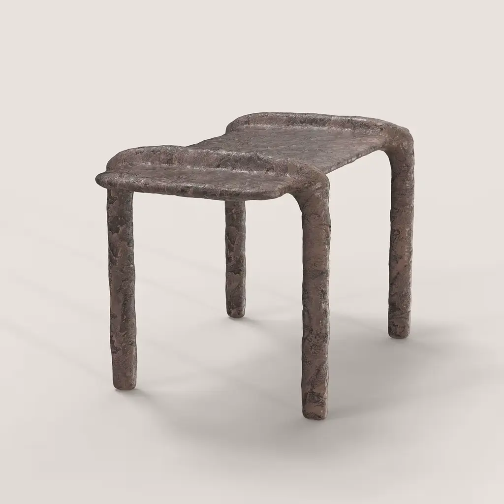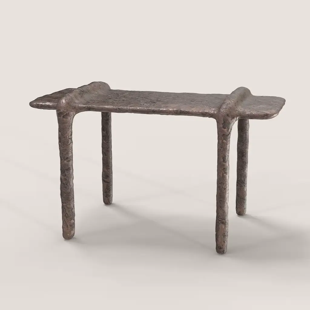 Ala V1 is a side table/stool made of cast bronze. Ala is a 21st Century collection of tables made by Italian artisans in casted bronze with a material surface. It is part of the collectible design language Ala that has been developed by Edizione Limitata’s art research team in Milan. The special formal solution of joining the top and legs characterizes the Ala collection, an unexpected movement of forms that shows the structural strain of the material. Limited edition of 150.